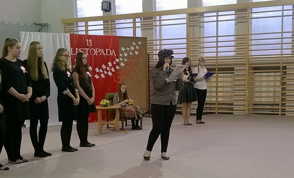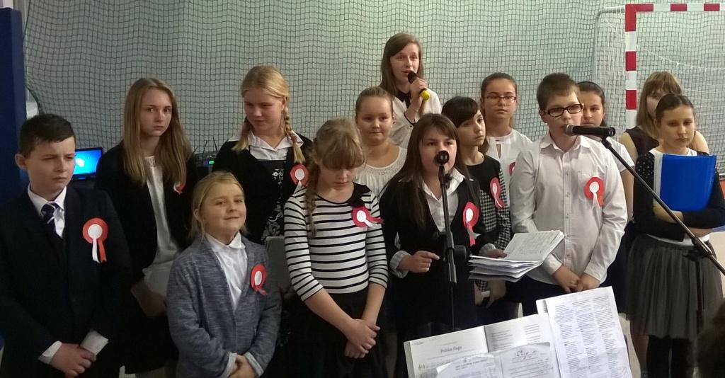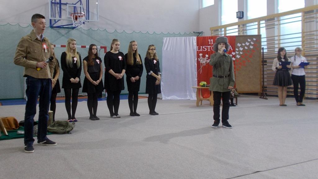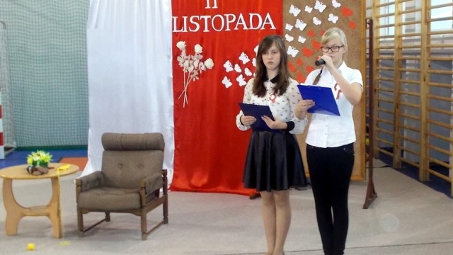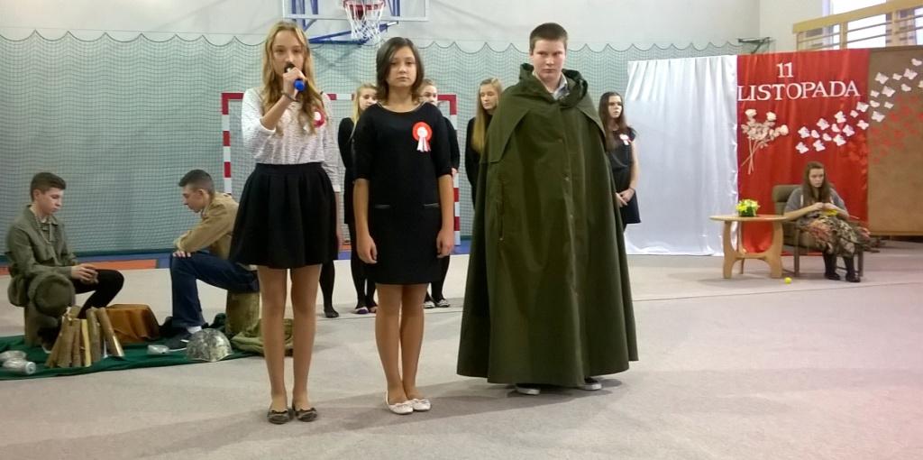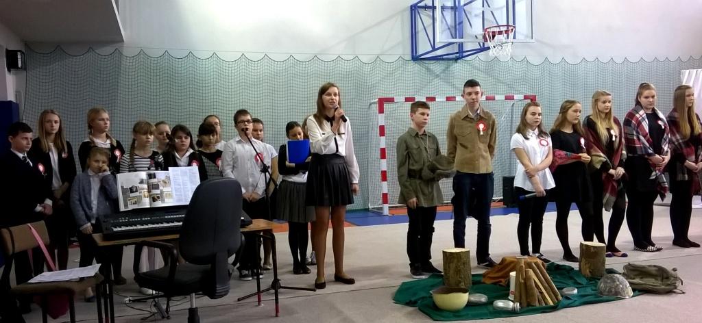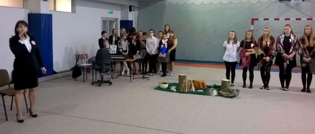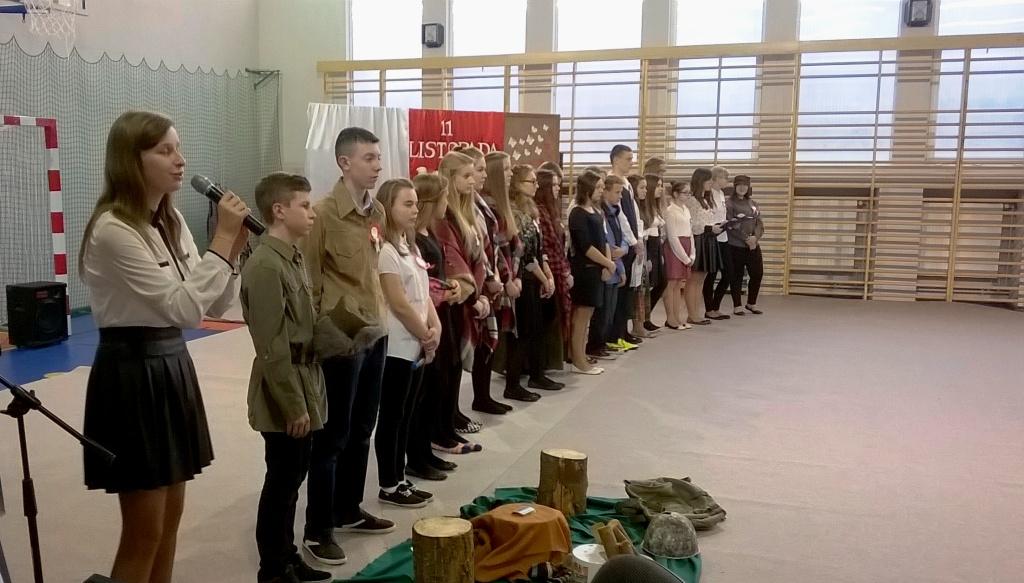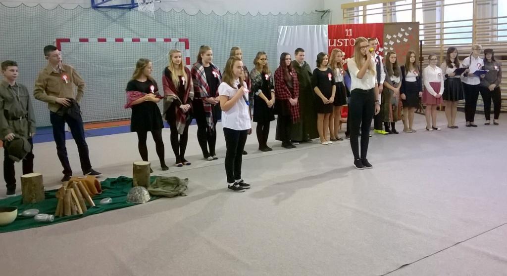We środę, 11 listopada 2015 roku, w całej Polsce, przy udziale najwyższych władz państwowych w Warszawie oraz samorządowych w mniejszych miastach, odbywały się uroczyste obchody dziewięćdziesiątej siódmej rocznicy odzyskania niepodległości przez naszą Ojczyznę. Jak co roku tę ważną, historyczną rocznicę uczciliśmy także w naszej szkole. Patriotyczną akademią przygotowała pani Dorota Zalewska z młodzieżą gimnazjalną oraz pani Ewa Dębko z Zespołem Muzycznym. Montaż słowno-muzyczny nie tylko przypomniał historię naszego kraju z czasów, gdy na 123 lata zniknęliśmy z mapy Europu i świata, ale był też ważną lekcją patriotyzmu.