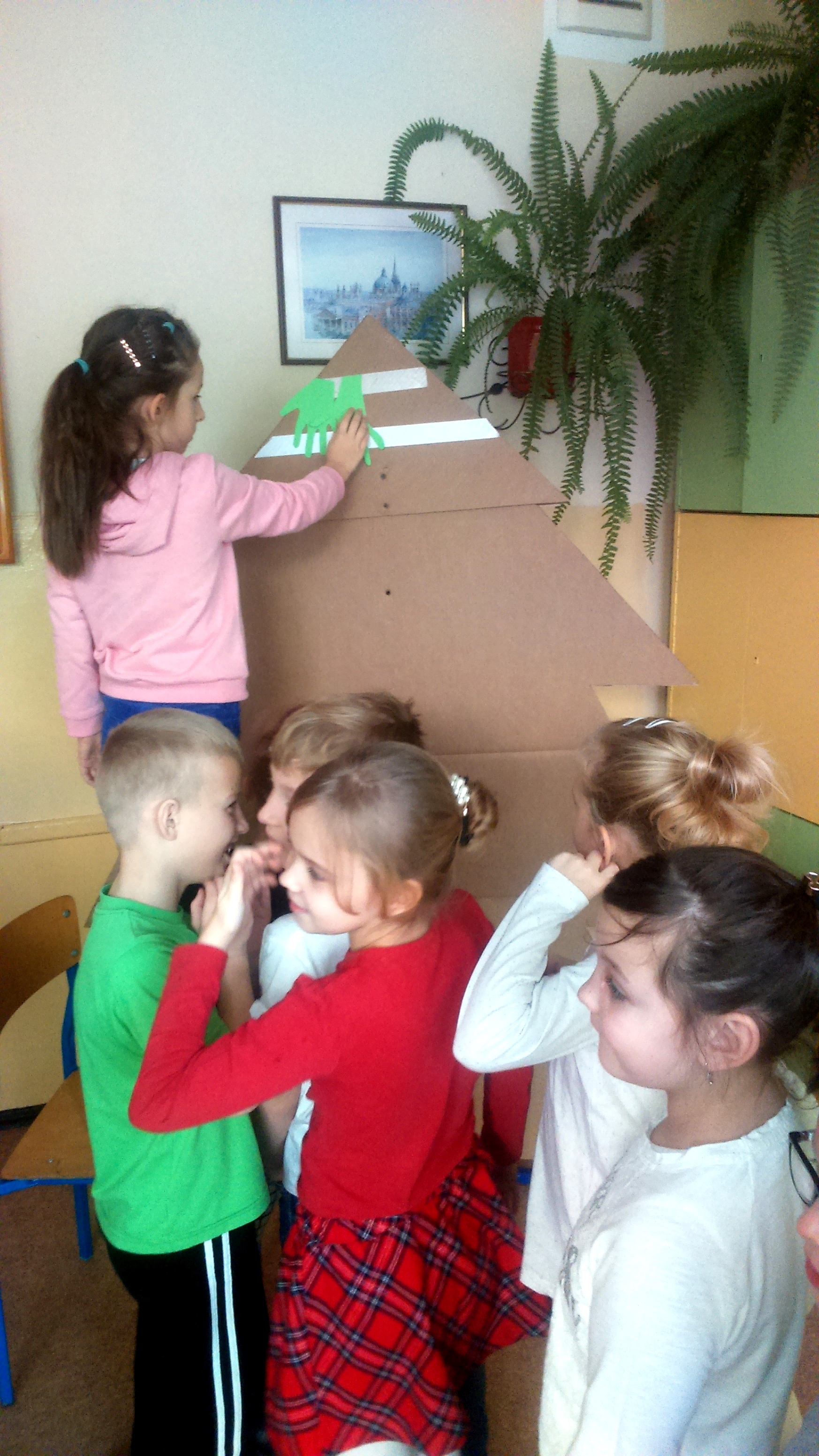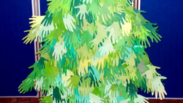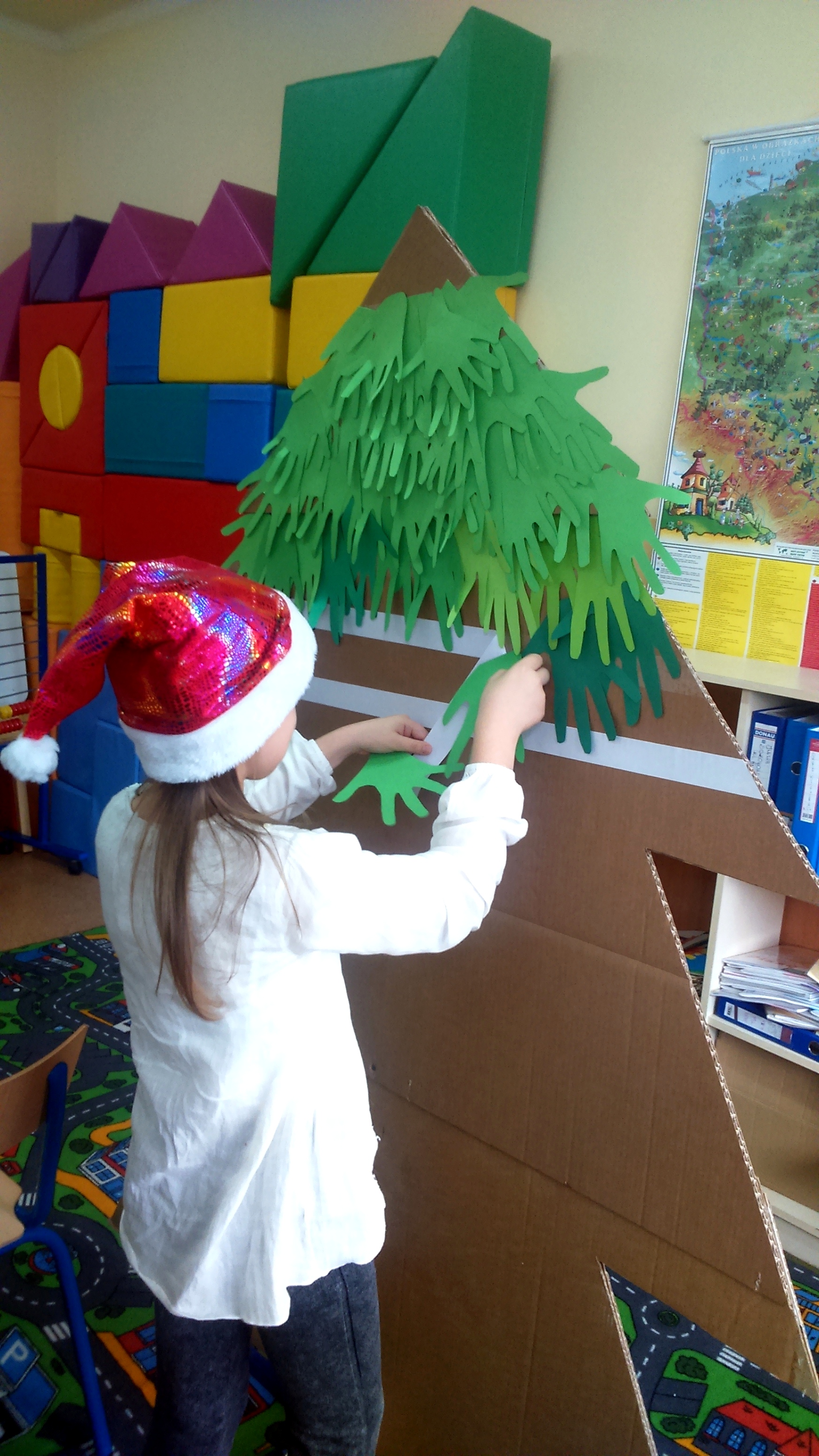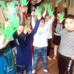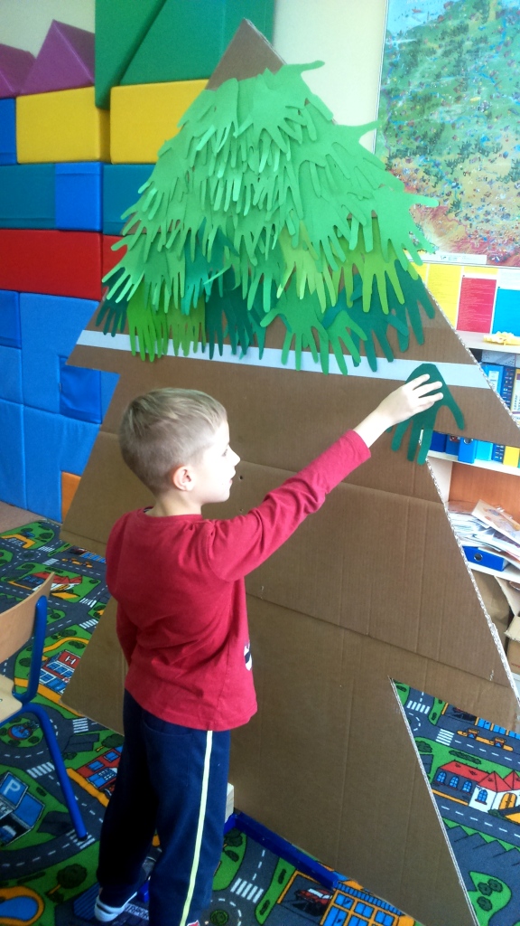 Z wyciętych dłoni powstała piękna zielona choinka, którą możemy podziwiać na holu przy pokoju nauczycielskim. Nad sprawnym przebiegiem akcji czuwała p. Katarzyna Chociej.