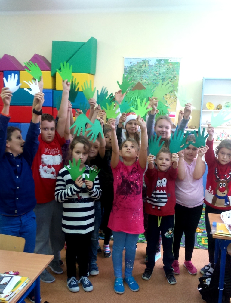 Dnia 6.12.2016r. w naszej szkole samorząd uczniowski przeprowadził akcję pod tytułem „Akcja choinka” Każda klasa miała za zadanie w jak najkrótszym czasie odrysować swoje dłonie na zielonej kartce papieru i je wyciąć. Zadanie to najszybciej wykonały klasy: