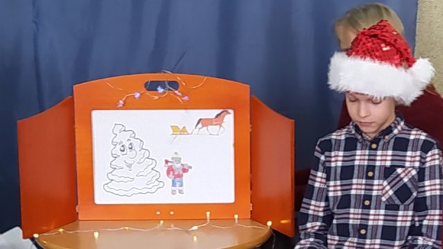 Przedświąteczny teatrzyk Kamishibai – 20 grudnia 2022 r. Klasy trzecie przygotowały dla młodszych kolegów bajkę w formie teatrzyku Kamishibai, czyli teatrzyku ilustracji. Bajka wprowadziła wszystkich w świąteczny nastrój. Opowiadała o trzech drzewach: silnym dębie, rozłożystym jesionie i kłującym świerku. Nielubiany świerk stracił nadzieję na to, że komuś będzie potrzebny. Okazało się jednak, że stał się …