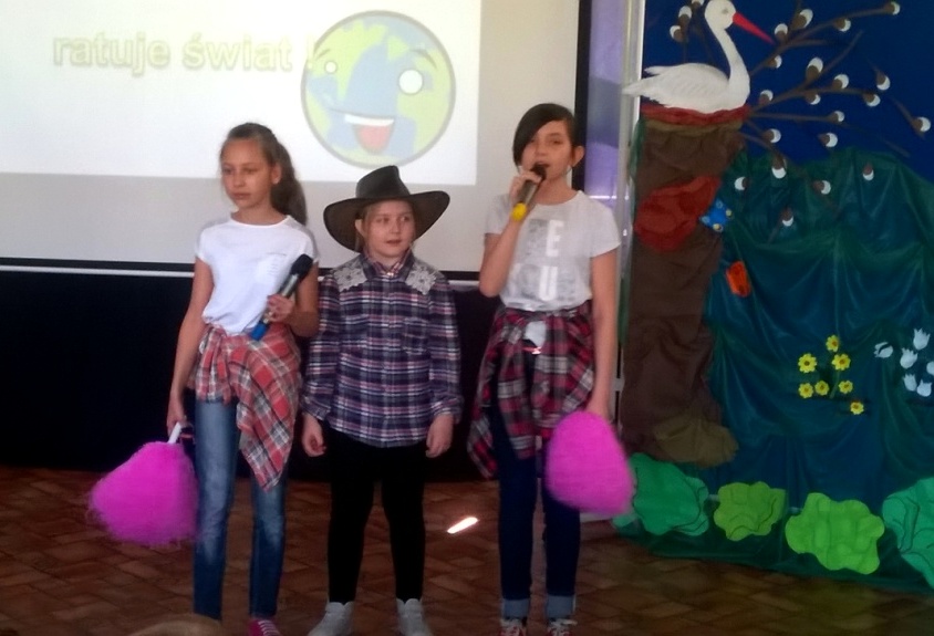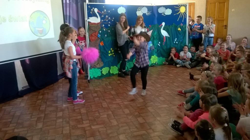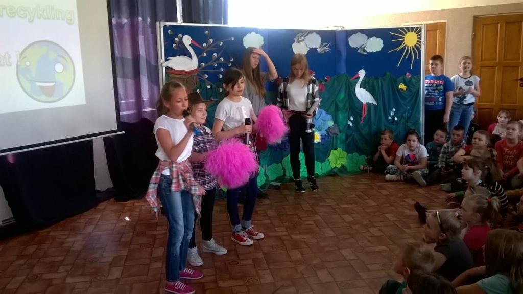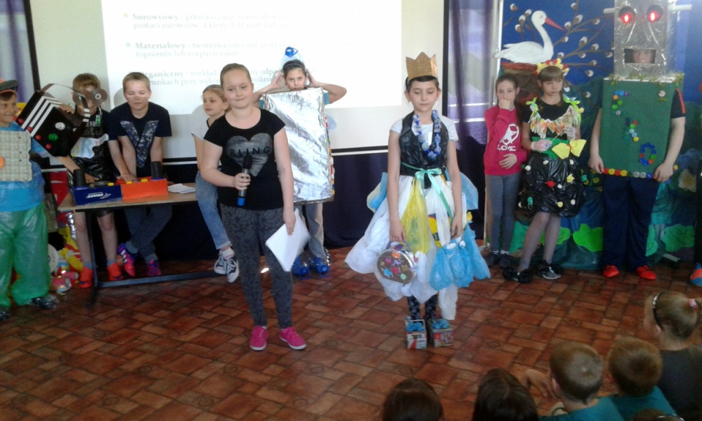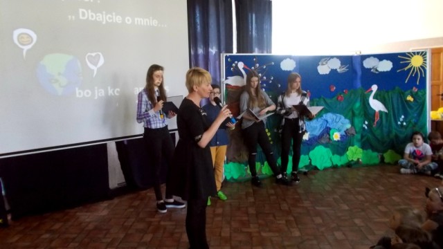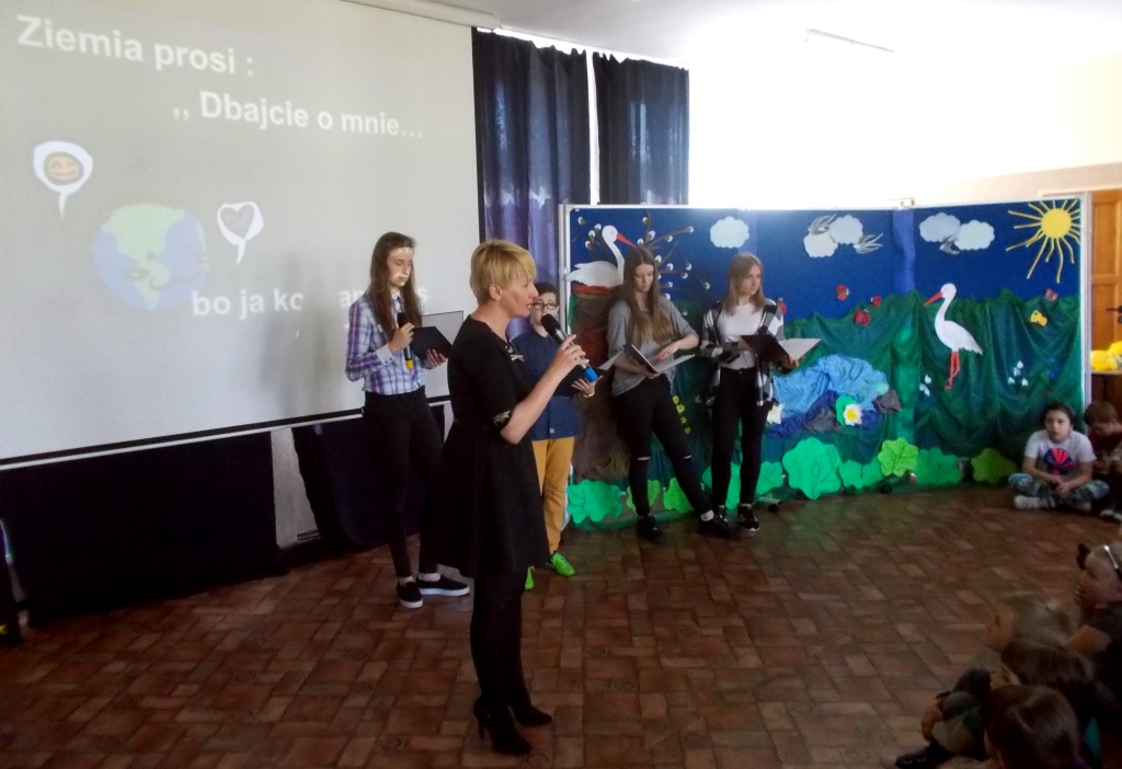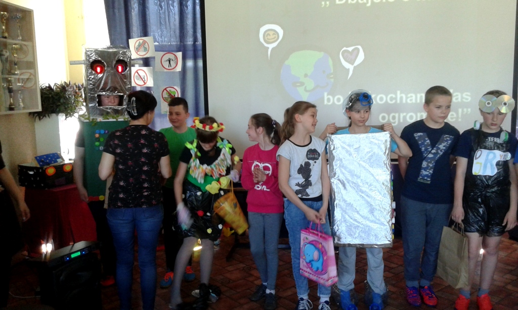 W dniu 6 maja dzieci z klas szkoły podstawowej były na spotkaniu z okazji Dnia Ziemi. Część artystyczną przygotowały  panie Jolanta Steckiewicz i Joanna Chłus wraz z młodzieżą z gimnazjum. Na  program  edukacyjny złożyły się piosenki o tematyce ekologicznej i przyrodniczej, prezentacja multimedialna, konkurs wiedzy o ochronie zasobów natury, prezentacja prac plastyczno-technicznych. Uczniowie klasy piątej przygotowali wspaniały pokaz strojów wykonanych z materiałów wtórnych – wszystkim niepowtarzalnym stylizacjom przyznano nagrody rzeczowe.