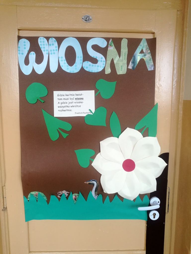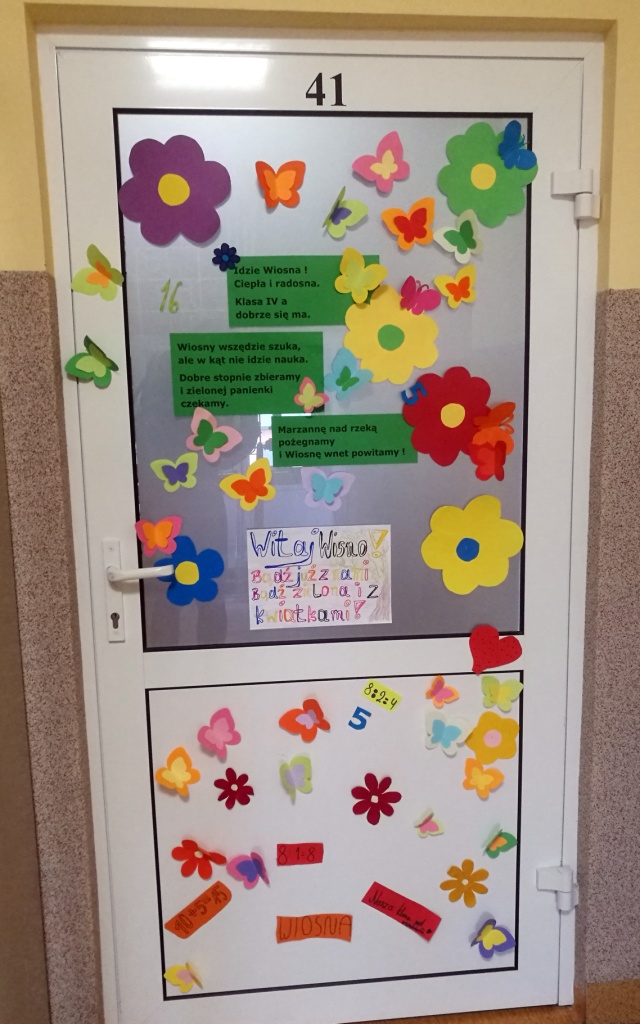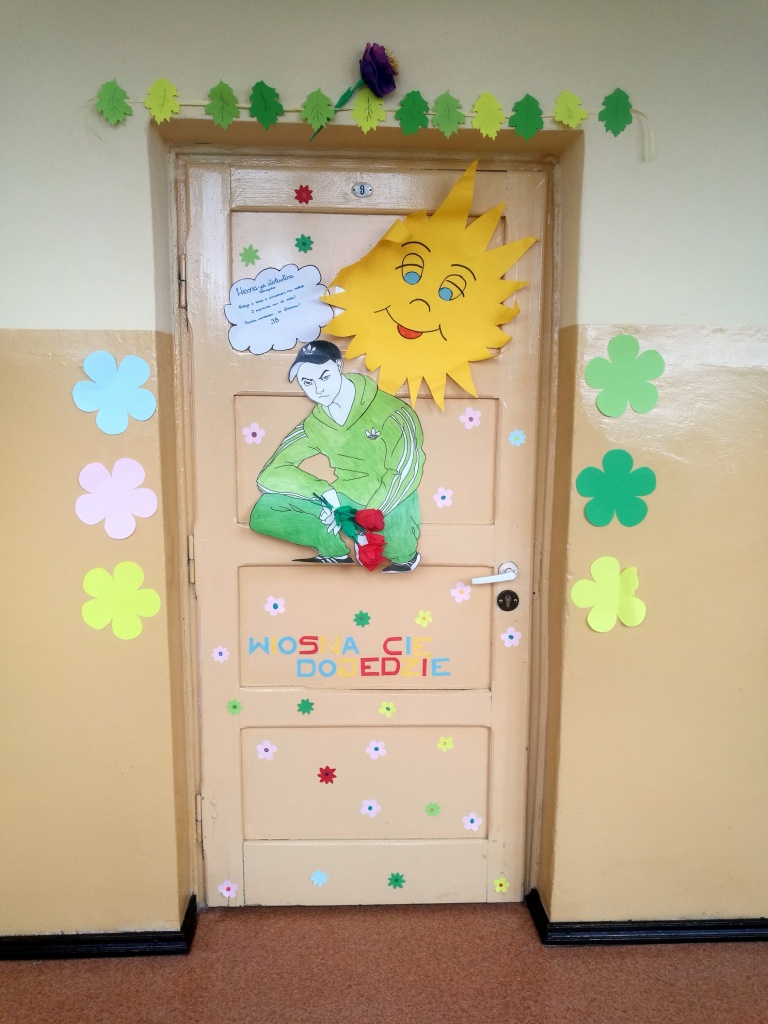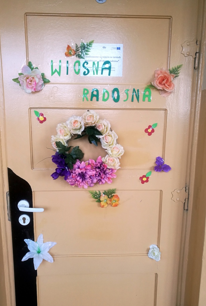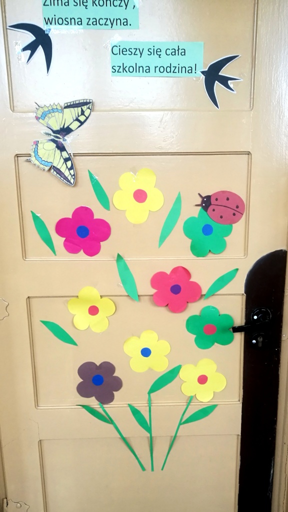 Z okazji powitania wiosny Samorząd Uczniowski przygotował akcję pod hasłem „Drzwi do wiosny”. Zadaniem uczniów było ozdobienie drzwi klasopracowni emblematami związanymi z tą piękną porą roku. Pomysł bardzo przypadł wszystkim do gustu. Na drzwiach pojawiły się kwiaty, bociany, motyle oraz wiosenne hasła. Do szkoły zawitał wiosenny klimat.