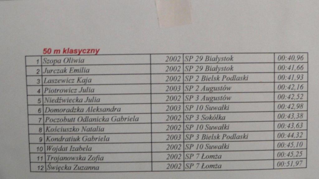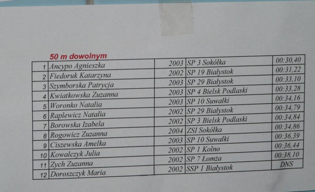 Agnieszka Ancypo uczennica naszej szkoły zdominowała rywalizację w stylu dowolnym dziewcząt na dystansie 50m, zdobywając 1 miejsce i tytuł Mistrzyni Województwa Podlaskiego. Od dawna żadna uczennica naszej szkoły nie miała tak wysokiej lokaty.
