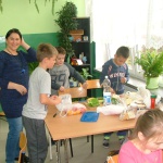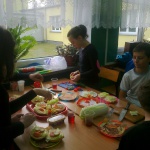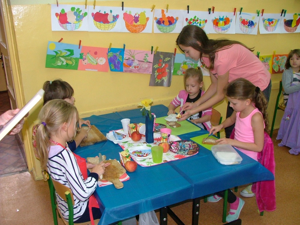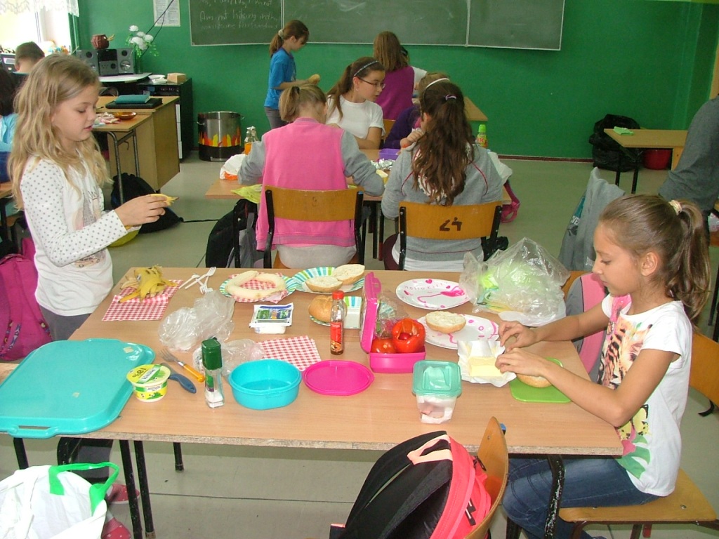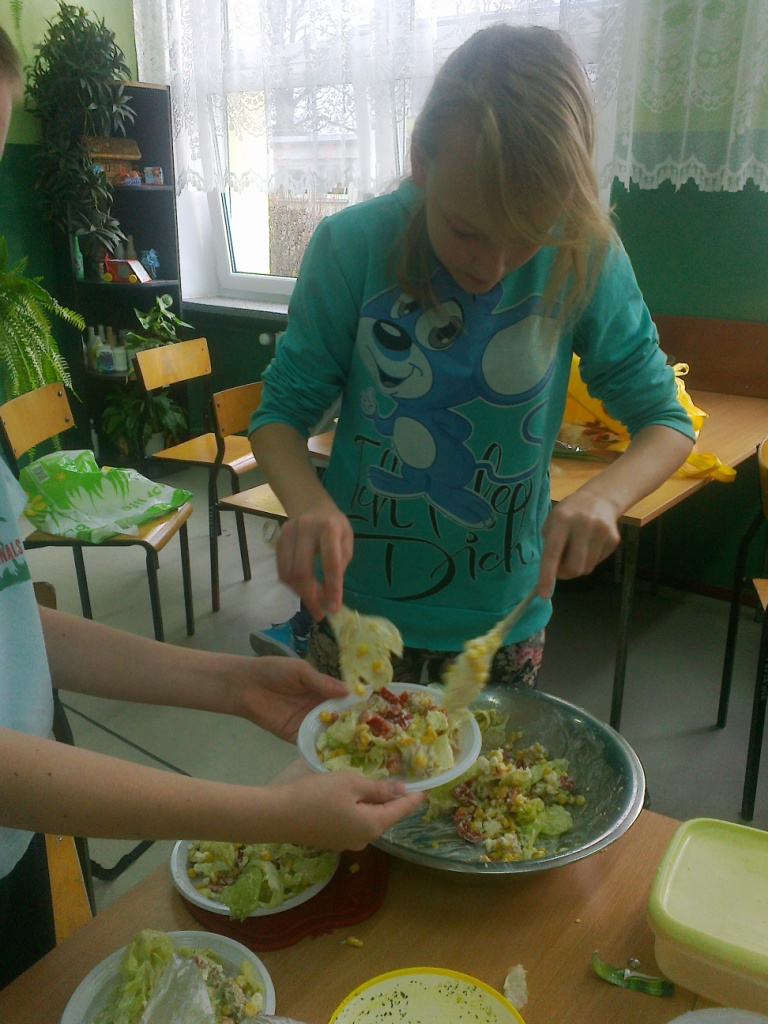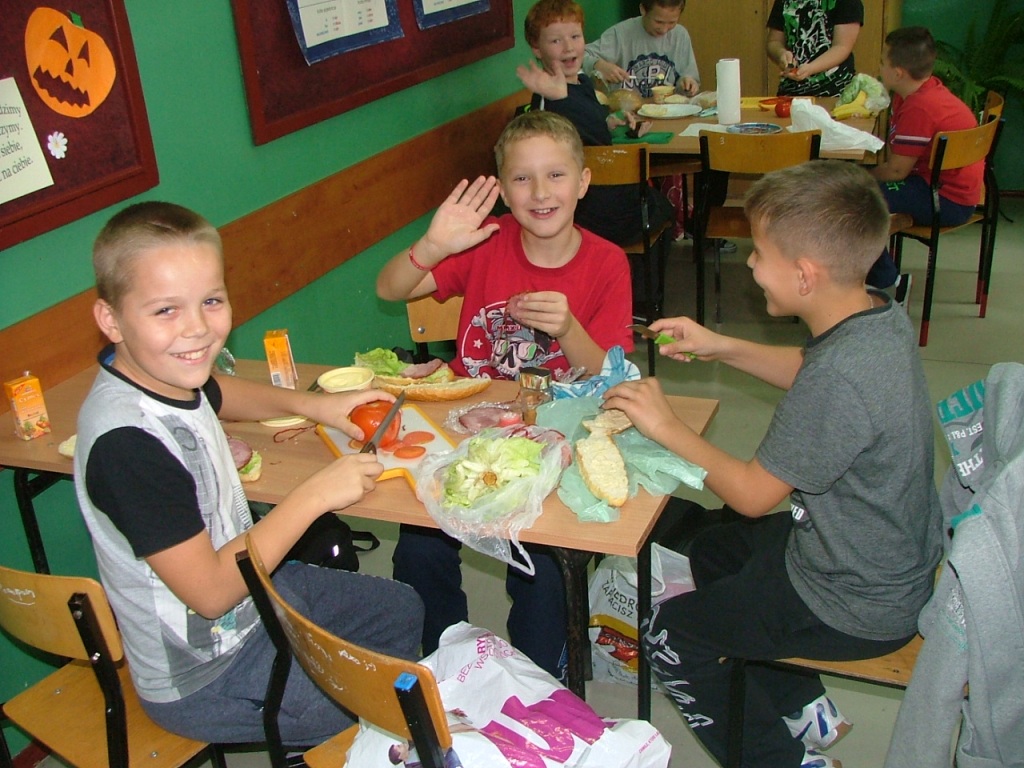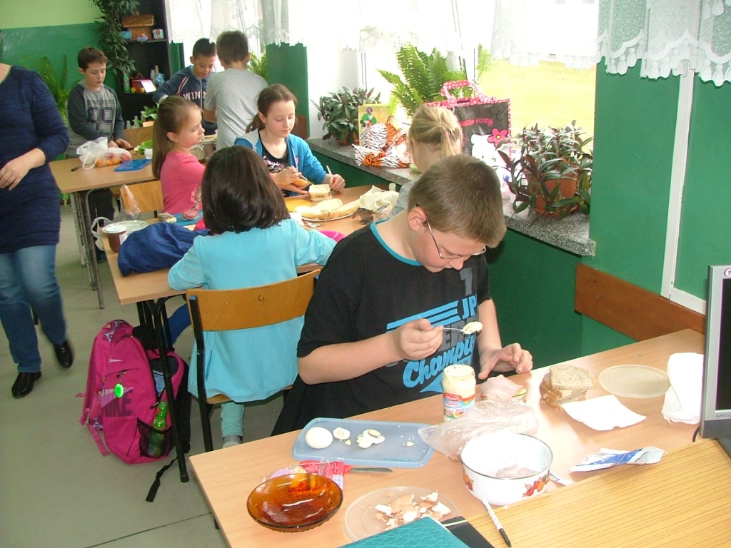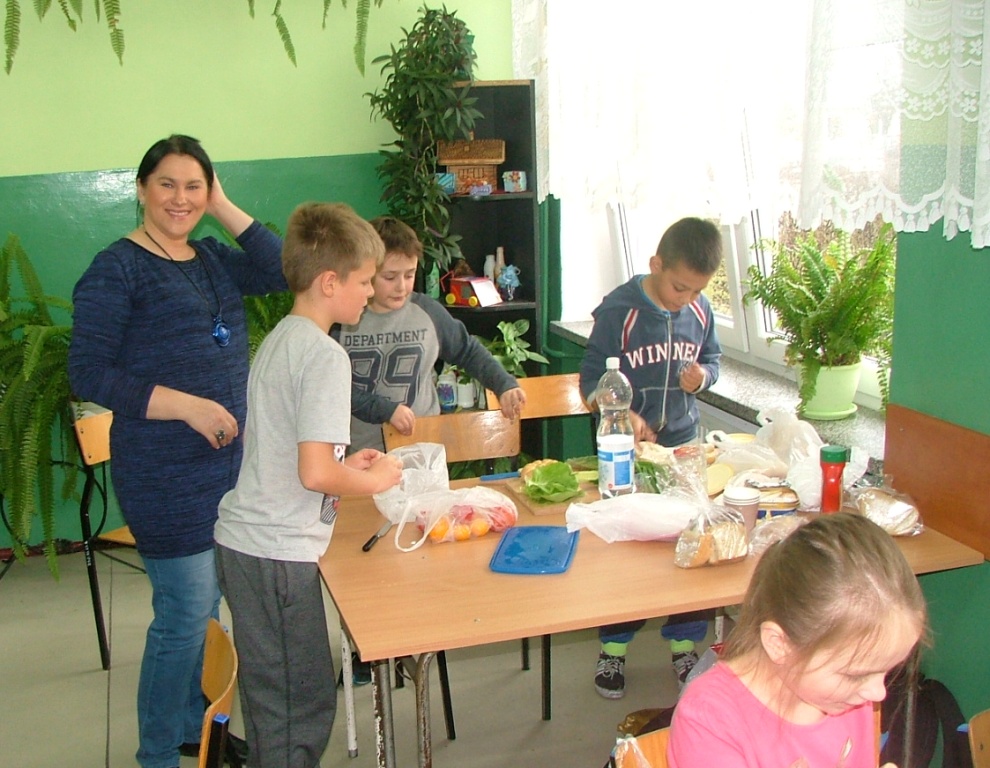 Do akcji  włączyli się też uczniowie klas IV- VI. Pod okiem nauczycielki techniki p. Małgorzaty Chociej wykonali pyszne i zdrowe kanapki.