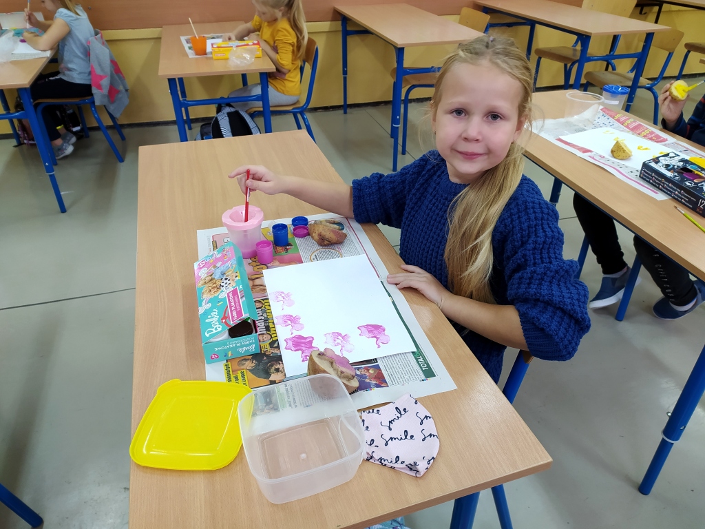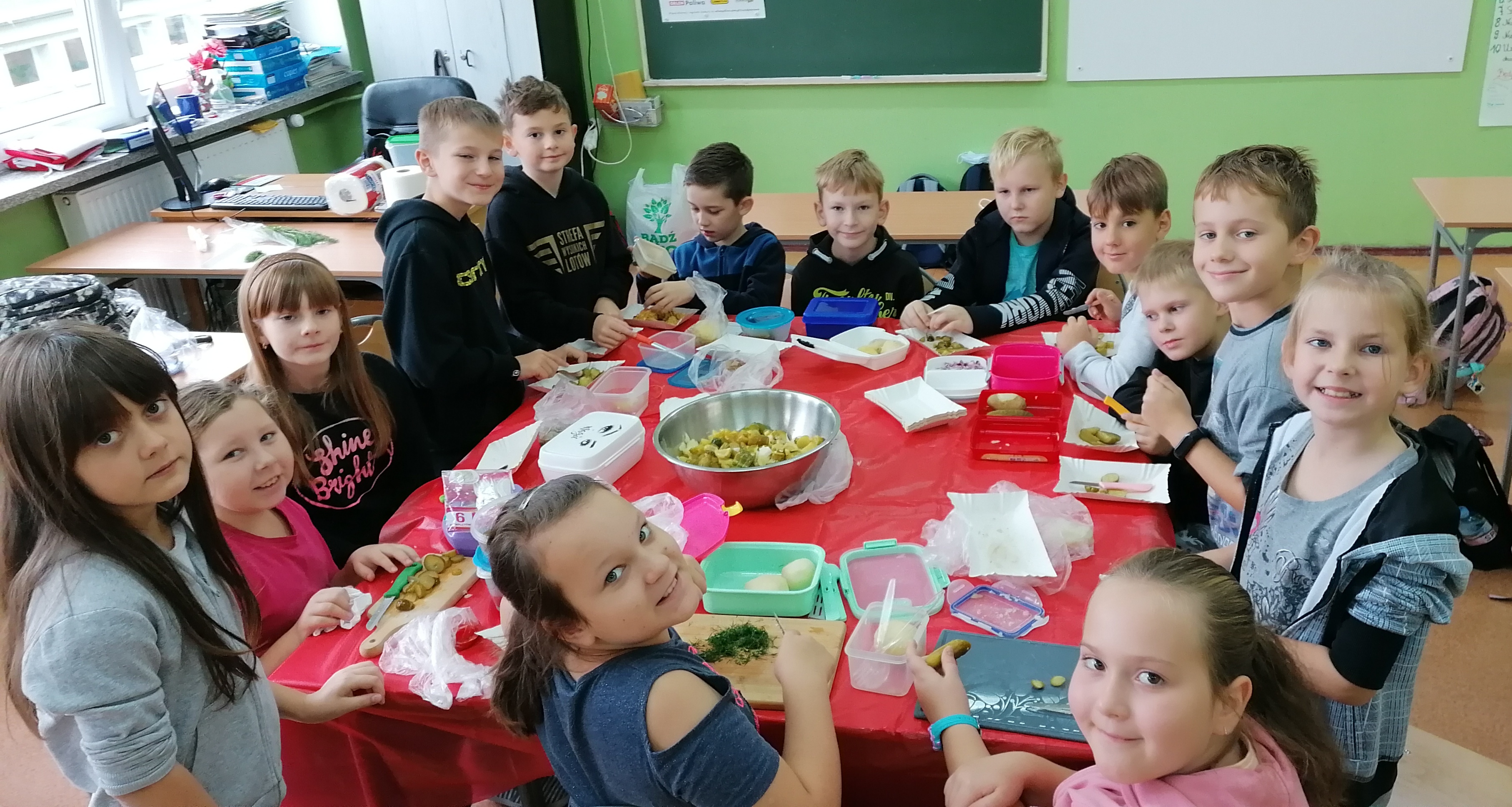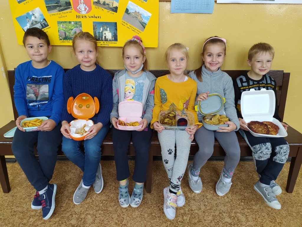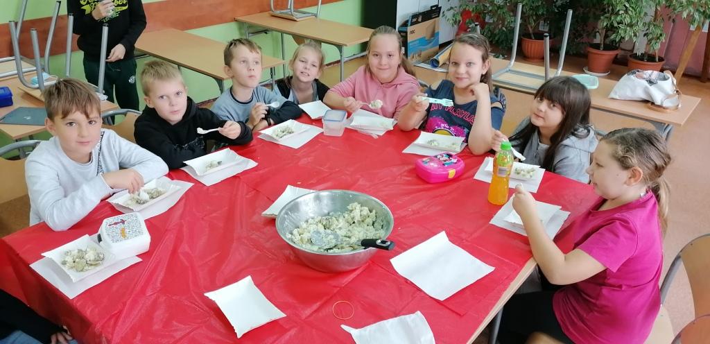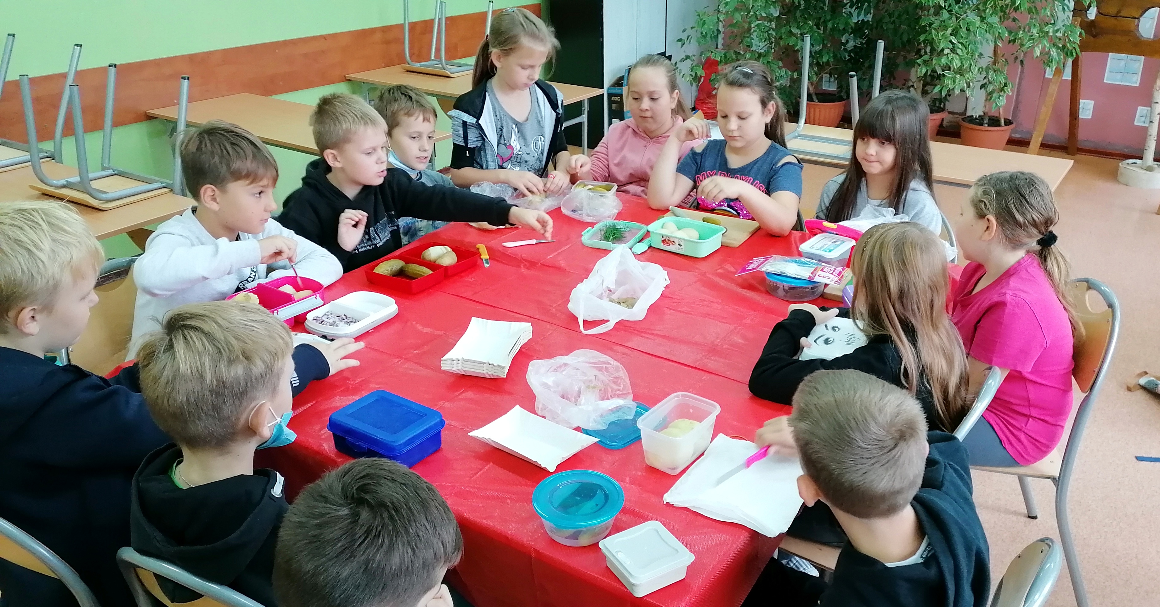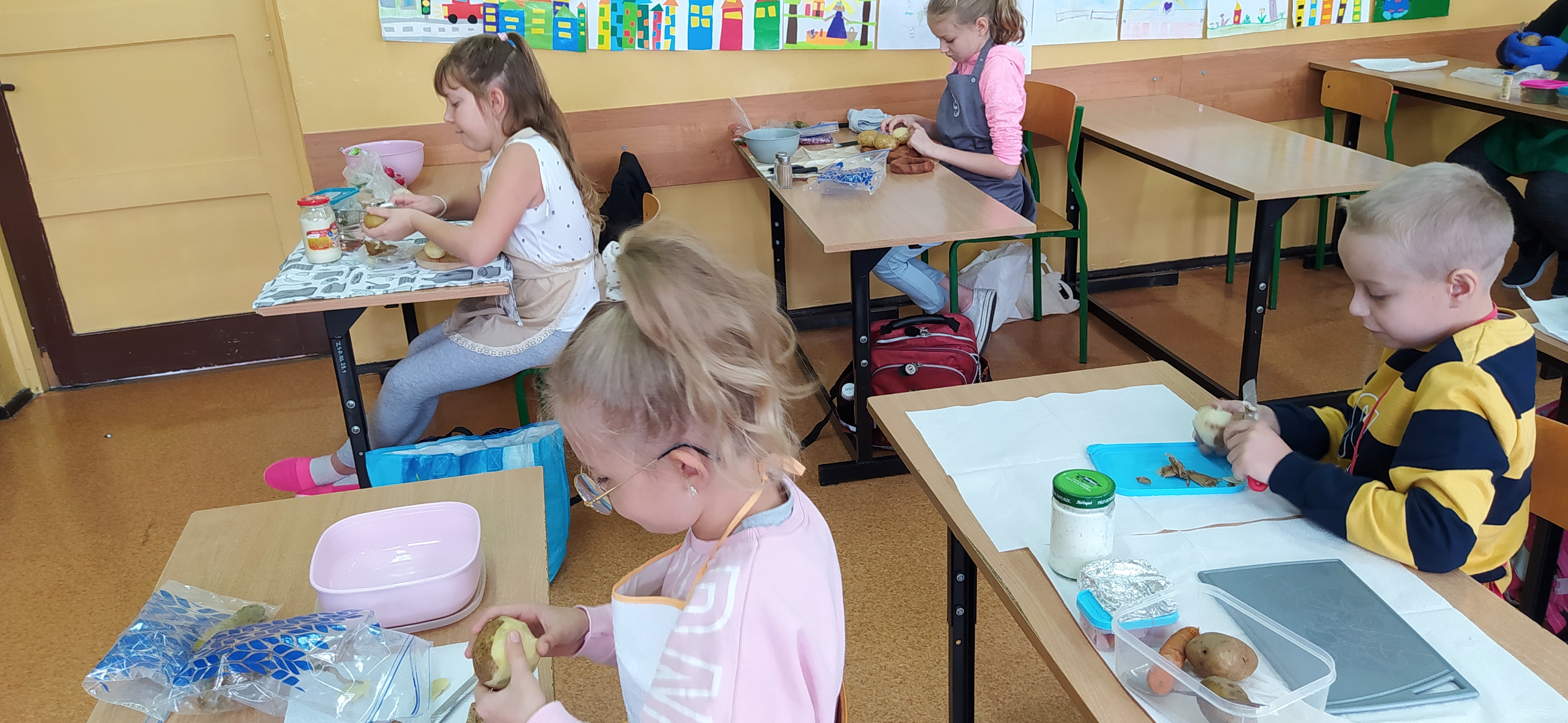 Jesień to czas zbiorów owoców i warzyw, w tym tak popularnych i królujących w naszej kuchni jak ziemniaki, zwane także kartoflami, pyrami lub grulami. Z tej okazji uczniowie młodszych klas naszej szkoły tradycyjnie obchodzili Dzień Ziemniaka. Niestety, ze względu na sytuację epidemiologiczną tegoroczne święto miało nieco inny charakter. Nie było wspólnych zabaw i gier oraz pieczenia ziemniaków, ale atrakcji i tak nie zabrakło. Pierwszaki wysłuchały bajki o ziemniaku i obejrzały filmik edukacyjny, po czym wykonały piękne kompozycje z ziemniaczanych stempelków. Kolorowały też rysunek przedstawiający budowę tej rośliny, poznając przy tym nowe słowa takie jak bulwa i łęty. Najfajniejszym momentem była degustacja potraw z ziemniaków, przygotowanych w domu i stanowiących drugie śniadanie w zastępstwie kanapek. Frytki, placki, kopytka, chipsy, smażone talarki smakowały naprawdę wyśmienicie. Klasy drugie przygotowały plakat mówiący o tym co można zrobić z ziemniaków. Trzeciaki własnoręcznie wykonały sałatkę ziemniaczaną i przygotowały wystawkę z ziemniaczanymi stworkami.