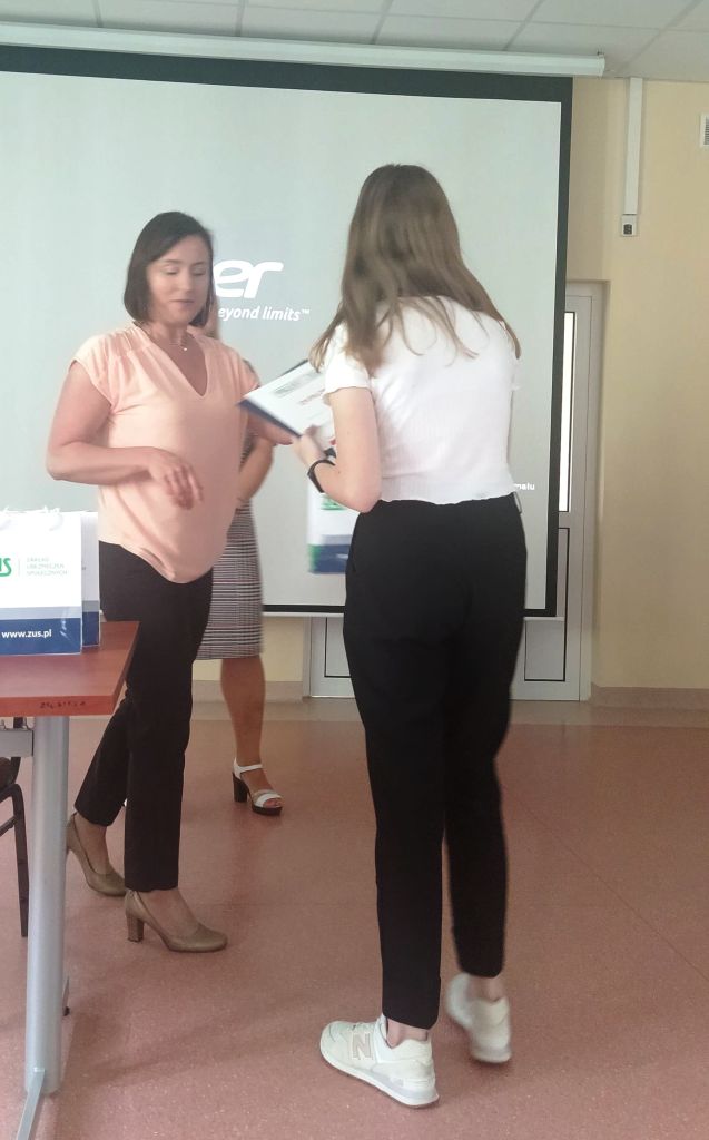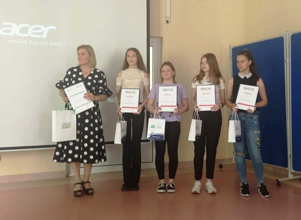 Uczennice klasy VII a – Weronika Dargiewicz, Aleksandra Jóźwik, Zuzanna Rećko i Martyna Sawicka pod kierunkiem p. Doroty Zalewskiej osiągnęły sukces i zajęły I miejsce wojewódzkim etapie konkursu ,,Projekt z ZUS”. Uczennice wykonały piękny plakat przybliżający podstawowe informacje o systemie ubezpieczeń społecznych i ich znaczeniu w życiu każdego człowieka. Laureatki otrzymały dyplomy i nagrody rzeczowe z rąk pani Moniki Michałowskiej, koordynator ds. komunikacji społecznej i edukacji oraz pani Katarzyny Kieda-Tolko, kierownik inspektoratu w Sokółce. Serdecznie gratulujemy i życzymy dalszych sukcesów!