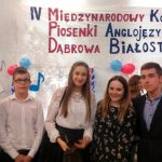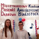 Dnia 30.05.2017 r. uczniowie naszego Gimnazjum Julia Borowska i Mateusz Zalewski wzięli udział w IV Międzynarodowym Konkursie Piosenki Anglojęzycznej organizowanym przez Zespół Szkół w Dąbrowie Białostockiej. Konkurs adresowany jest do młodzieży szkół ponadgimnazjalnych powiatu sokólskiego, szkół gimnazjalnych powiatu sokólskiego i augustowskiego oraz młodzieży ze szkół zaprzyjaźnionych na Litwie i Białorusi. W tym roku naszym uczniom nie udało się zająć miejsca na podium, ale występy były zaliczone do bardzo udanych i podobały się publiczności, bo oba otrzymały ogromne brawa. Dziękujemy Julii i Mateuszowi za poświęcony czas na przygotowanie się do występów i zachęcamy, aby nadal tak chętnie rozwijali swoje talenty muzyczne.