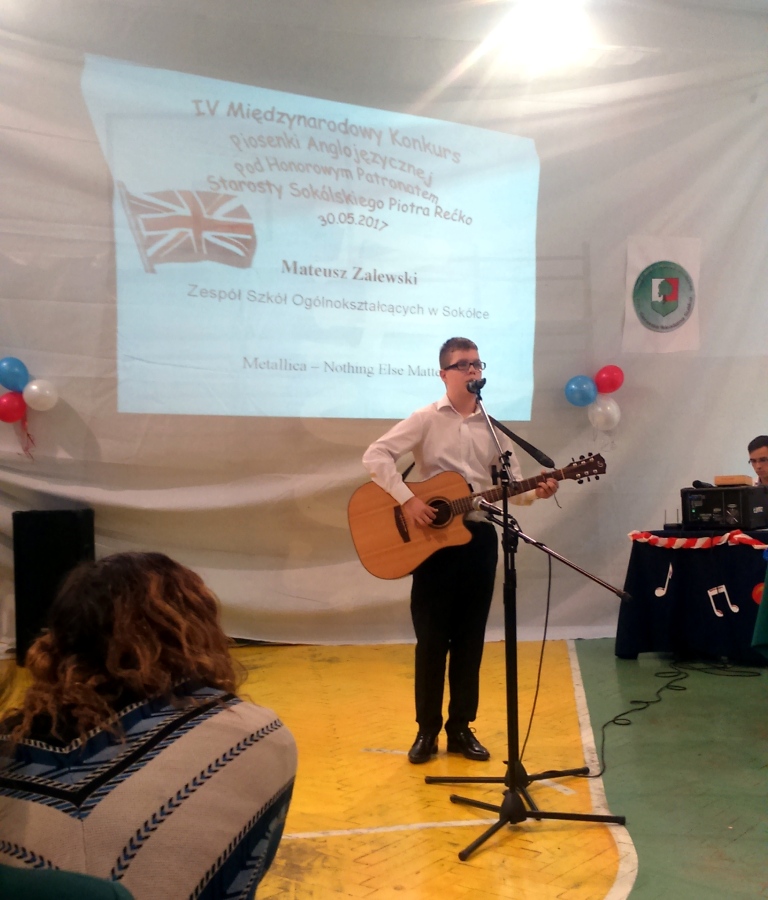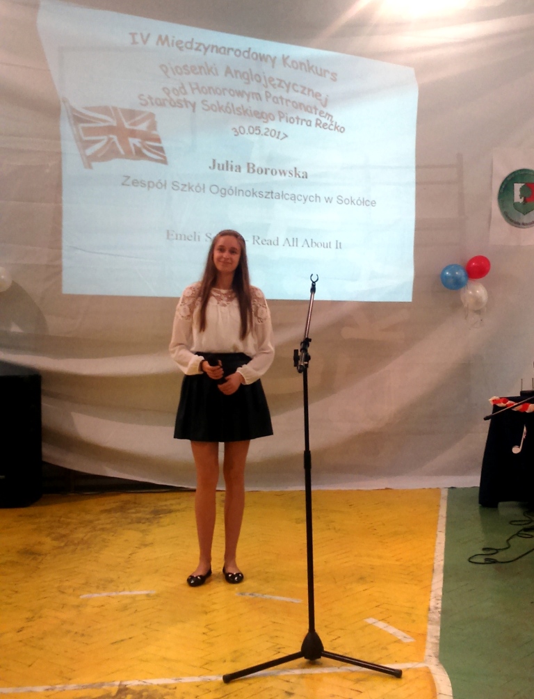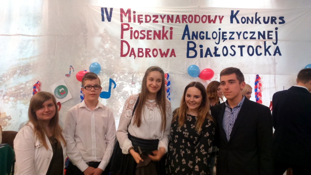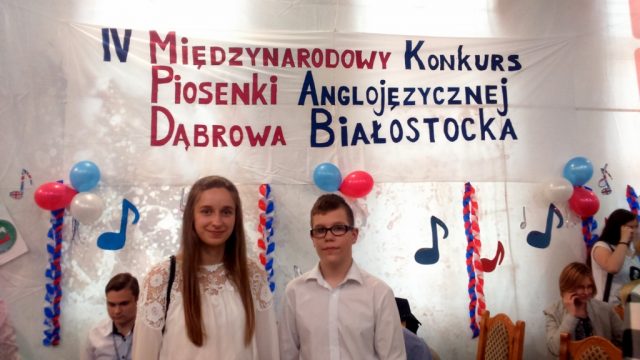 Dnia 30.05.2017 r. uczniowie naszego Gimnazjum Julia Borowska i Mateusz Zalewski wzięli udział w IV Międzynarodowym Konkursie Piosenki Anglojęzycznej organizowanym przez Zespół Szkół w Dąbrowie Białostockiej. Konkurs adresowany jest do młodzieży szkół ponadgimnazjalnych powiatu sokólskiego, szkół gimnazjalnych powiatu sokólskiego i augustowskiego oraz młodzieży ze szkół zaprzyjaźnionych na Litwie i Białorusi. W tym roku naszym uczniom nie udało się zająć miejsca na podium, ale występy były zaliczone do bardzo udanych i podobały się publiczności, bo oba otrzymały ogromne brawa. Dziękujemy Julii i Mateuszowi za poświęcony czas na przygotowanie się do występów i zachęcamy, aby nadal tak chętnie rozwijali swoje talenty muzyczne.