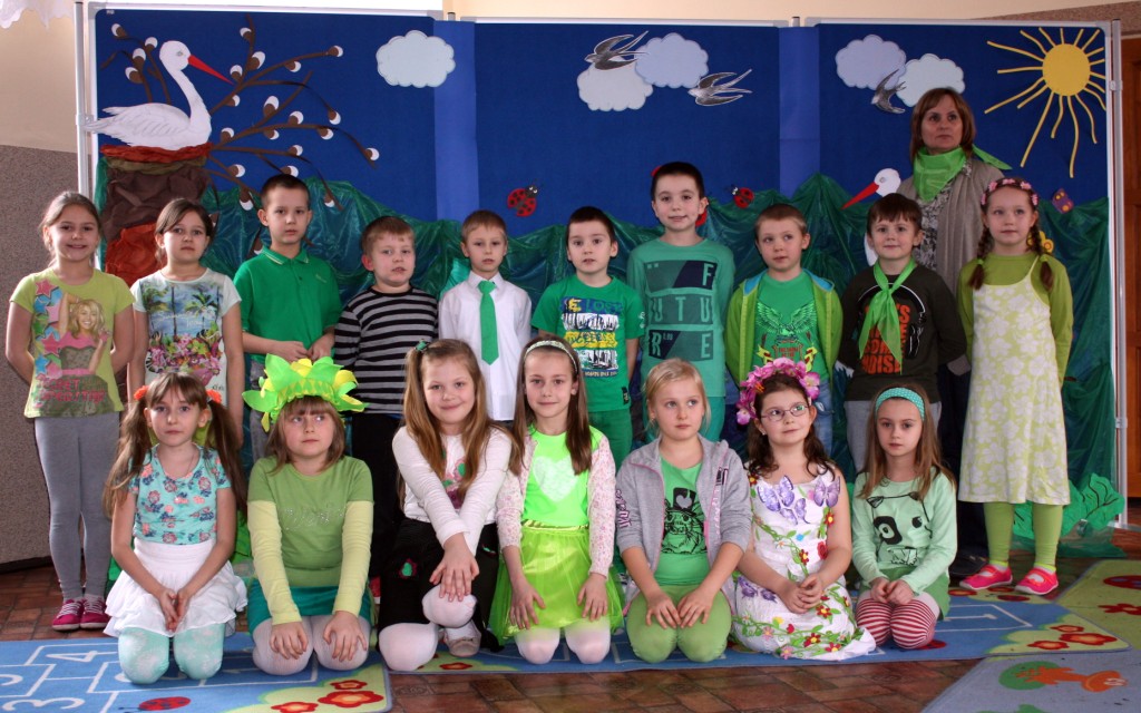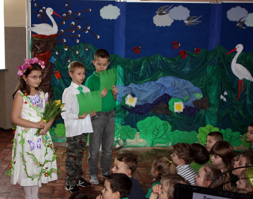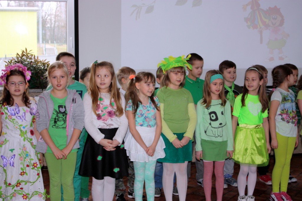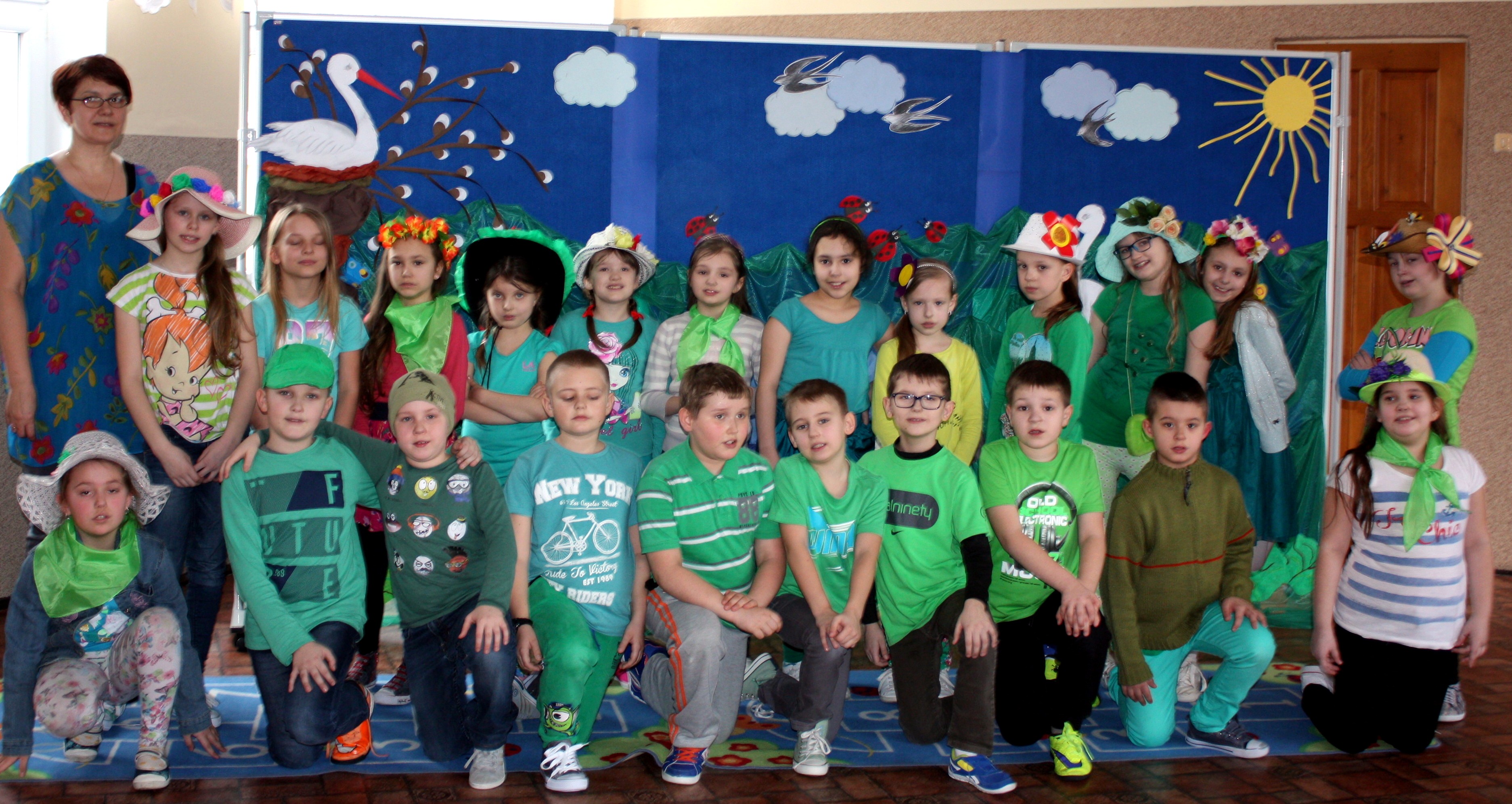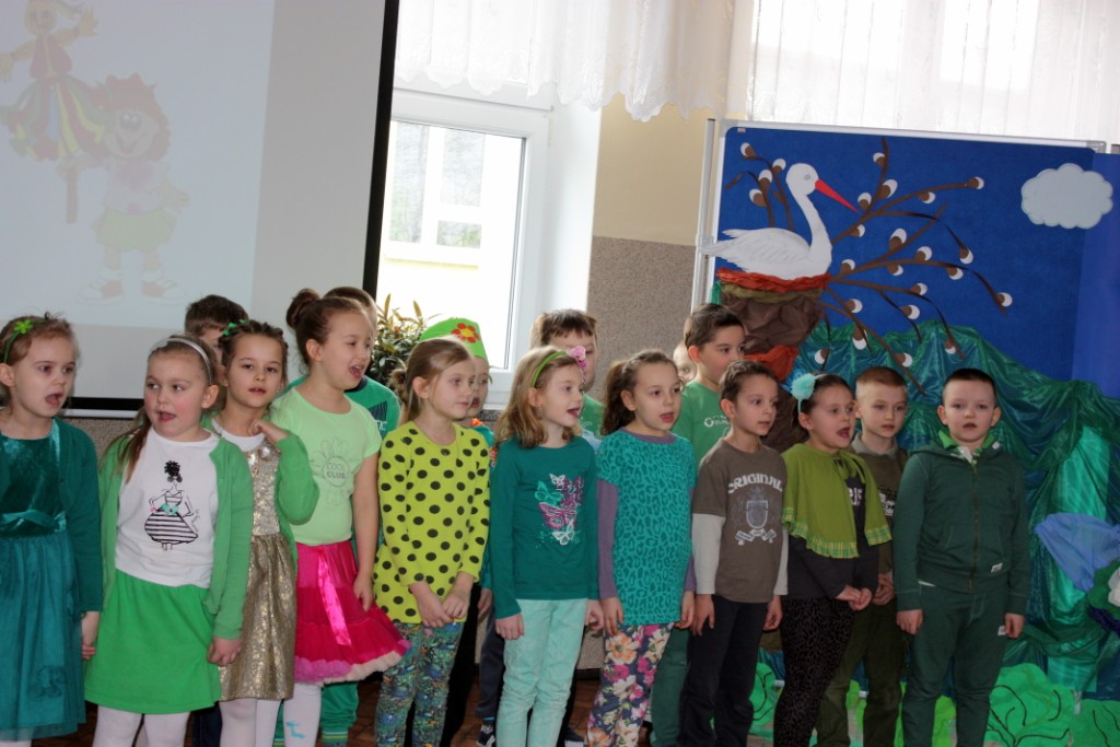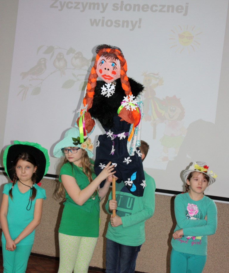 Wiosna to cudowna pora roku, dlatego pierwszy dzień jej panowania jest bardzo radosny i wyczekiwany przez wszystkich, niezależnie od wieku. Przygotowania do dnia 21 marca dzieci z klas początkowych naszej szkoły rozpoczęły dużo wcześniej: prowadząc rozmowy o zmianach zachodzących w przyrodzie, szukając oznak wiosny na spacerach, ucząc się wierszy i piosenek o tematyce wiosennej, wykonując prace plastyczne. W piątek na holu przed pokojem nauczycielskim pojawiła się tablica ze wspaniałą dekoracją autorstwa nauczycielki świetlicy, pani Jolanty Paruk, przedstawiającą wiosnę w jej najpiękniejszej, przyrodniczej odsłonie. Dziś wszystkie dzieci i dorosłych obowiązywał zielony strój, przez co w szkole zrobiło się niezwykle wesoło i ciepło, mimo chmur, deszczu i zimna za oknem. Miłymi gośćmi były maluchy z zaprzyjaźnionego przedszkola „Zielny Zakątek” z grupy sześciolatków oraz ich panie nauczycielki. Uroczystość rozpoczęła się od prezentacji multimedialnej „Witaj Wiosno”, przygotowanej przez panią Zofię Kowalczuk, po której odbył się quiz wiedzy o wiośnie. Następnie dzieci z klasy drugiej przedstawiły inscenizację „Przyjście wiosny”, przygotowaną pod okiem wychowawczyni, pani Doroty Kamińskiej. Wszystkie klasy zaprezentowały się kolegom z przedszkola w mini-recitalu piosenkarskim dotyczącym przyjścia wiosny, a na koniec pani Barbara Chancewicz zaprosiła do improwizacji muzycznej „Taniec motyli”. Kukłę marzanny potraktowano niezwykle humanitarnie i ekologicznie chowając ją do worka, by tam poczekała na powrót zimy. Ostatnim akcentem powitania wiosny było zrobienie pamiątkowych zdjęć.