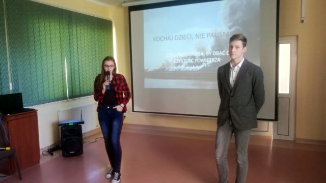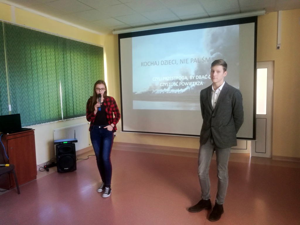 W ubiegły piątek uczniów z klas początkowych odwiedzili przedstawiciele Młodzieżowej Rady Miejskiej: Karina Miron i Konrad Rećko. Temat spotkania dotyczył walki ze smogiem – zjawiskiem, o którym w ostatnim czasie jest bardzo głośno. Dzieci dowiedziały się czym jest smog i dlaczego jest tak szkodliwy dla naszego zdrowia. Co warto robić, aby na co dzień zadbać o dobrą jakość powietrza. Przygotowana przez młodzież prezentacja multimedialna zawierała m.in. proste i czytelne instrukcje dotyczące tego jakimi materiałami można palić zimą w piecach, a co jest absolutnie zabronione. Dzieci miały możliwość, by podzielić się swoimi doświadczeniami, niektórzy zgłaszali pomysły, co można zrobić, by chronić powietrze przed zanieczyszczeniami. Spotkanie było ważną i ciekawą lekcją wychowania społecznego i ekologicznego.