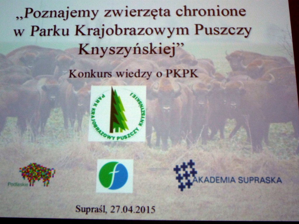 27.04.2015 r. Gabriela Rabiczko, Szymon Krokos i Jacek Grzybowski reprezentowali naszą szkołę w konkursie o Parku Krajobrazowym Puszczy Knyszyńskiej w Supraślu. Wykazali się ogromną wiedzą, przygotowali też piękne prezentacje o wybranych zwierzętach. Chociaż silna konkurencja nie pozwoliła zdobyć czołowych miejsc, to zostali docenieni dyplomami i innymi drobiazgami. Konkurs pisali w pięknie odnowionym zabytkowym monastyrze (klasztorze). Ognisko i kiełbaski działały krzepiąco.