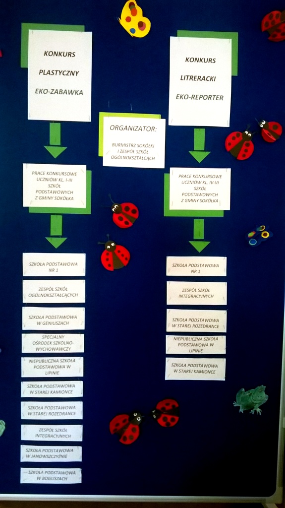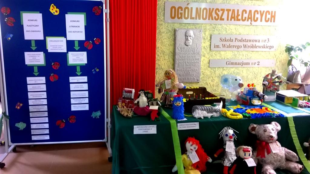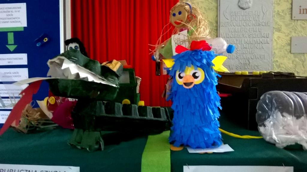 Nasza szkoła wraz z Burmistrzem Sokółki była organizatorem konkursu „Eko- zabawka”, adresowanego do uczniów klas początkowych z miasta i gminy Sokółka. Zadanie polegało na wykonaniu zabawki z surowców wtórnych lub z materiałów naturalnych dowolną techniką. Do tego potrzebna była kreatywność, pomysłowość oraz trochę zdolności plastycznych i manualnych oraz nieograniczona wyobraźnia. Celem konkursu było zwrócenie uwagi na ochronę przyrody, a zwłaszcza narastający problem zanieczyszczenia środowiska naturalnego. Przy okazji dzieci uczyły się segregowania odpadów i wykorzystywania ich w twórczy i pożyteczny sposób. Komisja w składzie: Anna Żamojduk, Urszula Marchiel, Urząd Miejski, Anna Andrzejewska dyrektor ZSO, Jolanta Paruk ZSO przyznała naszym uczniom następujące miejsca:
