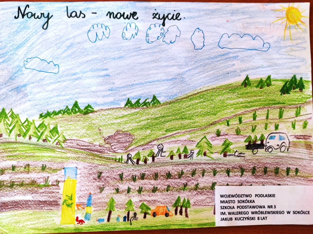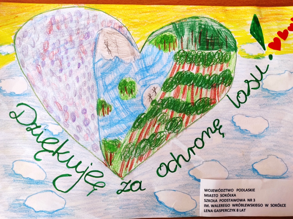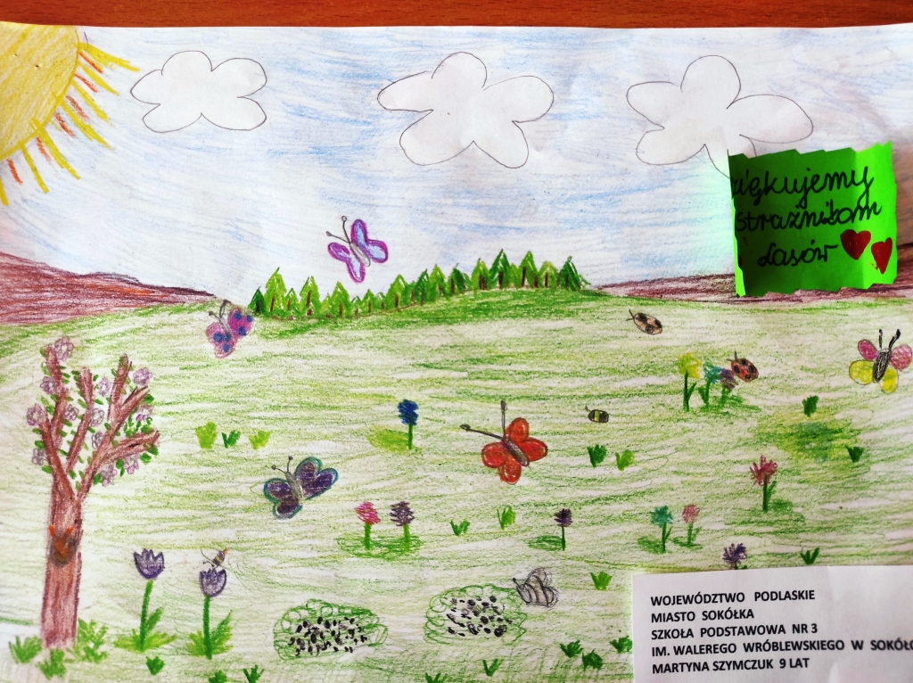 Uczniowie klas młodszych na zajęciach w świetlicy szkolnej wykonali laurki dla strażników lasów z okazji Dnia Strażaka i Leśnika. Prace zostały zgłoszone do Ogólnopolskiej akcji ,,Cała Polska maluje giga laurkę dla strażników lasów”. Każda laurka trafi na multimedialną wystawę, którą będą podziwiać wszyscy Strażacy i Leśniczy z całej Polski. Akcja ta ma na celu skupić uwagę wokół problemu pożarów leśnych i podziękować strażnikom lasów, którzy na co dzień ochraniają nasze polskie lasy przed pożarami. Internetową wystawę będzie można obejrzeć na stronie http://straznicylasow.pl.