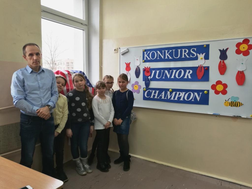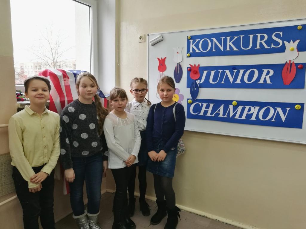 21.02.2020 pięcioosobowa reprezentacja klasy 3a z SP 3 w Sokółce, w składzie: Amelia Normantowicz, Iga Małoń, Zuzia Domin, Zuzia Jelska oraz Szymon Tołłoczko, wzięła udział w kolejnej już edycji Międzyszkolnego Konkursu Języka Angielskiego dla klas trzecich „Junior Champion” organizowanego przez nauczycieli anglistów ze Szkoły Podstawowej nr 1 w Sokółce.