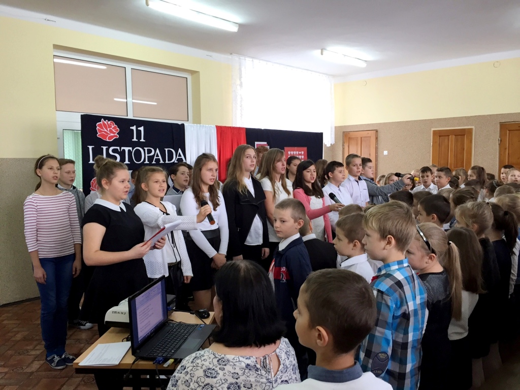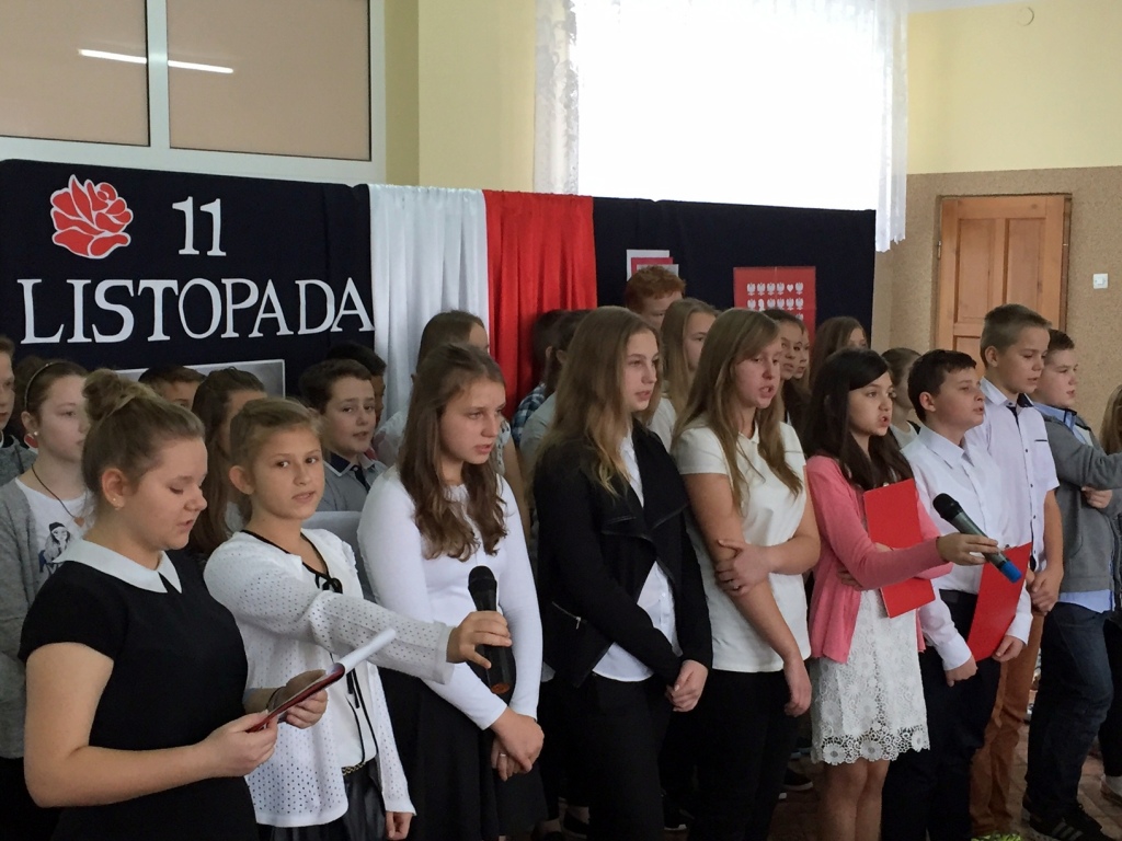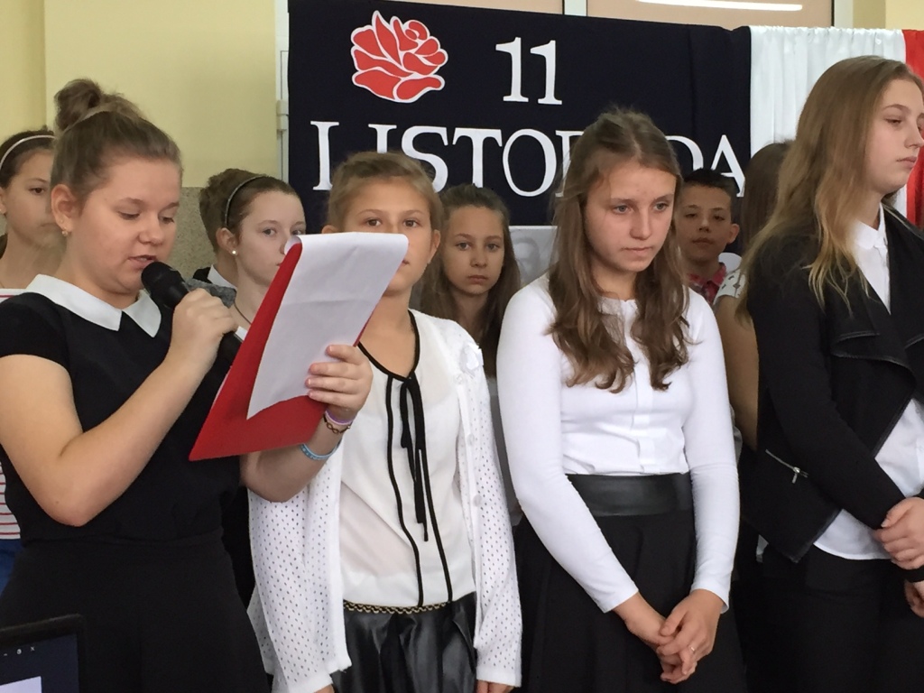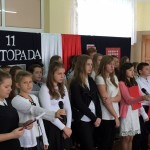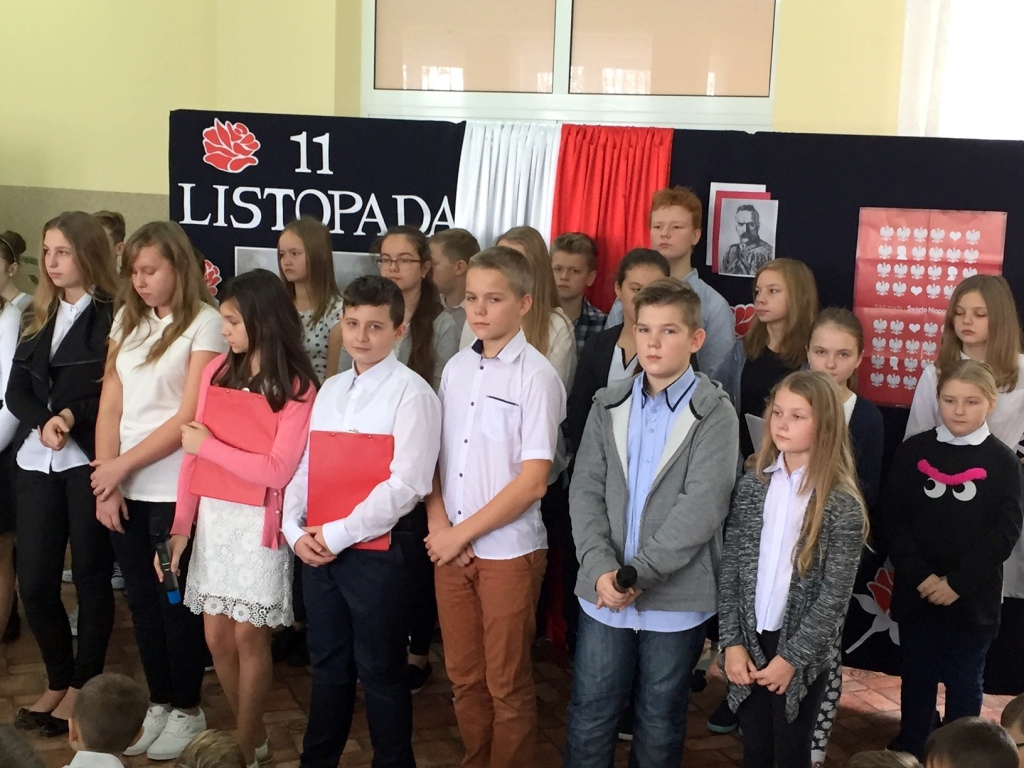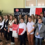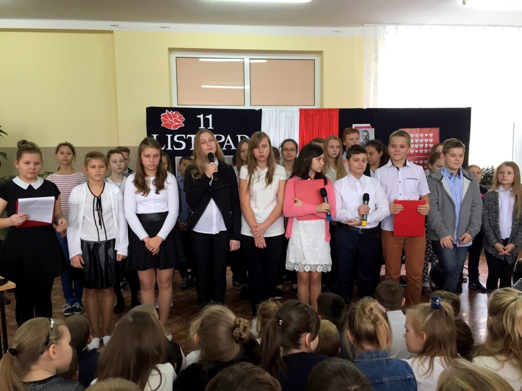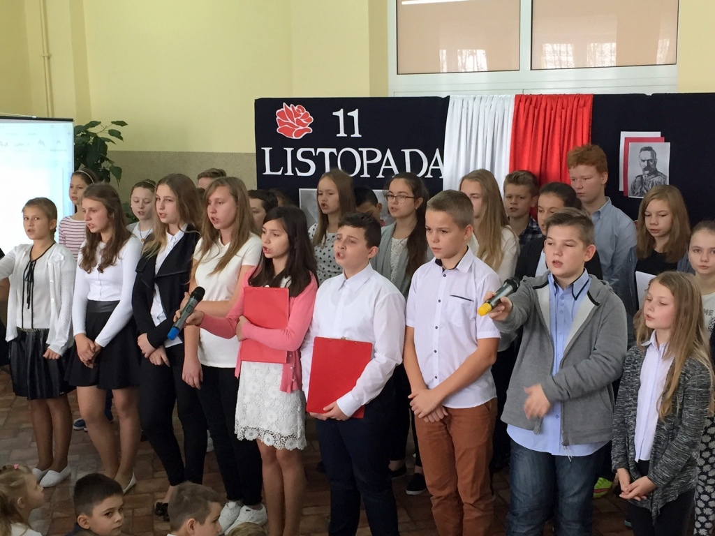 W dniu 10 listopada w naszej szkole odbył się apel z okazji Narodowego Święta Niepodległości. Uroczystość przygotowana przez panią Katarzynę Daszuta i uczniów klasy piątej, szóstej i IIa gimnazjum w tym roku przebiegała nieco inaczej, niż zwykle. W bardzo ciekawy i obrazowy sposób przedstawiono losy naszej Ojczyzny, począwszy od zaborów, a skończywszy na roku 1918. Scenariusz obejmował nie tylko treści historyczne, patriotyczne wiersze oraz istotne informacje z dziejów Polski. Ważnym punktem apelu było wspólne śpiewanie pieśni, wśród których nie zabrakło „Roty”, „My, pierwsza brygada” czy „Szarej piechoty”. Julka Borowska zachwyciła wszystkich wspaniałą interpretacją utworu „Tu wszędzie jest moja Ojczyzna”. Uroczysty charakter apelu podkreślały galowe stroje uczniów z przypiętymi kotylionami. Na koniec pani dyrektor podziękowała artystom za ich pracę i przypomniała zgromadzonym o tym, że nigdy nie należy zapominać o dziejach naszego kraju, o polskiej tradycji, kulturze i ludziach tworzących historię.