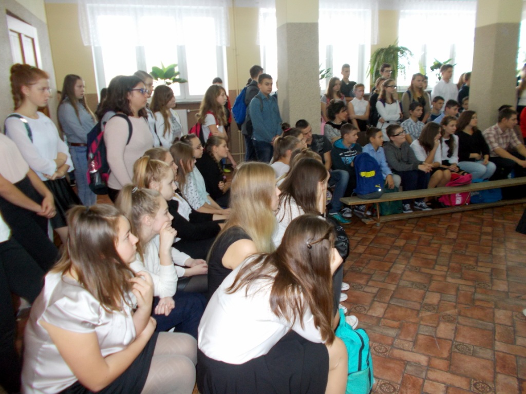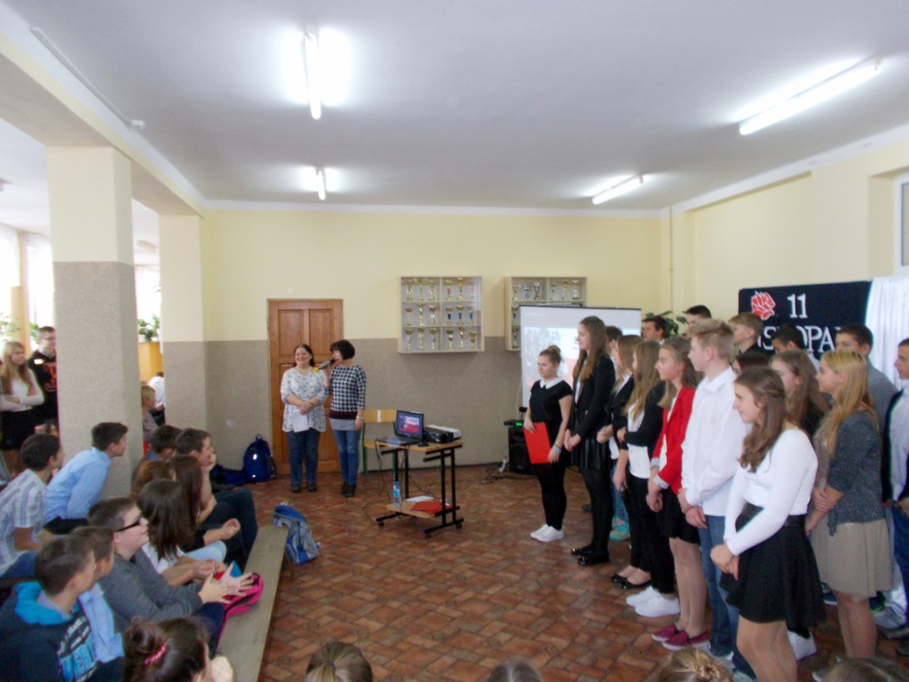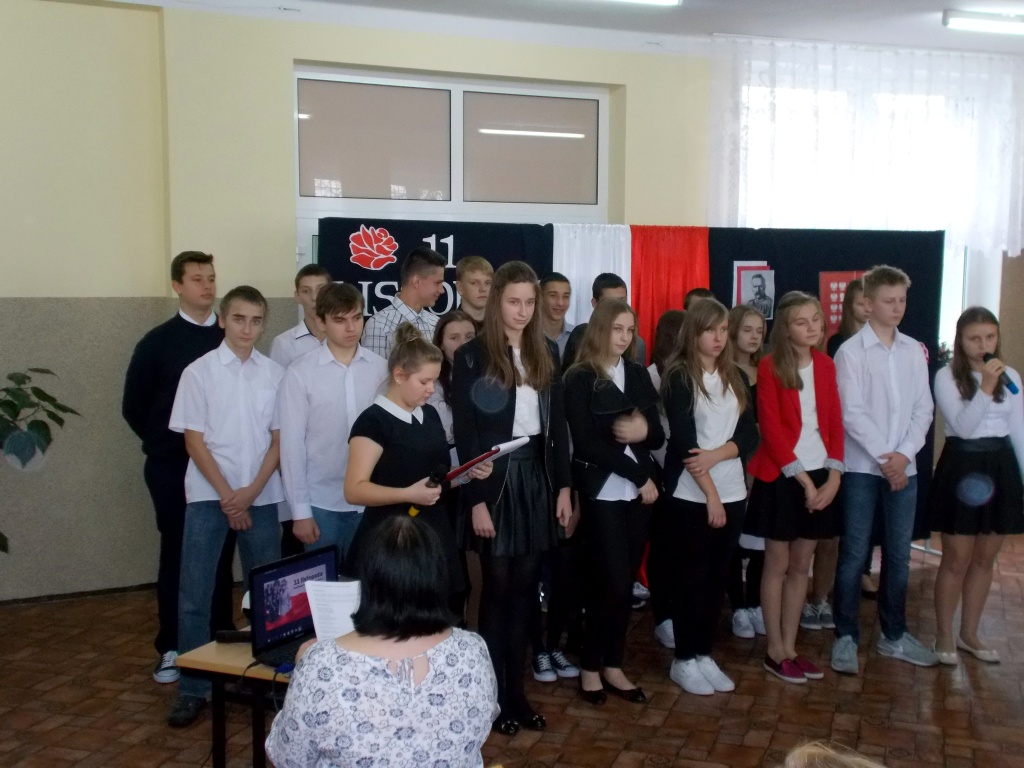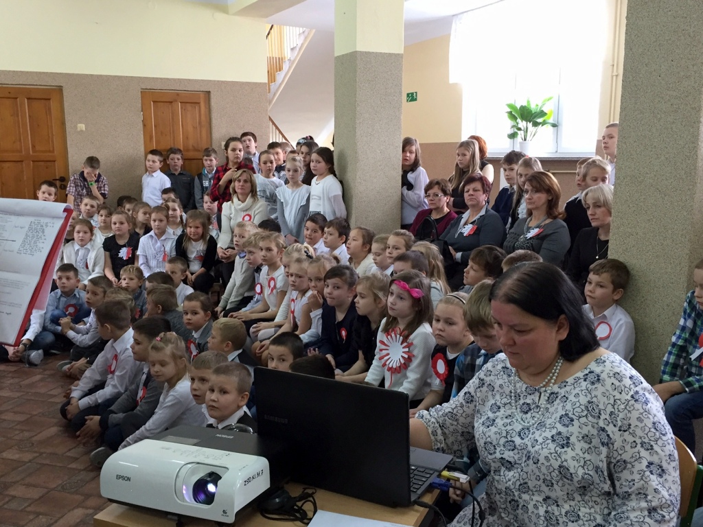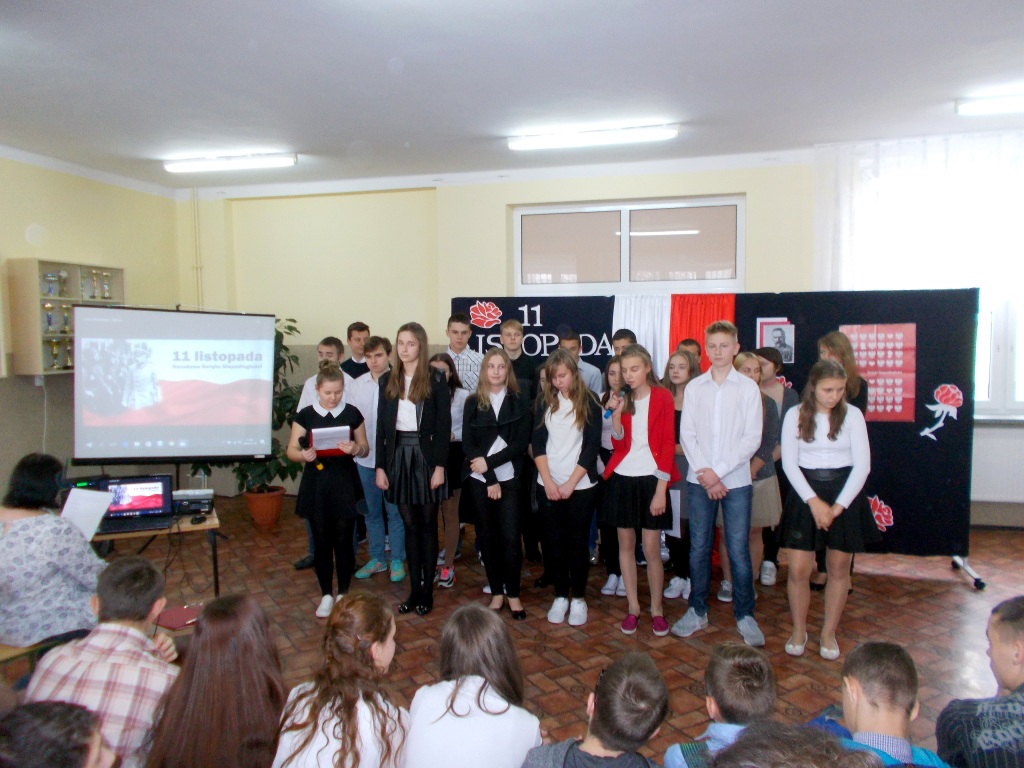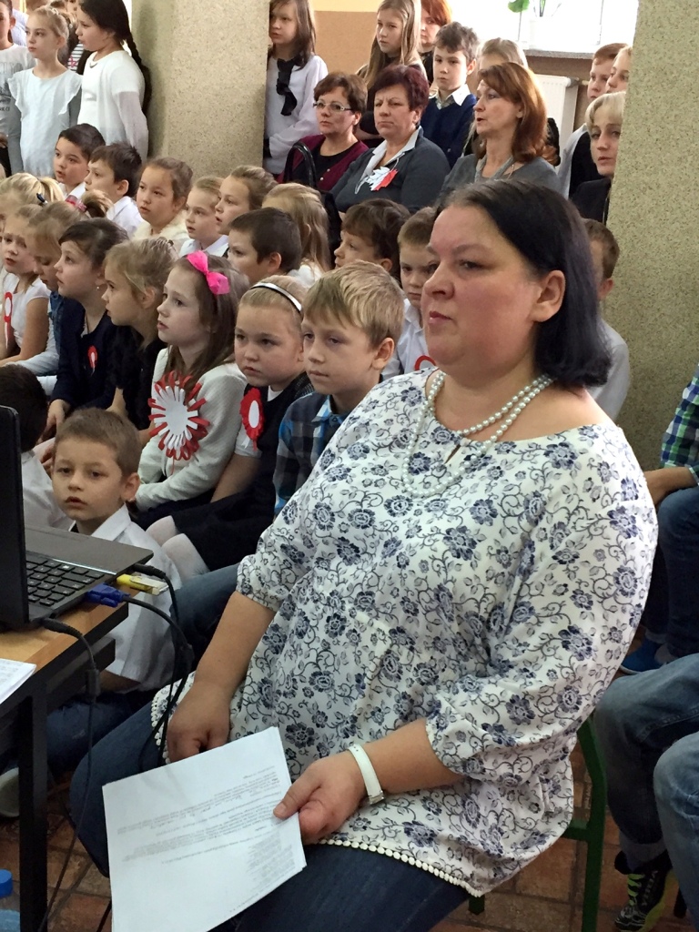 W dniu 10 listopada w naszej szkole odbył się apel z okazji Narodowego Święta Niepodległości. Uroczystość przygotowana przez panią Katarzynę Daszuta i uczniów klasy piątej, szóstej i IIa gimnazjum w tym roku przebiegała nieco inaczej, niż zwykle. W bardzo ciekawy i obrazowy sposób przedstawiono losy naszej Ojczyzny, począwszy od zaborów, a skończywszy na roku 1918. Scenariusz obejmował nie tylko treści historyczne, patriotyczne wiersze oraz istotne informacje z dziejów Polski. Ważnym punktem apelu było wspólne śpiewanie pieśni, wśród których nie zabrakło „Roty”, „My, pierwsza brygada” czy „Szarej piechoty”. Julka Borowska zachwyciła wszystkich wspaniałą interpretacją utworu „Tu wszędzie jest moja Ojczyzna”. Uroczysty charakter apelu podkreślały galowe stroje uczniów z przypiętymi kotylionami. Na koniec pani dyrektor podziękowała artystom za ich pracę i przypomniała zgromadzonym o tym, że nigdy nie należy zapominać o dziejach naszego kraju, o polskiej tradycji, kulturze i ludziach tworzących historię.
