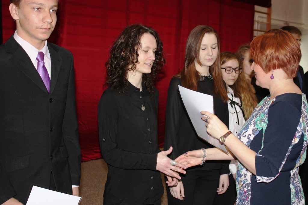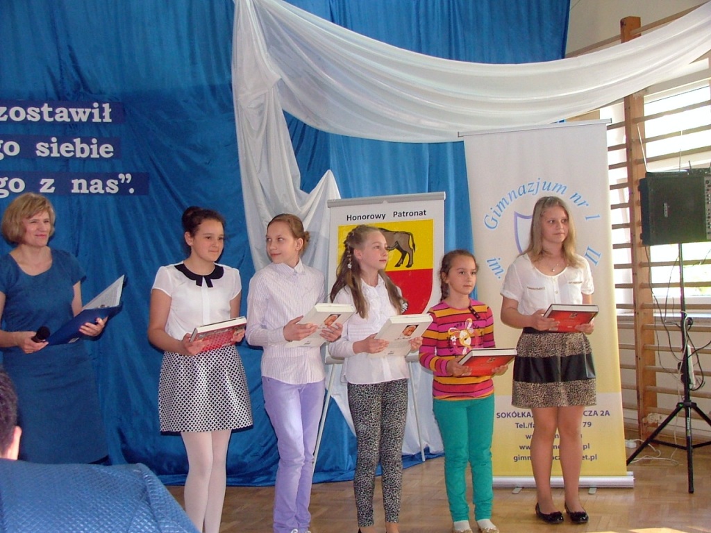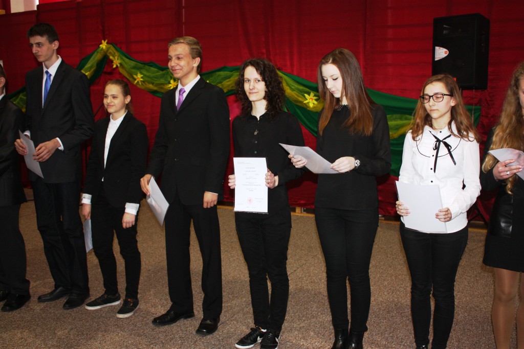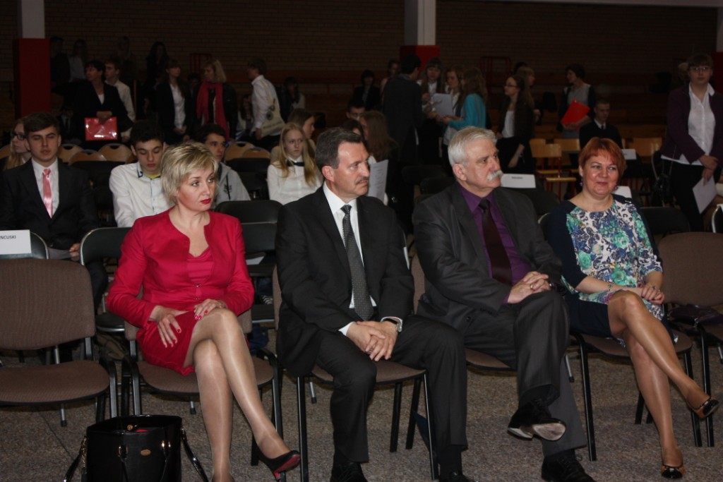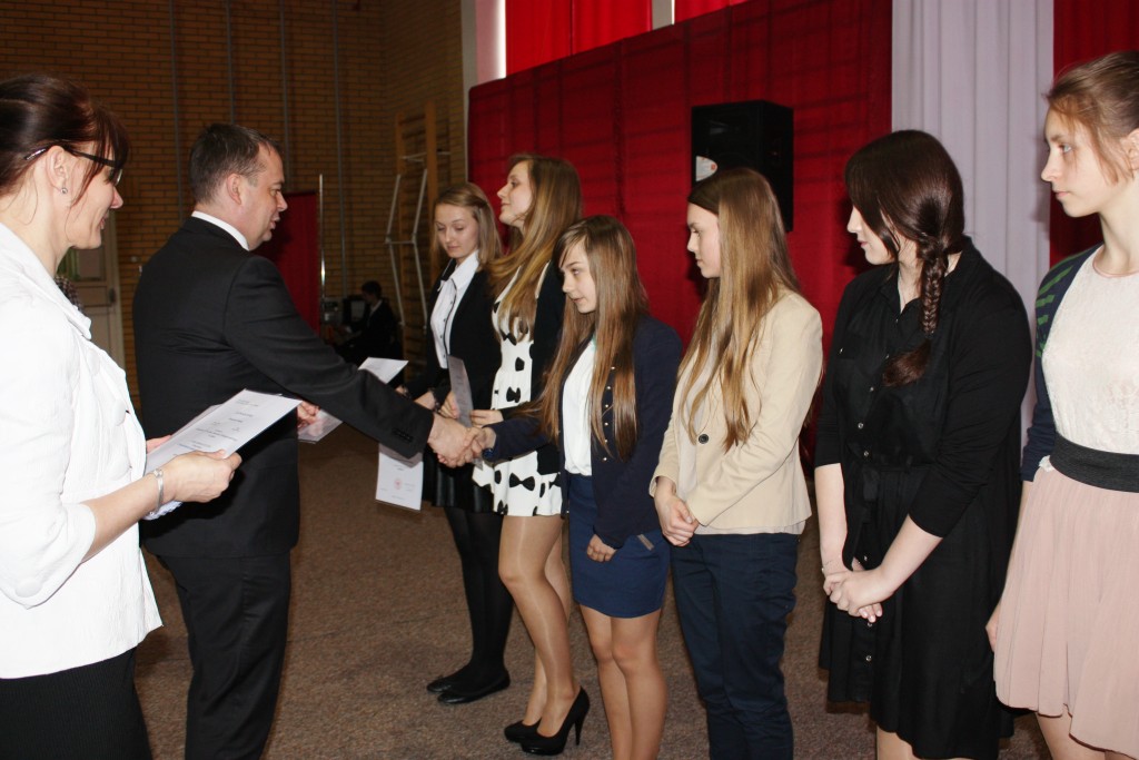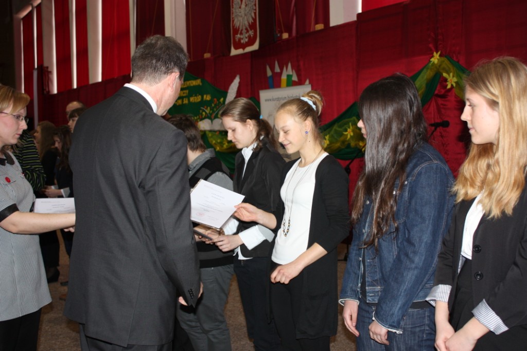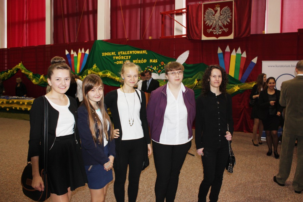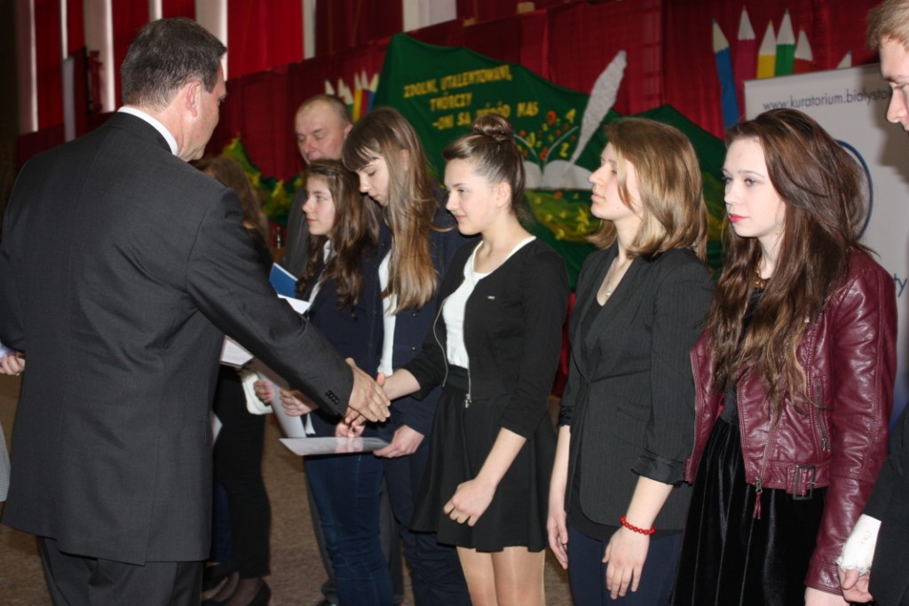 15.04.2014 r. w Białymstoku odbyło się wręczenie zaświadczeń o zdobyciu tytułu laureata w Wojewódzkim Konkursie Przedmiotowym. W tym roku z naszego gimnazjum tytuł ten zdobyli: Aleksandra Kozaczyńska z matematyki, Monika Bakun z biologii, Ewa Nowosada z języka polskiego, Gabriela Grynczel z języka polskiego, Ewa Kowalczuk z języka polskiego i Paweł Gliński z matematyki. Uczniowie ci będą zwolnieni z odpowiedniej części egzaminu gimnazjalnego, a na koniec roku szkolnego otrzymają 6. Zaświadczenia wręczał m.in. Podlaski Kurator Oświaty pan Jerzy Kiszkiel.