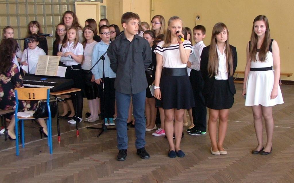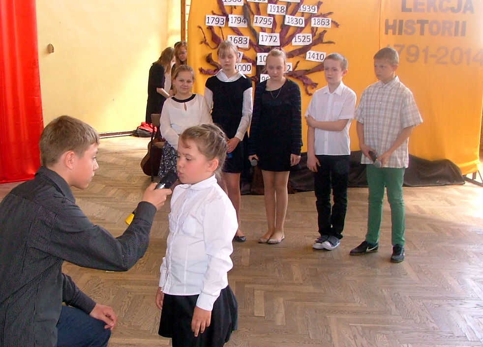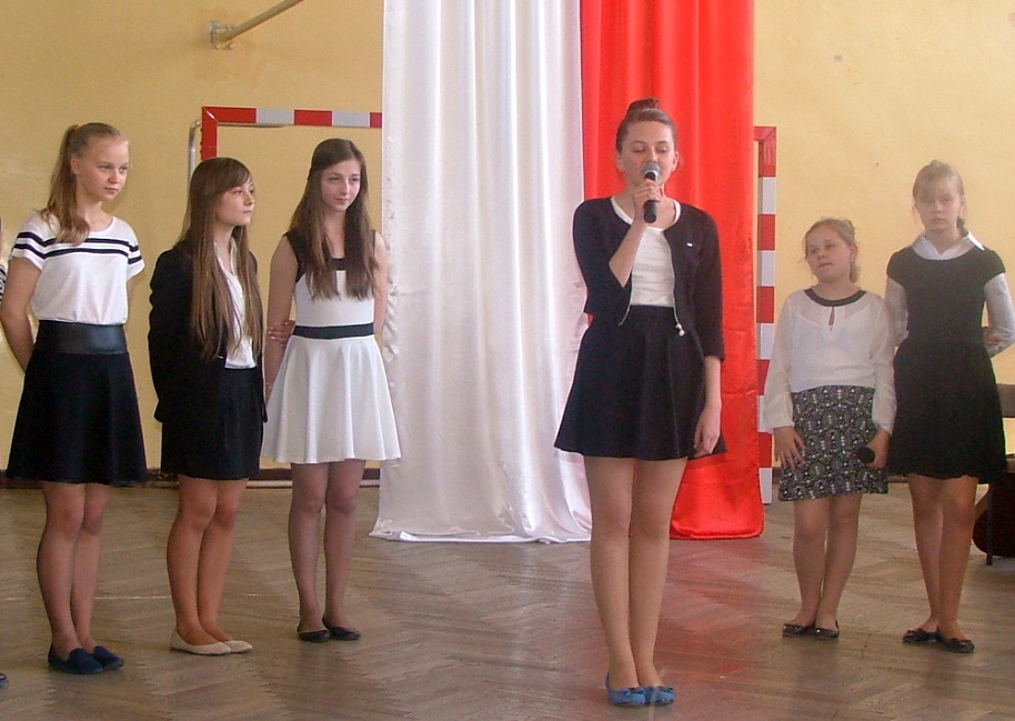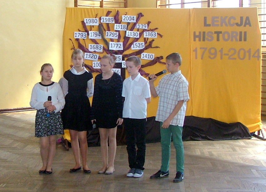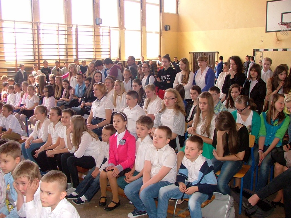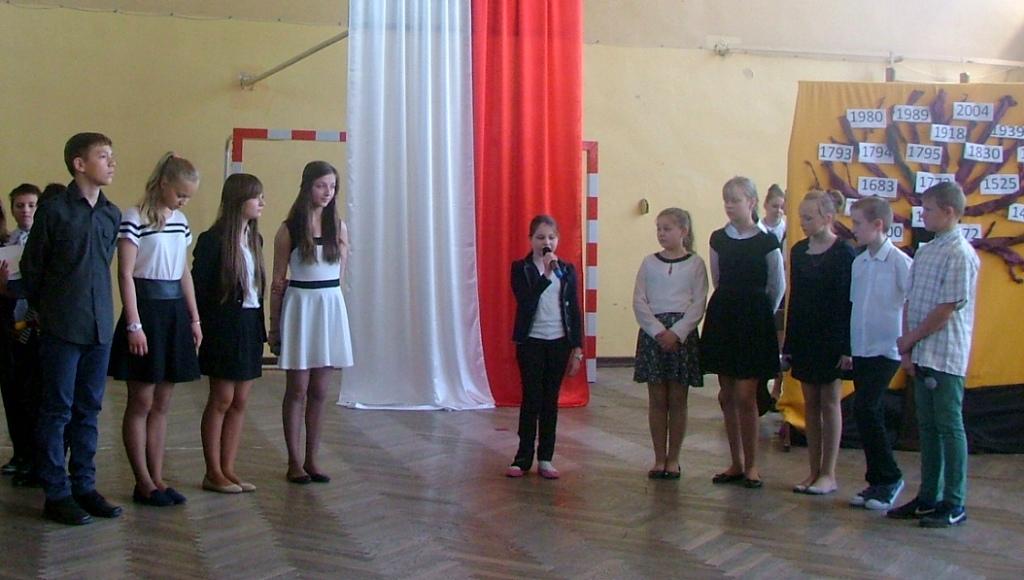 W dniu 30 kwietnia w naszej szkole odbyła się akademia z okazji rocznicy uchwalenia Konstytucji 3 maja. Przygotowały ja panie Katarzyna Daszuta, Ewa Dębko i Dorota Koprowska wraz z uczniami klas drugich gimnazjum, klasy Va i z Zespołem Muzycznym. Uroczystość miała formę lekcji historii, w czasie której starsi uczniowie opowiadali młodszym kolegom o ważnych wydarzeniach z naszej przeszłości, tłumaczyli trudne zwroty, takie jak „liberum veto”, przypomnieli postaci wielkich, polskich patriotów. Występowi towarzyszyła prezentacja multimedialna, występy solistów i Zespołu Muzycznego, recytacja wierszy. W nastrój zadumy wprowadzała też dekoracja w postaci drzewa z ważnymi datami z dziejów Polski. Dzięki takim uroczystościom i postawie młodego pokolenia rocznica ta była, jest i będzie obchodzona z dumą i świadomością jej znaczenia dla narodu polskiego.