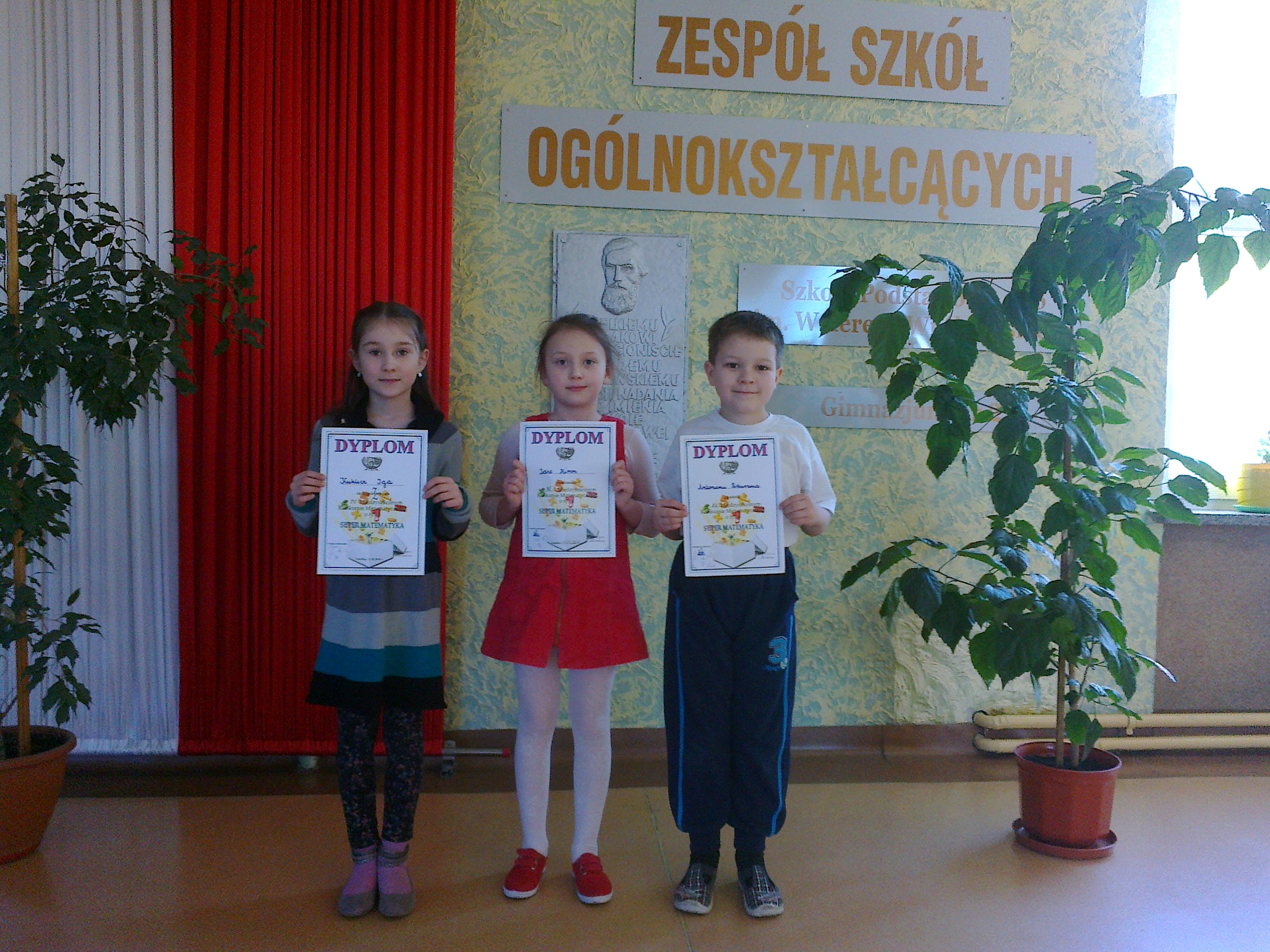 Poziom konkursu był bardzo wysoki, dzieci musiały zmierzyć z zupełnie innym typem zadań niż te, które rozwiązuje się na co dzień w klasie. Wymagały one dużej wiedzy matematycznej, logicznego myślenia, sprawnej techniki rachunkowej oraz pomysłowości i twórczego podejścia. Nasi przedstawiciele wypadli bardzo dobrze, pokazali, że Królowa Nauk, jaką jest bez wątpienia matematyka, nie jest aż taka straszna. I miejsce zajęła Iga Kuklicz, wyróżnienia zdobyły Iga Miron i Natalia Tołłoczko. Wszyscy uczestnicy turnieju oprócz dyplomów otrzymali też drobne upominki.