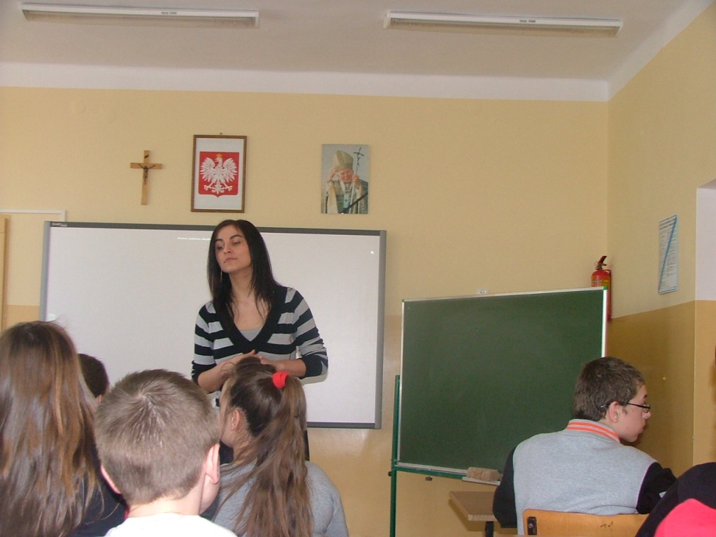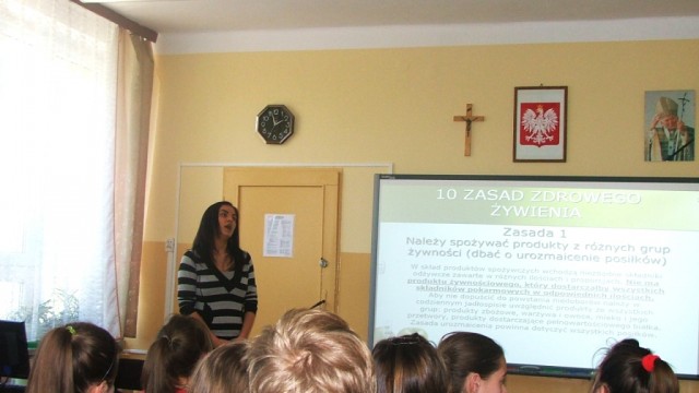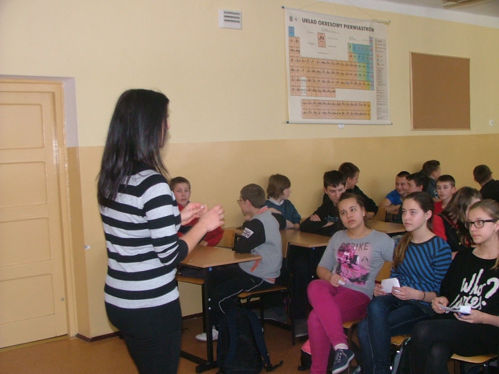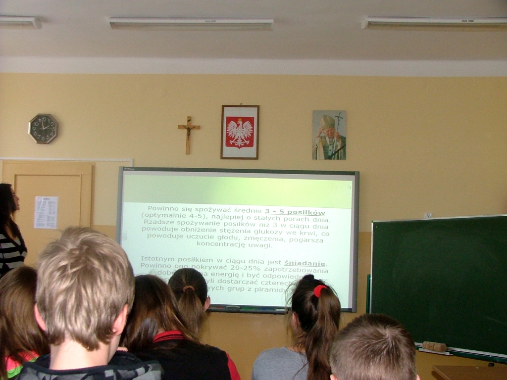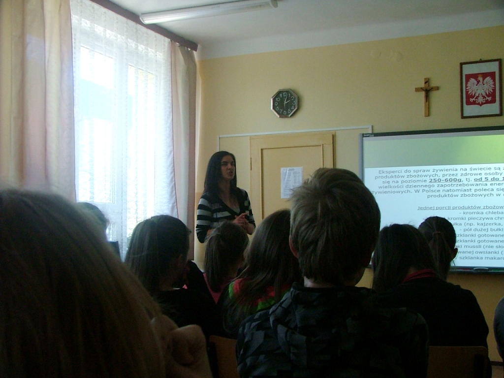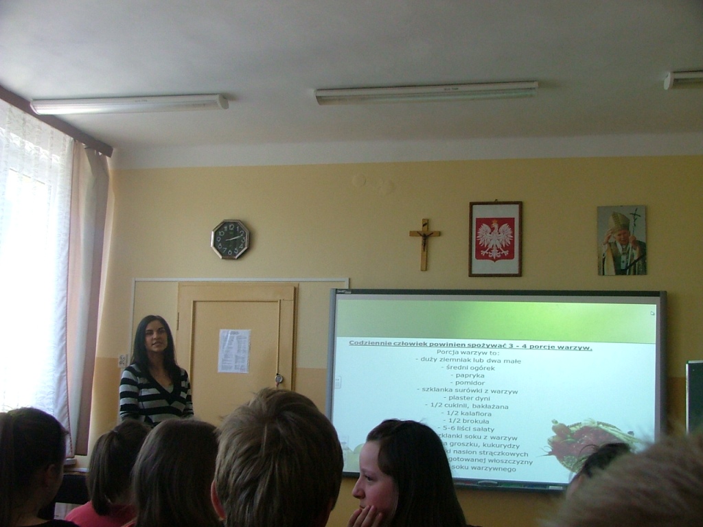 Dnia 12.03.14r. odbyło się spotkanie uczniów klas pierwszych gimnzjum z dietetykiem, panią Karoliną Bogusz na temat ,,Jak zdrowo i racjonalnie się odżywiać będąc nastolatkiem?”. Pani dietetyk przygotowała ciekawy wykład połączony z prezentacją multimedialną na temat zasad zdrowego odżywiania oraz wyczerpująco odpowiadała na zadawane przez młodzież pytania. W podziękowaniu za spotkanie uczniowie wręczyli pani dietetyk ,,kosz witamin” wypełniony owocami. Pomysł i organizacja spotkania – wychowawcy klas I: Alina Jakimiec i Katarzyna Chociej.