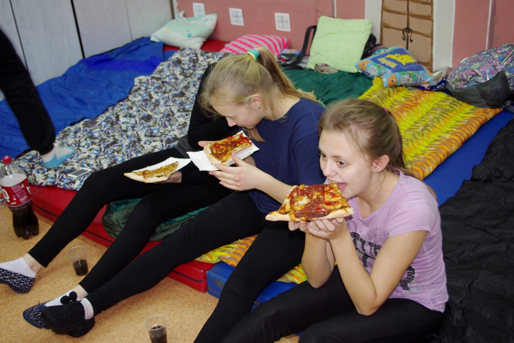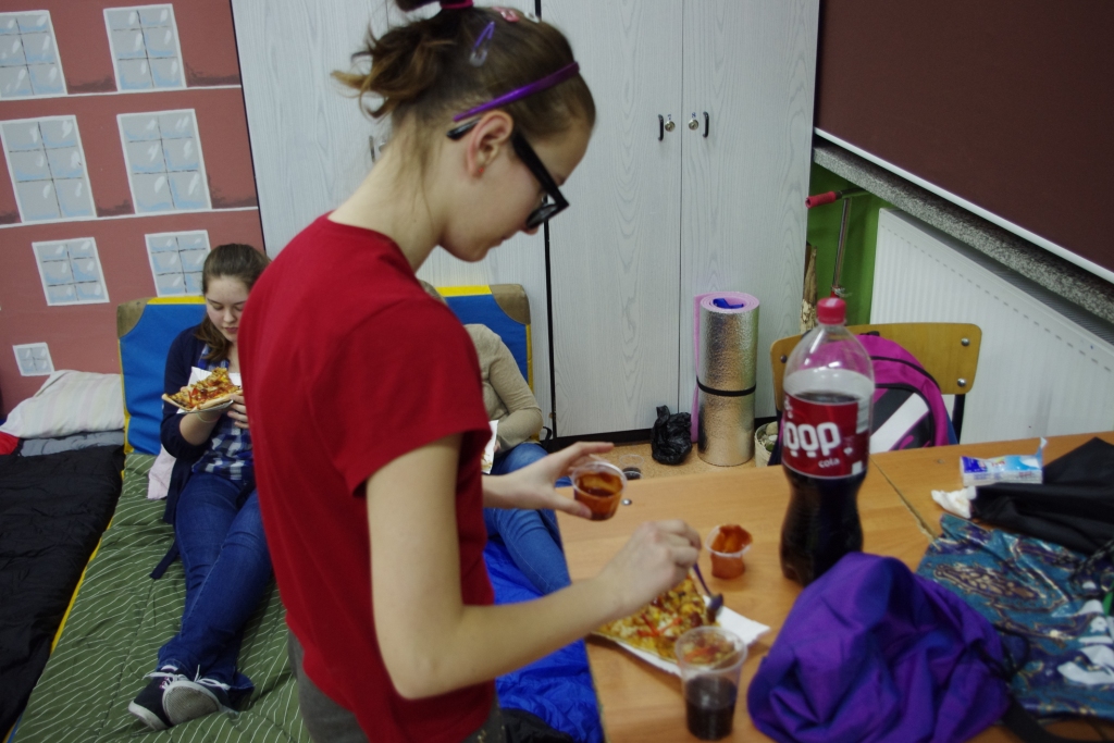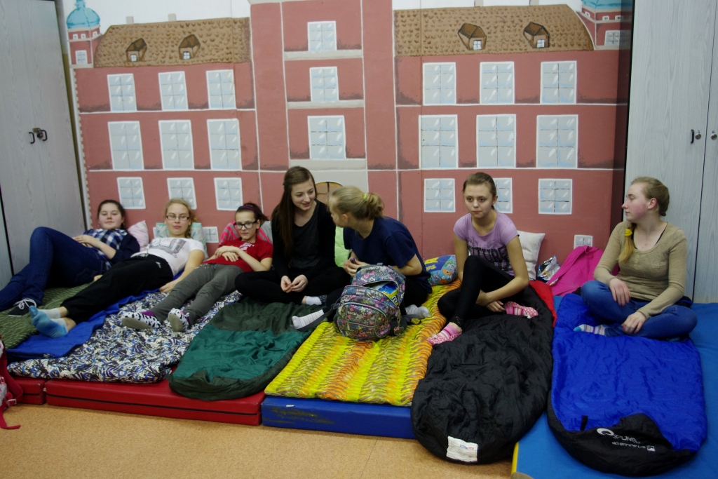 Klasa II b gimnazjum zorganizowała noc filmową. Uczniowie obejrzeli filmy pt. „Obecność”, „Ósmoklasiści nie płaczą” oraz „Angus, stringi i przytulanki”. Między filmami grali w „ziemniaka” w sali gimnastycznej. – Wszyscy bawiliśmy się świetnie i będziemy chcieli powtórzyć takie spotkanie – mówi uczennica biorąca udział w imprezie.