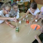 Klasy I-III naszej szkoły były w tym roku objęte programem innowacji pedagogicznej, realizowanej pod hasłem „W świecie małego odkrywcy”. Działanie to miało na celu pogłębienie wiedzy z zakresu edukacji przyrodniczej, przy jednoczesnym rozbudzeniu chęci poznania praw i zjawisk zachodzących w otaczającym świecie. Istotne było też zmotywowanie dzieci do samodzielnego poznawania otaczającej rzeczywistości i pokazanie, że nauka to coś więcej niż podręczniki i zeszyty. Uczniowie w grupach i indywidualnie wykonywali eksperymenty odnoszące się do sytuacji im bliskich, towarzyszących w codziennym życiu. Skaczące konfetti, pływające jajka, bańka w bańce, sztuczny śnieg, tornado w słoiku, samopompujące się baloniki, ciecz newtonowska – to tylko przykładowe eksperymenty, proste, ale bardzo efektowne. Na zajęciach używano materiałów, które są powszechnie dostępne, więc niektóre z nich, te najfajniejsze i najbardziej atrakcyjne, były powtarzane przez dzieci w domu. Samodzielne wykonywanie badań było dla uczniów ciekawym doświadczeniem i doskonałym pomysłem na to, aby włączyć się w sposób aktywny w proces zdobywania wiedzy. Odpowiedni dobór ćwiczeń uatrakcyjniał zajęcia. Ponadto uczniowie poznali dodatkowe zastosowanie materiałów codziennego użytku, dzięki którym lepiej zrozumieli tajniki otaczającego ich świata.