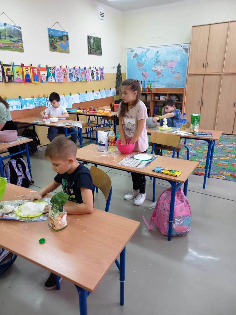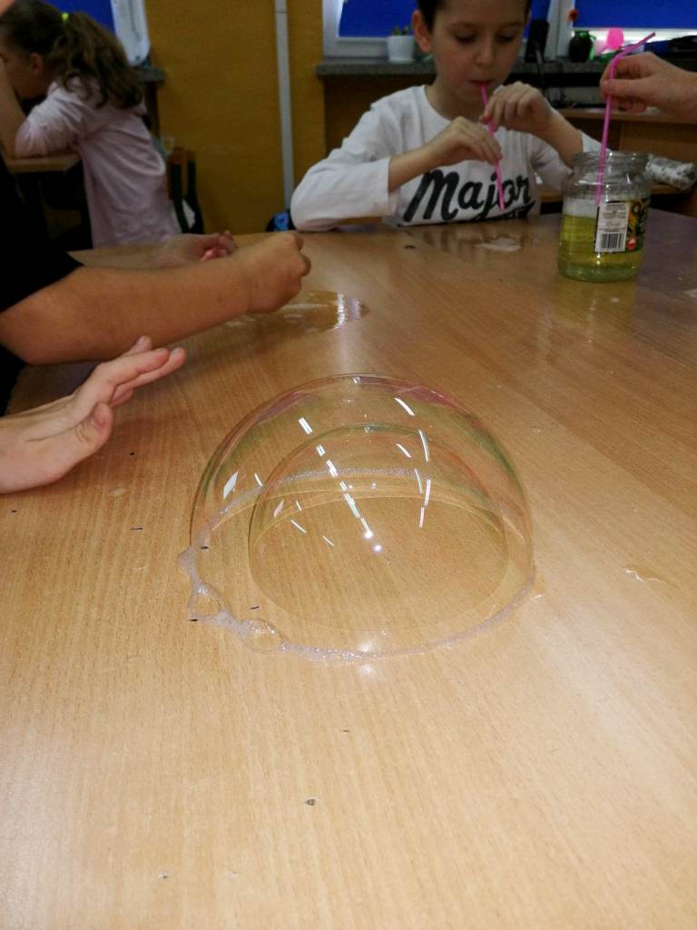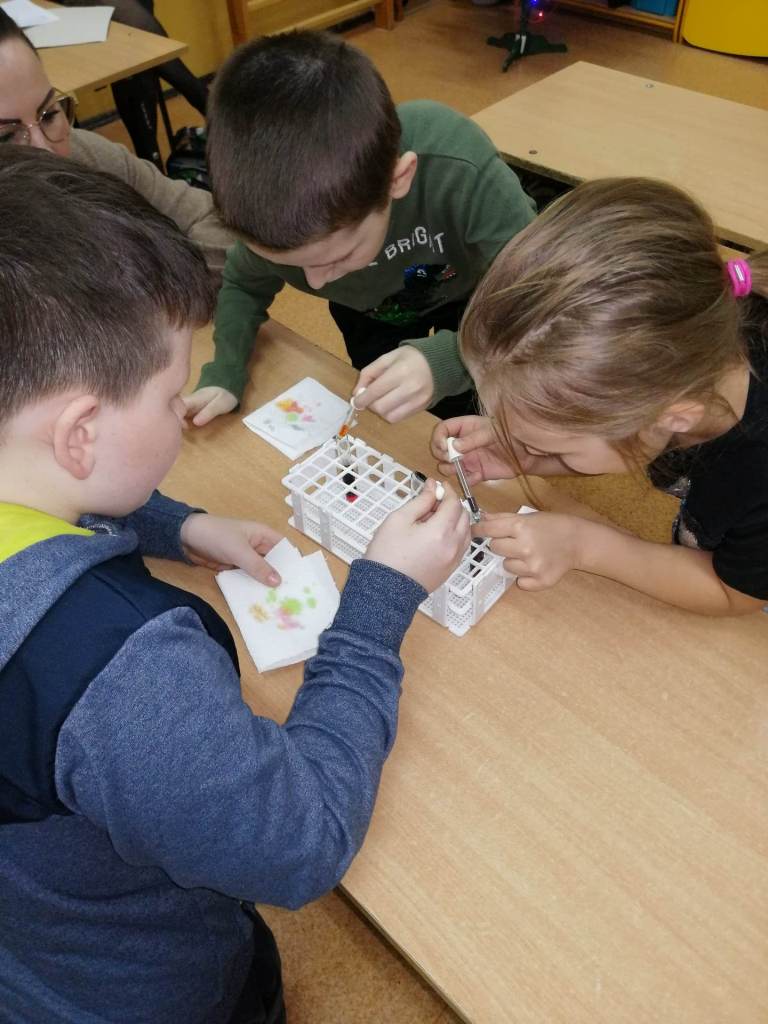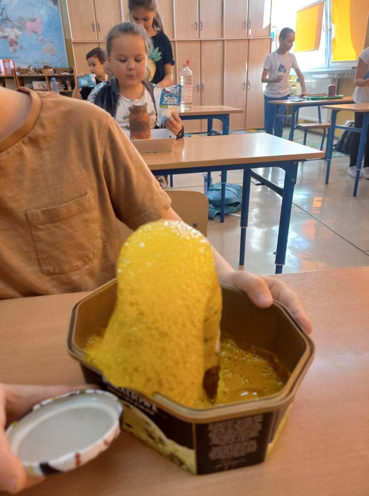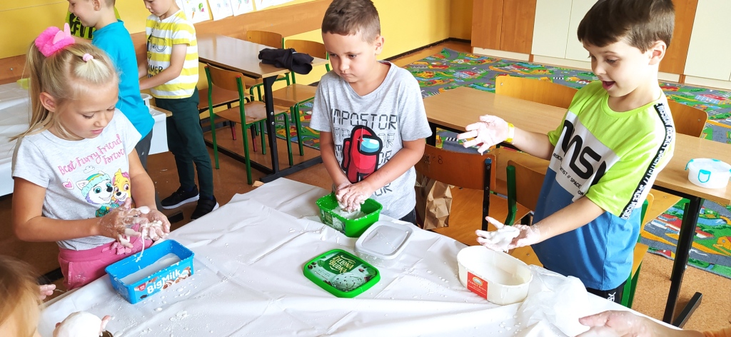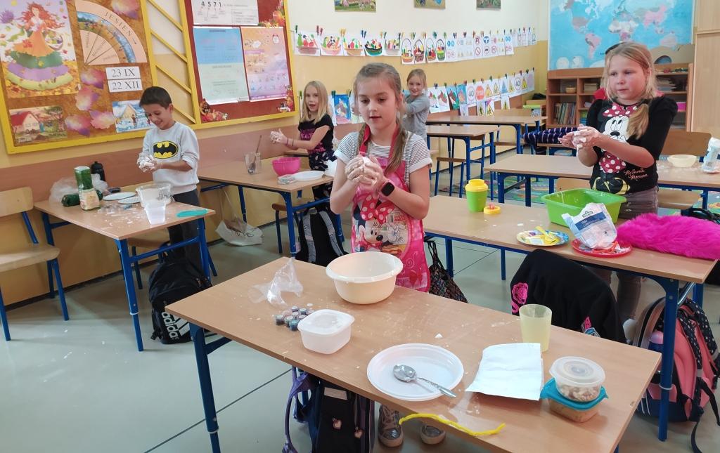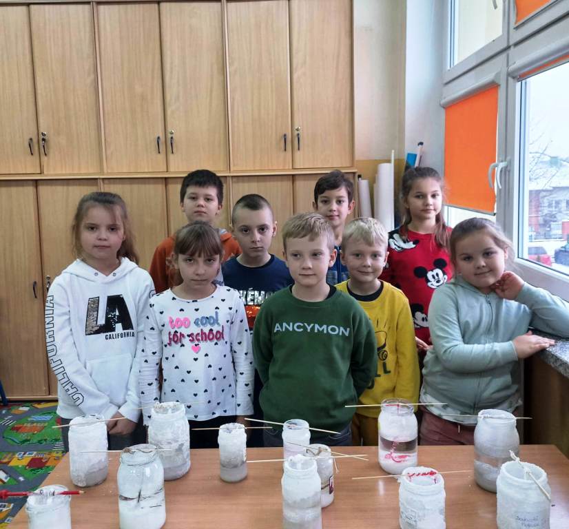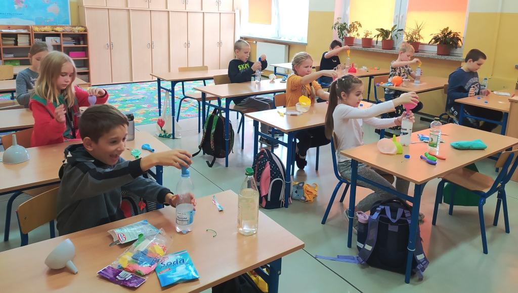 Klasy I-III naszej szkoły były w tym roku objęte programem innowacji pedagogicznej, realizowanej pod hasłem „W świecie małego odkrywcy”. Działanie to miało na celu pogłębienie wiedzy z zakresu edukacji przyrodniczej, przy jednoczesnym rozbudzeniu chęci poznania praw i zjawisk zachodzących w otaczającym świecie. Istotne było też zmotywowanie dzieci do samodzielnego poznawania otaczającej rzeczywistości i pokazanie, że nauka to coś więcej niż podręczniki i zeszyty. Uczniowie w grupach i indywidualnie wykonywali eksperymenty odnoszące się do sytuacji im bliskich, towarzyszących w codziennym życiu. Skaczące konfetti, pływające jajka, bańka w bańce, sztuczny śnieg, tornado w słoiku, samopompujące się baloniki, ciecz newtonowska – to tylko przykładowe eksperymenty, proste, ale bardzo efektowne. Na zajęciach używano materiałów, które są powszechnie dostępne, więc niektóre z nich, te najfajniejsze i najbardziej atrakcyjne, były powtarzane przez dzieci w domu. Samodzielne wykonywanie badań było dla uczniów ciekawym doświadczeniem i doskonałym pomysłem na to, aby włączyć się w sposób aktywny w proces zdobywania wiedzy. Odpowiedni dobór ćwiczeń uatrakcyjniał zajęcia. Ponadto uczniowie poznali dodatkowe zastosowanie materiałów codziennego użytku, dzięki którym lepiej zrozumieli tajniki otaczającego ich świata.