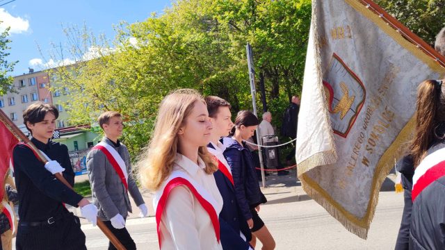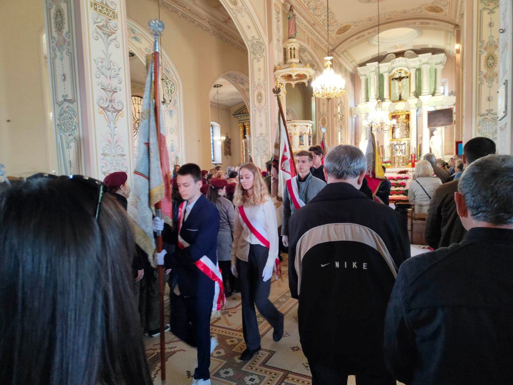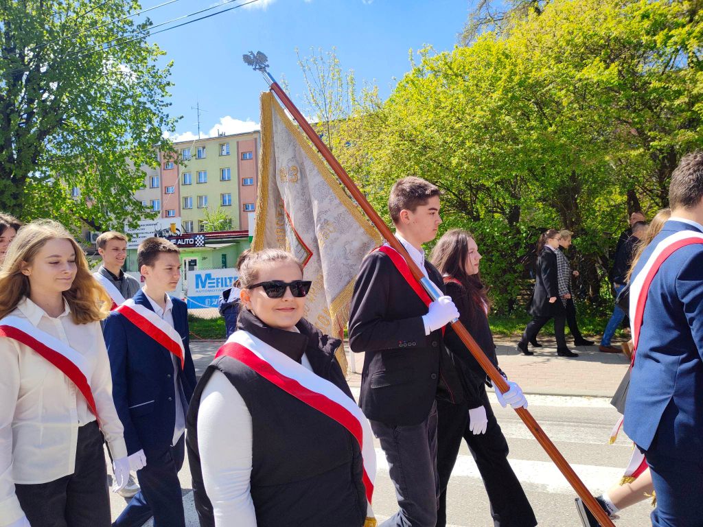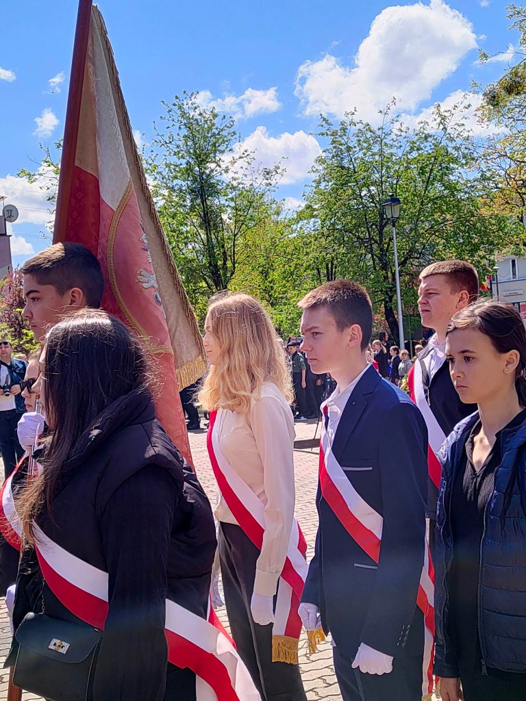 Poczet sztandarowy naszej szkoły podczas gminnych obchodów rocznicy Konstytucji 3 Maja – 3 maja 2023 r.