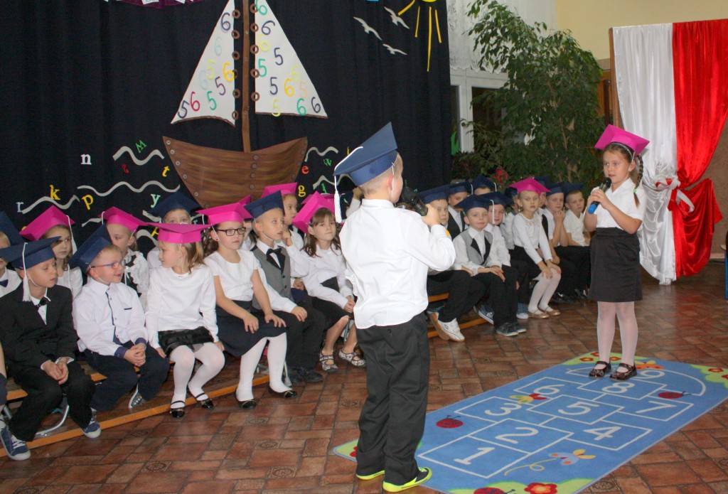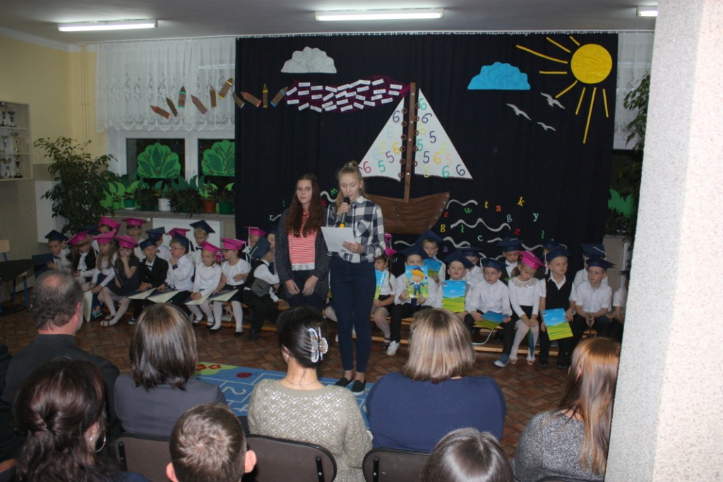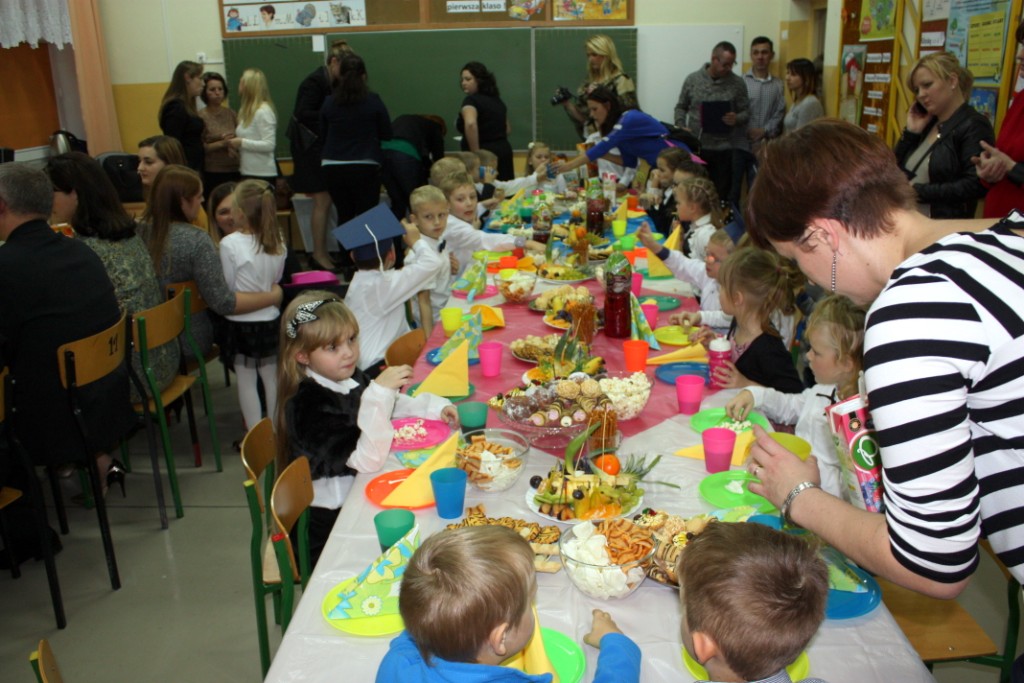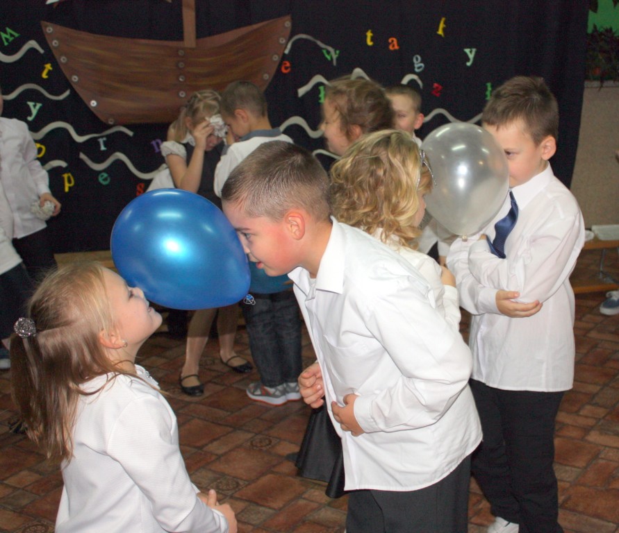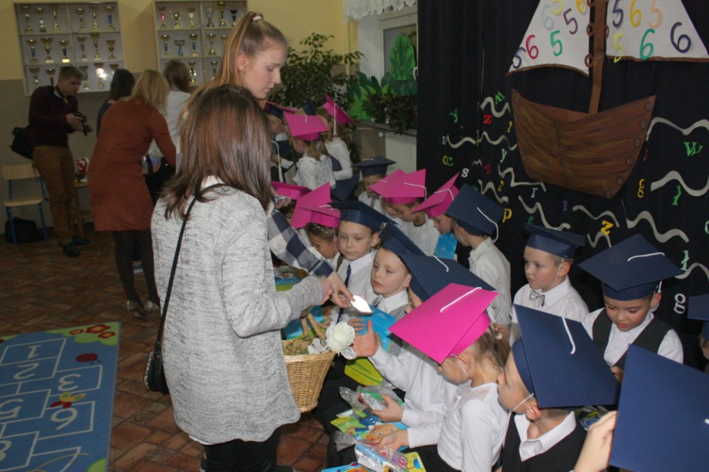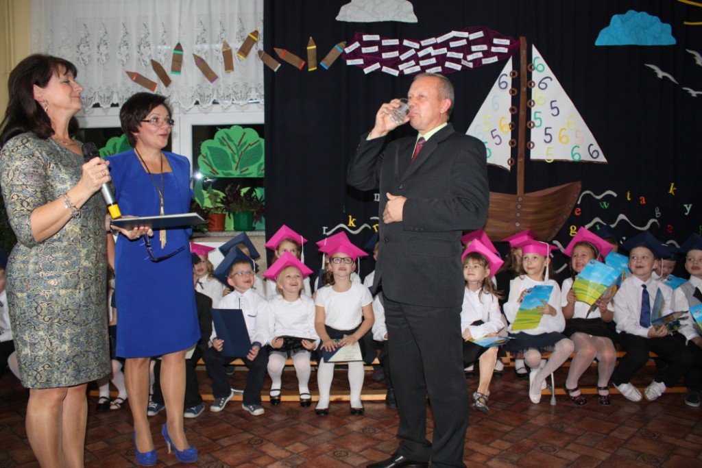 W dniu 29 października w naszej szkole odbyła się uroczystość Pasowania na Ucznia. Pierwszaki przygotowywały się do tego ceremoniału od początku roku szkolnego, poprzez naukę wierszyków, słów piosenek, tańca, tekstów w języku angielskim. Tego popołudnia panowała niezwykle uroczysta atmosfera, którą podkreślał nie tylko galowy strój uczniów, ale też obecność wielu ważnych gości: pana burmistrza Adama Kowalczuka, pani dyrektor Anny Andrzejewskiej i pani Marii Zaulicznej, wychowawczyń z przedszkola, przedstawicieli Rady Pedagogicznej, opiekunów Samorządu Uczniowskiego, rodziców. Motywem przewodnim scenografii, autorstwa pani Jolanty Paruk, był żaglowiec „Marzyciel”, napędzany wiatrem piątek i szóstek, którym dzieci popłynęły przez oceany wiedzy i świat wyobraźni. Chociaż część artystyczna wypadła znakomicie, to pretendenci do miana ucznia musieli na koniec wypić Napój Shreka – magiczna miksturę mocy, składającą się z różnych tajemniczych substancji, zapewniających powodzenie w szkole. Kolejną niespodzianką było to, że aktu pasowania dostąpiły nie tylko dzieci, ale i …pan Burmistrz. Pan Adam Kowalczuk został pasowany na Przyjaciela Szkoły i z tego powodu musiał bez skrzywienia się wypić sok z cytryny. Na koniec nie zabrakło życzeń od nauczycieli, młodzieży z Samorządu Uczniowskiego, rodziców. Miłym akcentem było wręczeniem nowo mianowanym żaczkom drobnych upominków w postaci gadżetów, słodkości i książeczek do kącika czytelniczego. Uroczystość zakończył słodki poczęstunek i zabawy prowadzone przez dziewczęta z Samorządu Szkolnego.