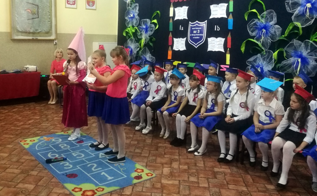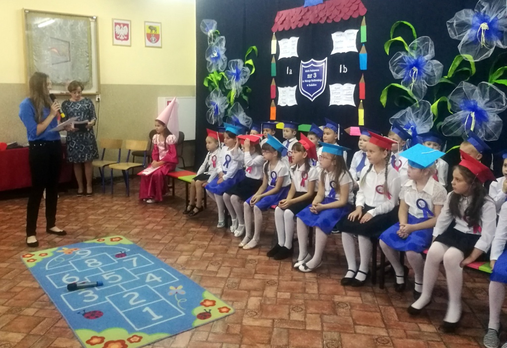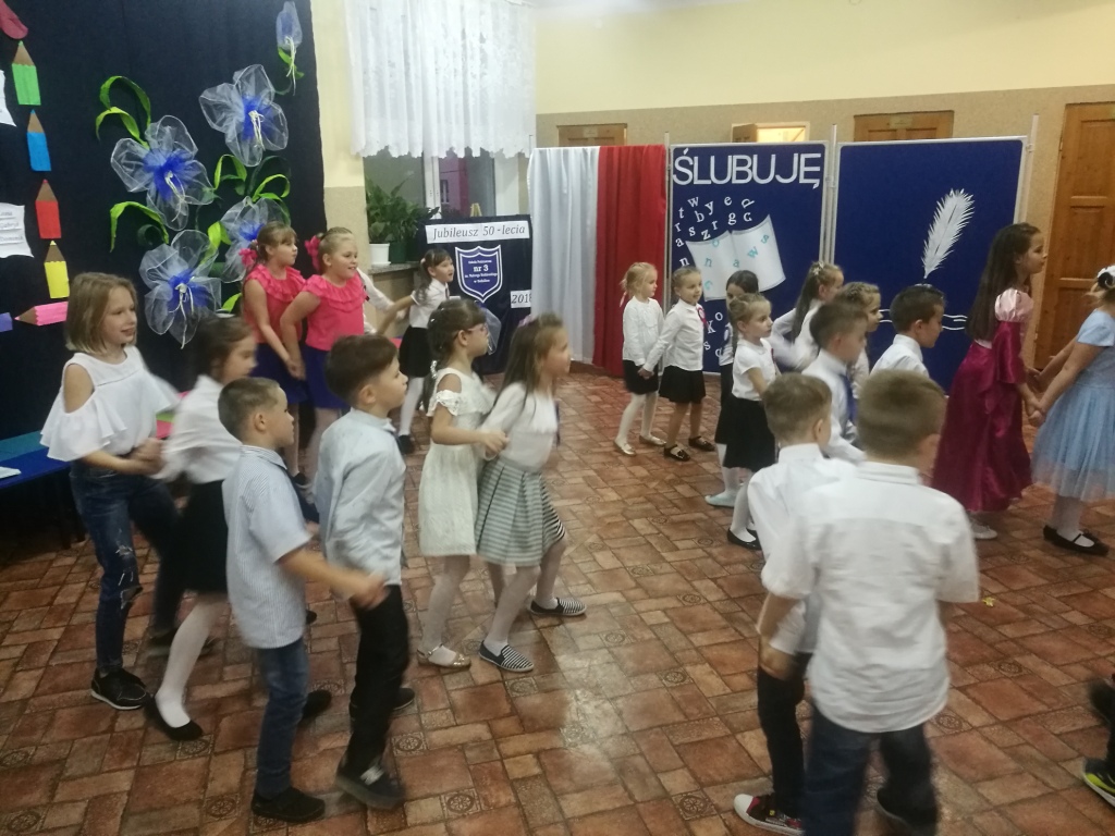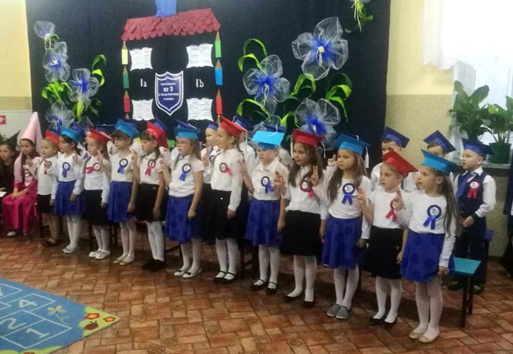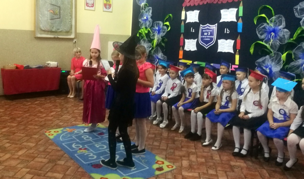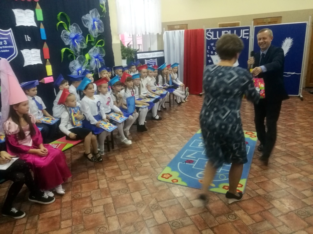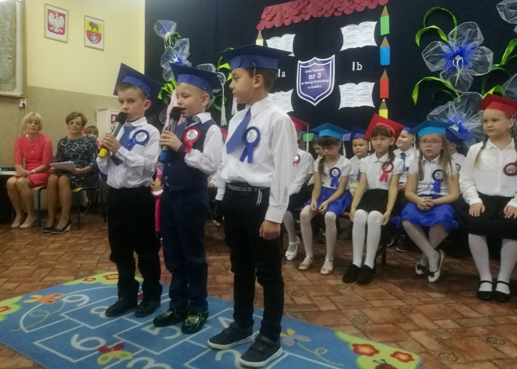 W dniu 25 X 2018 r. w Szkole Podstawowej nr 3 w Sokółce odbyła się uroczystość Pasowania na Ucznia. To jeden z najważniejszych dni w szkolnym życiu pierwszaków, gdyż od tego momentu stają się pełnoprawnymi uczniami szkolnej społeczności. Chłopcy i dziewczynki z klas pierwszych przygotowywali się do tej ceremonii od początku roku szkolnego pod okiem wychowawczyń. Uczyli się dzielnie tekstów, wierszy, piosenek polskich i po angielsku, tańca, wytrwale ćwiczyli podczas licznych prób. Wszystkich pozytywnie motywowała świadomość, że występ odbędzie się w obecności licznych gości. Na uroczystość przybyli: pan burmistrz Adam Kowalczuk, pani dyrektor Anna Andrzejewska, wychowawczynie z przedszkola, członkowie Rady Pedagogicznej, przedstawiciele Samorządu Uczniowskiego, rodzice, rodzeństwo oraz przyjaciele dzieci. Podniosły nastrój spotkania podkreślały odświętne stroje żaczków oraz piękna dekoracja, przygotowana przez panią Jolantę Paruk. W czasie występu przejętym pierwszakom towarzyszyła Dobra Wróżka, prowadząca ich przez różnorodne krainy i Czarna Wróżka, która troszkę tę podróż utrudniała. Dzieci wypadły znakomicie, pokazały, jak wiele już umieją, a kiedy na koniec połknęły tabletkę wiedzy i popiły eliksirem mądrości, to o ich naukę chyba możemy być spokojni. Po złożeniu ślubowania nastąpił akt pasowania i wręczenie pamiątkowych dyplomów. Nie zabrakło też wielu życzeń, słodkości i upominków od przybyłych gości. Po części oficjalnej wszyscy udali się na słodki poczęstunek, a następnie starsi koledzy zorganizowali pierwszakom zabawy taneczno-muzyczne.