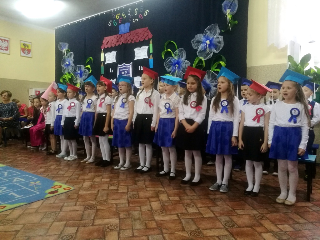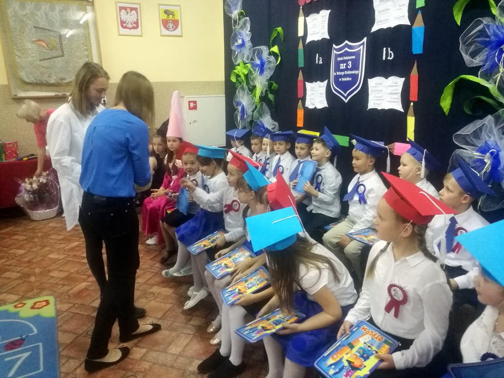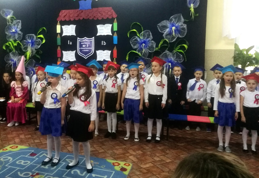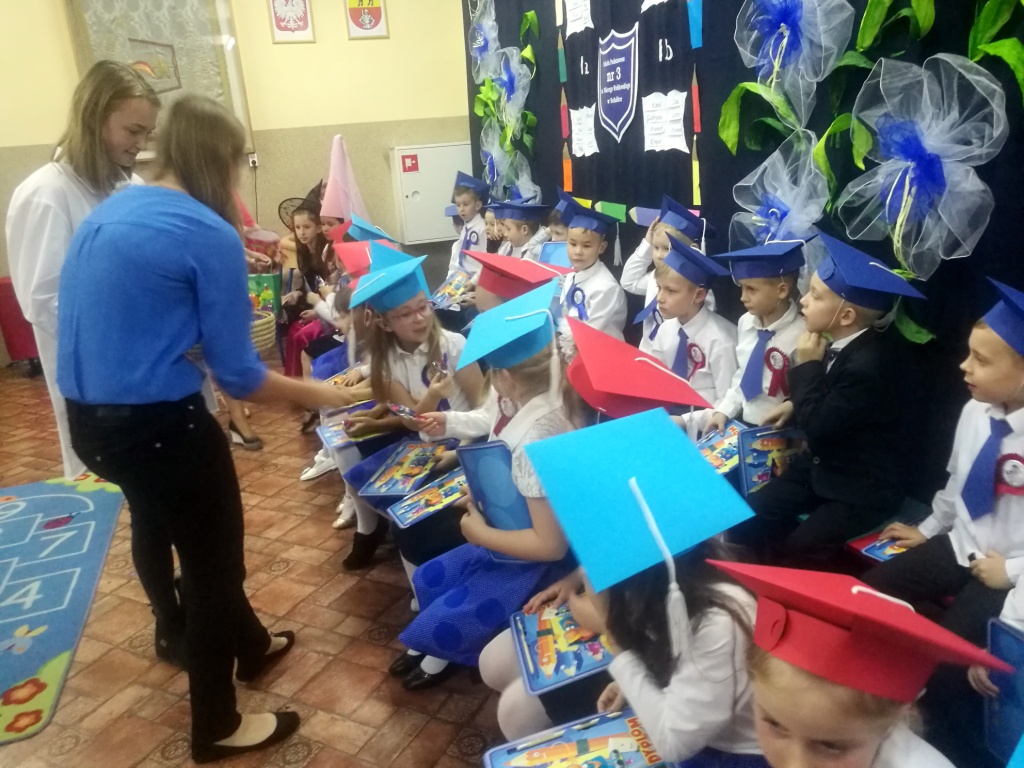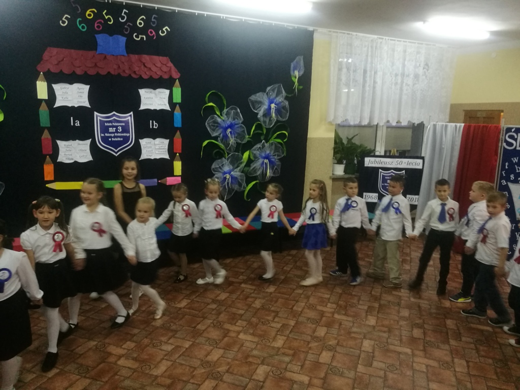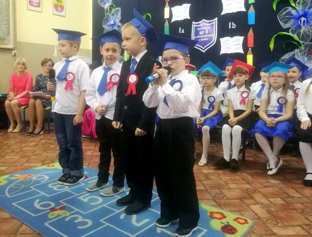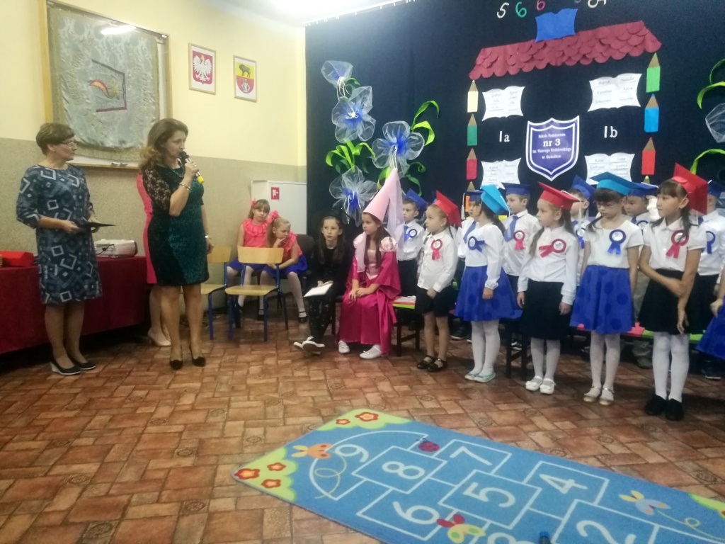 W dniu 25 X 2018 r. w Szkole Podstawowej nr 3 w Sokółce odbyła się uroczystość Pasowania na Ucznia. To jeden z najważniejszych dni w szkolnym życiu pierwszaków, gdyż od tego momentu stają się pełnoprawnymi uczniami szkolnej społeczności. Chłopcy i dziewczynki z klas pierwszych przygotowywali się do tej ceremonii od początku roku szkolnego pod okiem wychowawczyń. Uczyli się dzielnie tekstów, wierszy, piosenek polskich i po angielsku, tańca, wytrwale ćwiczyli podczas licznych prób. Wszystkich pozytywnie motywowała świadomość, że występ odbędzie się w obecności licznych gości. Na uroczystość przybyli: pan burmistrz Adam Kowalczuk, pani dyrektor Anna Andrzejewska, wychowawczynie z przedszkola, członkowie Rady Pedagogicznej, przedstawiciele Samorządu Uczniowskiego, rodzice, rodzeństwo oraz przyjaciele dzieci. Podniosły nastrój spotkania podkreślały odświętne stroje żaczków oraz piękna dekoracja, przygotowana przez panią Jolantę Paruk. W czasie występu przejętym pierwszakom towarzyszyła Dobra Wróżka, prowadząca ich przez różnorodne krainy i Czarna Wróżka, która troszkę tę podróż utrudniała. Dzieci wypadły znakomicie, pokazały, jak wiele już umieją, a kiedy na koniec połknęły tabletkę wiedzy i popiły eliksirem mądrości, to o ich naukę chyba możemy być spokojni. Po złożeniu ślubowania nastąpił akt pasowania i wręczenie pamiątkowych dyplomów. Nie zabrakło też wielu życzeń, słodkości i upominków od przybyłych gości. Po części oficjalnej wszyscy udali się na słodki poczęstunek, a następnie starsi koledzy zorganizowali pierwszakom zabawy taneczno-muzyczne.