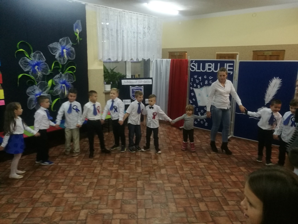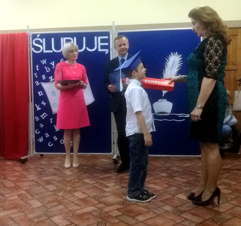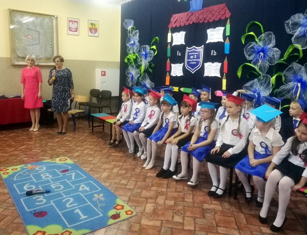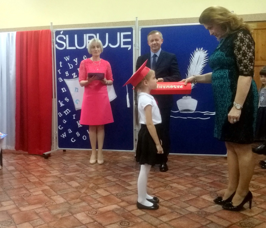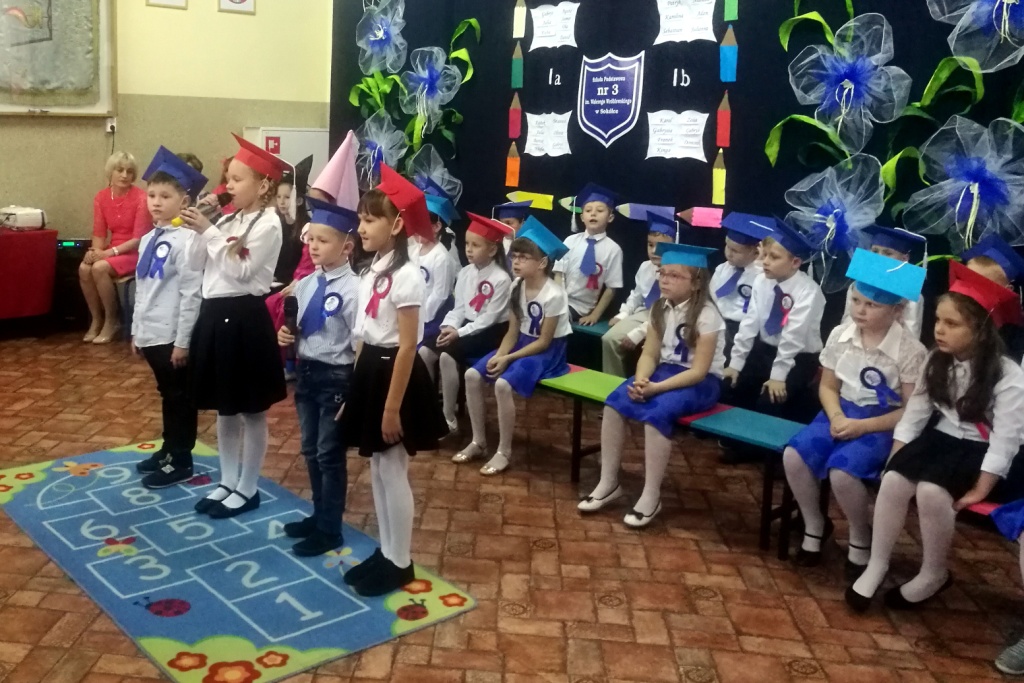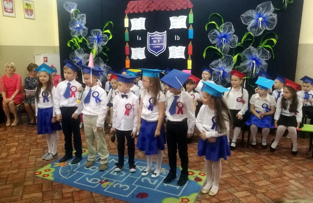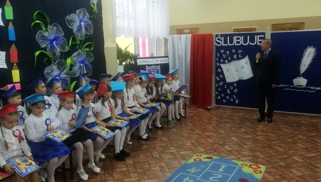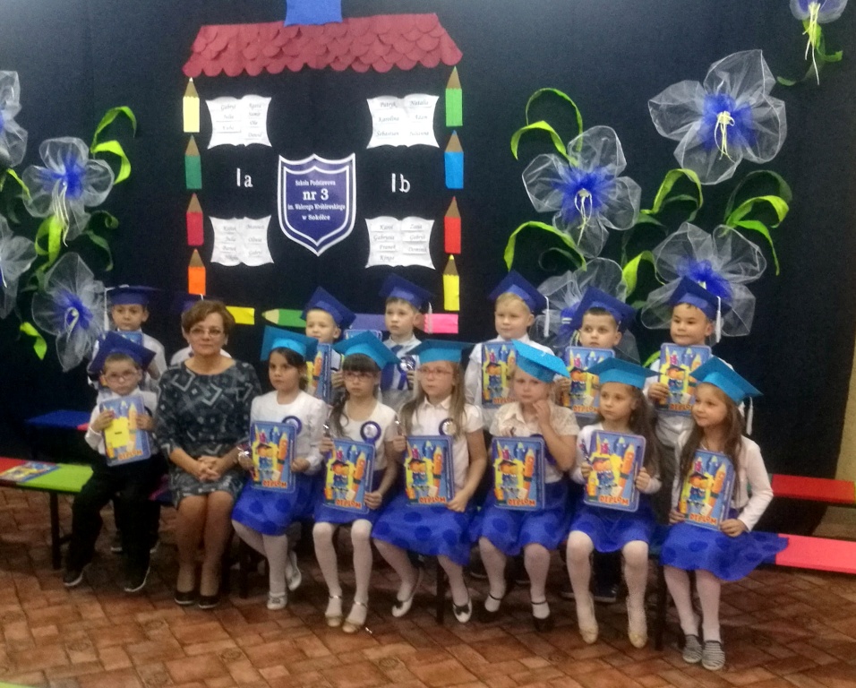 W dniu 25 X 2018 r. w Szkole Podstawowej nr 3 w Sokółce odbyła się uroczystość Pasowania na Ucznia. To jeden z najważniejszych dni w szkolnym życiu pierwszaków, gdyż od tego momentu stają się pełnoprawnymi uczniami szkolnej społeczności. Chłopcy i dziewczynki z klas pierwszych przygotowywali się do tej ceremonii od początku roku szkolnego pod okiem wychowawczyń. Uczyli się dzielnie tekstów, wierszy, piosenek polskich i po angielsku, tańca, wytrwale ćwiczyli podczas licznych prób. Wszystkich pozytywnie motywowała świadomość, że występ odbędzie się w obecności licznych gości. Na uroczystość przybyli: pan burmistrz Adam Kowalczuk, pani dyrektor Anna Andrzejewska, wychowawczynie z przedszkola, członkowie Rady Pedagogicznej, przedstawiciele Samorządu Uczniowskiego, rodzice, rodzeństwo oraz przyjaciele dzieci. Podniosły nastrój spotkania podkreślały odświętne stroje żaczków oraz piękna dekoracja, przygotowana przez panią Jolantę Paruk. W czasie występu przejętym pierwszakom towarzyszyła Dobra Wróżka, prowadząca ich przez różnorodne krainy i Czarna Wróżka, która troszkę tę podróż utrudniała. Dzieci wypadły znakomicie, pokazały, jak wiele już umieją, a kiedy na koniec połknęły tabletkę wiedzy i popiły eliksirem mądrości, to o ich naukę chyba możemy być spokojni. Po złożeniu ślubowania nastąpił akt pasowania i wręczenie pamiątkowych dyplomów. Nie zabrakło też wielu życzeń, słodkości i upominków od przybyłych gości. Po części oficjalnej wszyscy udali się na słodki poczęstunek, a następnie starsi koledzy zorganizowali pierwszakom zabawy taneczno-muzyczne.