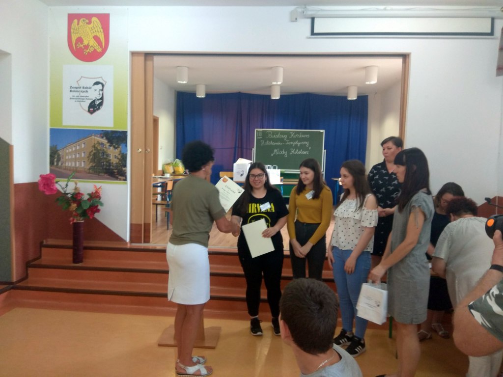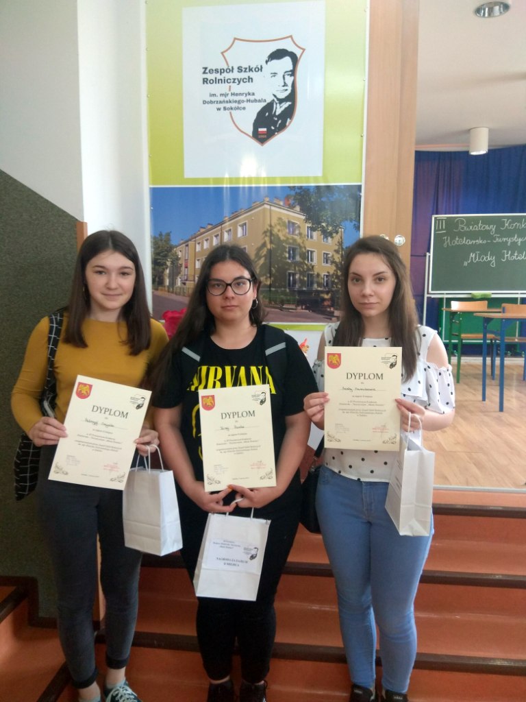 7 czerwca w Zespole Szkół Rolniczych im. mjr Henryka Dobrzańskiego – Hubala w Sokółce odbył się III Powiatowy Konkurs Hotelarsko-Turystyczny Młody Hotelarz. Uczestnikami byli uczniowie ze szkół powiatu sokólskiego. Uczniowie zmagali się z zadaniami w trzyosobowych grupach. Naszą szkołę reprezentowały Kinga Puszko, Beata Saniukiewicz oraz Patrycja Szyszko. Konkurs składał się z dwóch etapów. Pierwszy etap polegał na dekoracyjnym składaniu serwet, ścieleniu łóżka na czas oraz nakrywaniu i dekorowaniu stołu. Drugi etap polegał na rozwiązaniu testu dotyczącego atrakcji turystycznych powiatu sokólskiego. Nasze uczennice zajęły drugie miejsce, otrzymując w nagrodę voucher na pizzę w pizzerii Peperoni w Sokółce, sprzęt elektroniczny (power bank) oraz artykuły piśmiennicze. Gratulujemy!