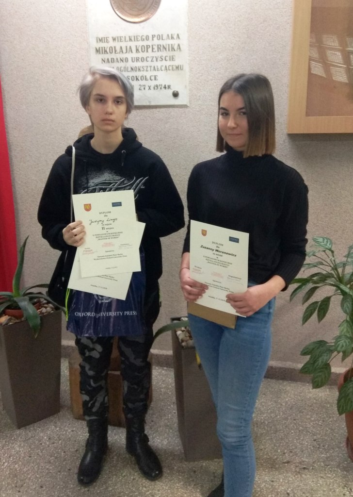 Dnia 17.12.2018r. uczennice klasy III gimnazjum Zuzanna Woronowicz i Justyna Lingo reprezentowały naszą szkołę w II Powiatowym Konkursie Języka Angielskiego „Master of words” . Justyna uzyskała II miejsce w kategorii klas gimnazjalnych. Gratulujemy!