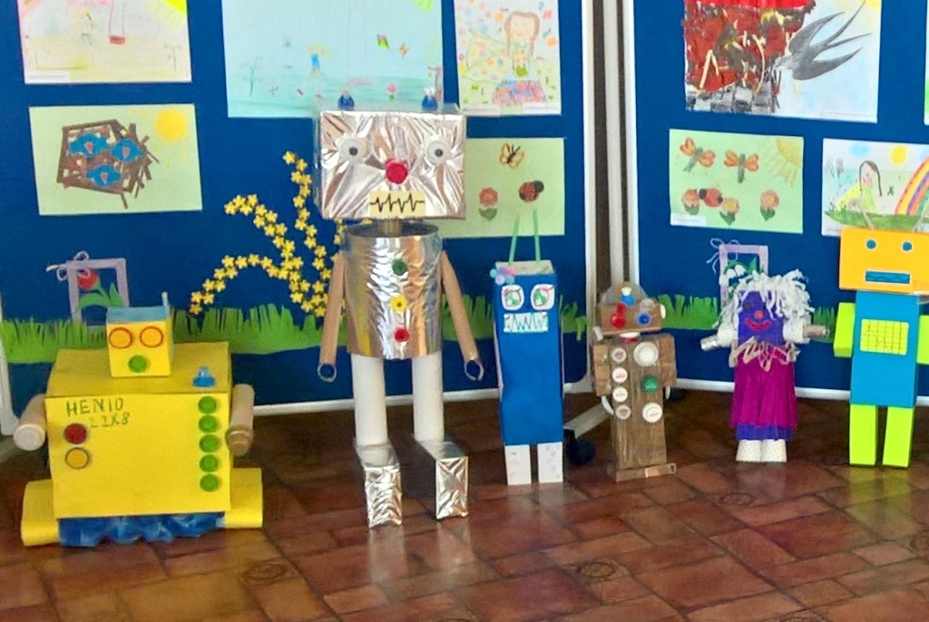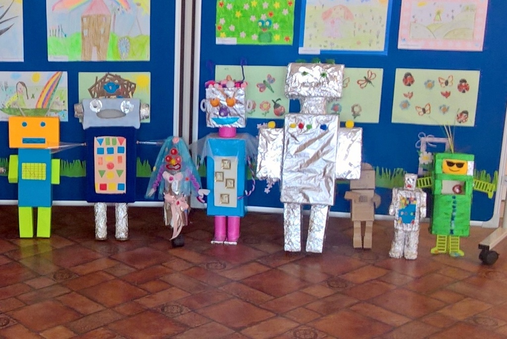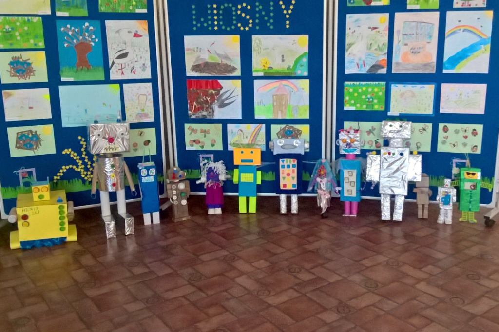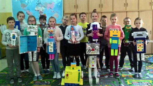 Dzieci z klasy III a przygotowały wystawę robotów z materiałów wtórnych. Było to zadanie domowe, do wspólnego wykonania z rodzicami. Jak widać praca została potraktowana poważnie, wykonana perfekcyjnie, pomysłowo i z poczuciem humoru. Wśród eksponatów znalazły się m.in.: robot-panna młoda, robot-lodówka oraz robotopies. Ta nietypowa praca domowa stanowiła część realizacji materiału programowego, ale pokazała też, że z rodzicami można wspólnie twórczo spędzić czas i wyczarować coś, co wzbudziło miłe zainteresowanie uczniów naszej szkoły. Wszystkie roboty zostały ocenione na szóstkę.