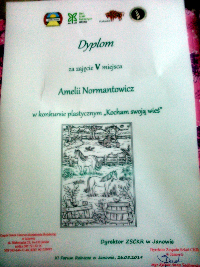 Uczniowie naszej szkoły po raz kolejny brali udział w konkursie plastycznym organizowanym przez Zespół Szkół Centrum Kształcenia Rolniczego w Janowie W tym roku odbyło się XI Forum Rolnicze w ramach którego zorganizowano konkurs plastyczny pod hasłem „Kocham swoją wieś”. Należy wspomnieć, że rok temu również uczennica naszej szkoły Magda Szydłowska została laureatką konkursu plastycznego, a w tym roku: