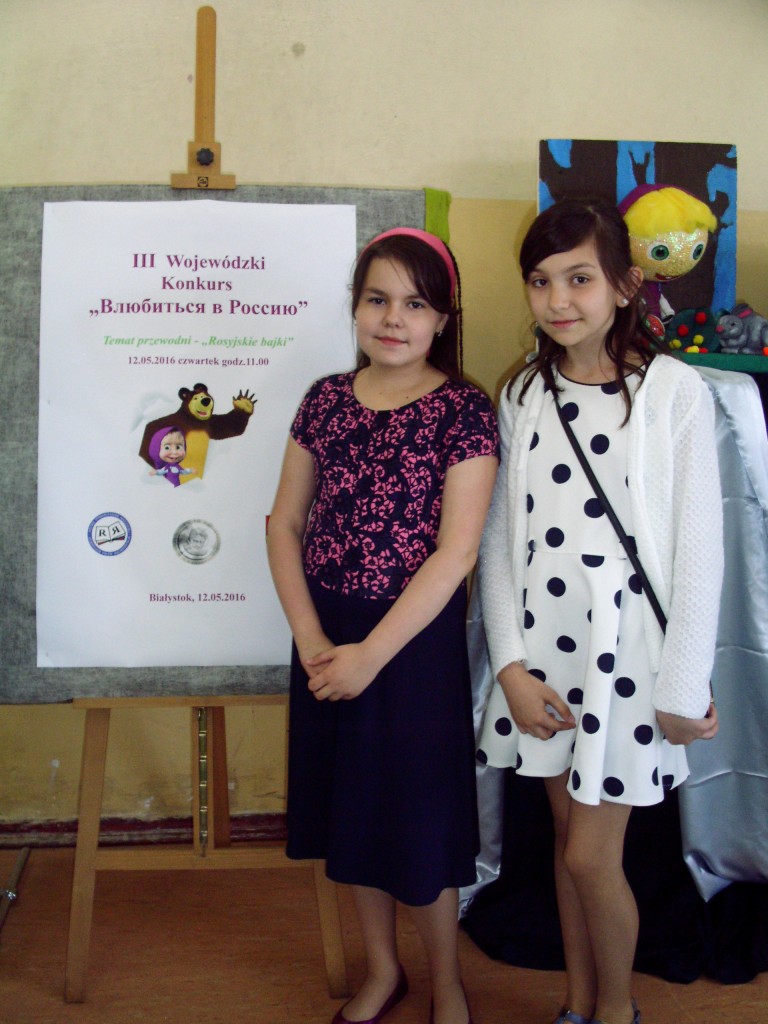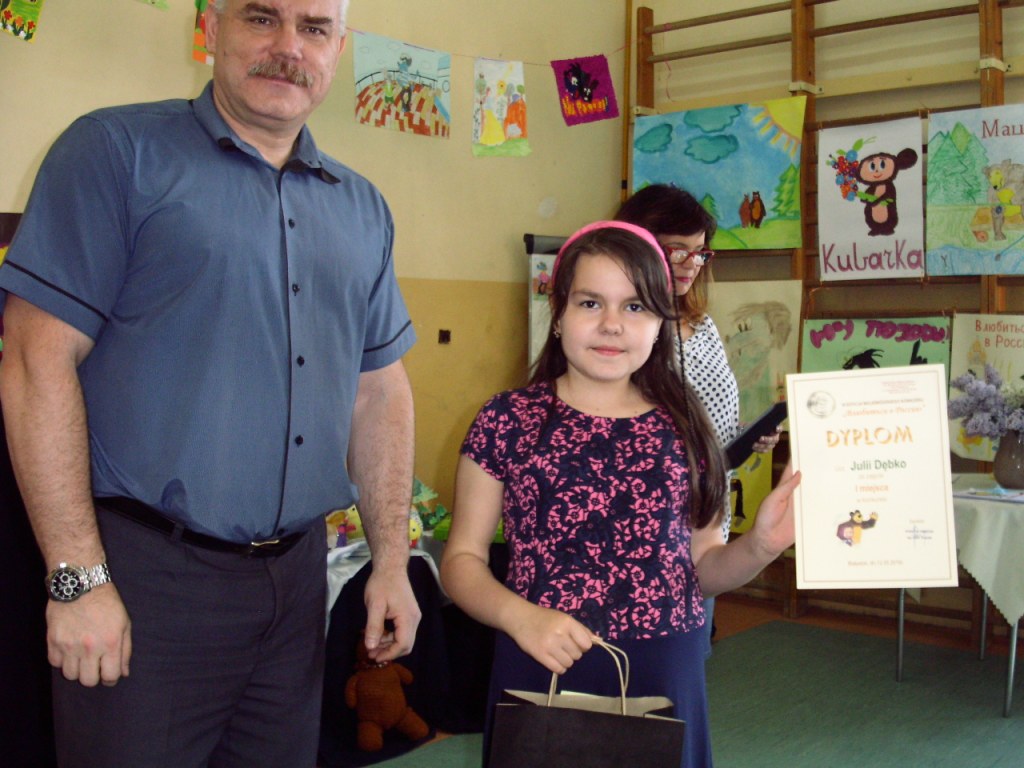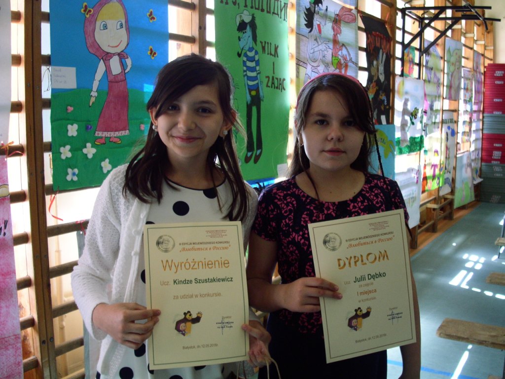 Uczniowie klas IV – VI naszej szkoły wzięli udział w III Wojewódzkim Konkursie Plastycznym ,,Zakochać się w Rosji”, którego tematem były rosyjskie bajki. Miło nam poinformować, że w w/w konkursie Julia Dębko uczennica kl IV a zajęła I miejsce w kategorii plakat, Kinga Szustakiewicz z kl V a otrzymała wyróżnienie. Wszystkim uczestnikom klas IV-VI bardzo dziękujemy za udział. Nagrodzonym gratulujemy i życzymy dalszych sukcesów.