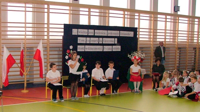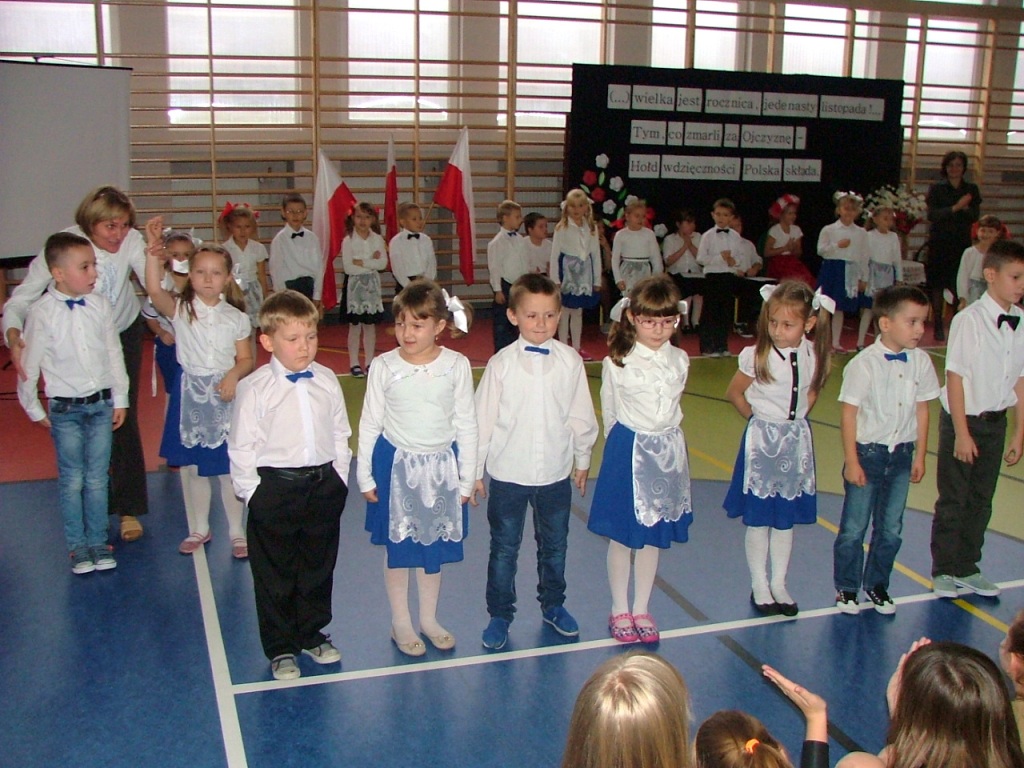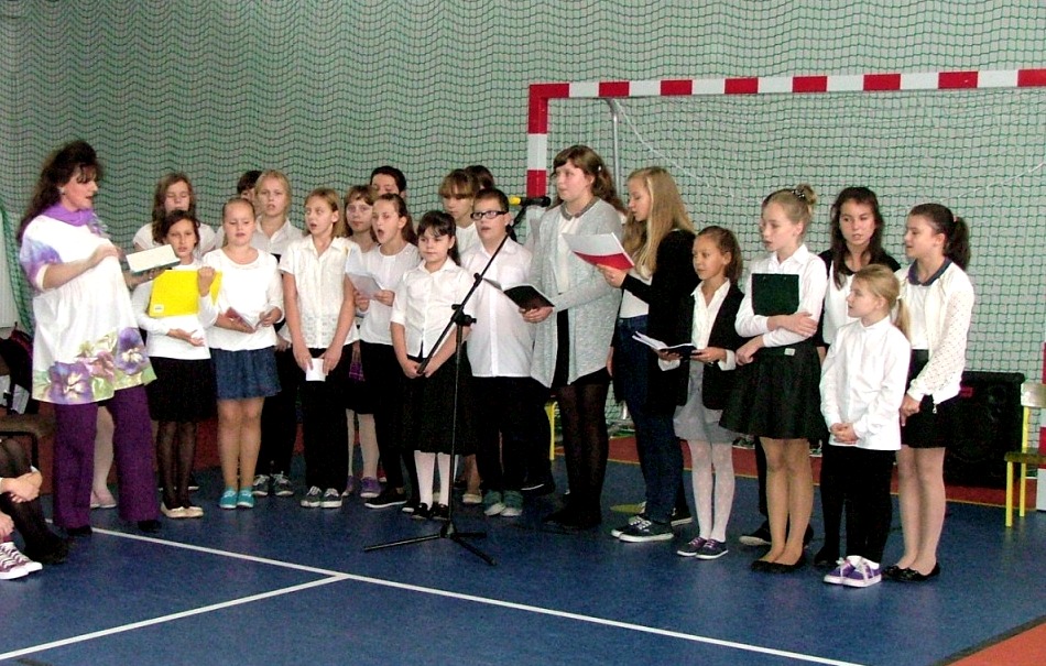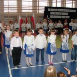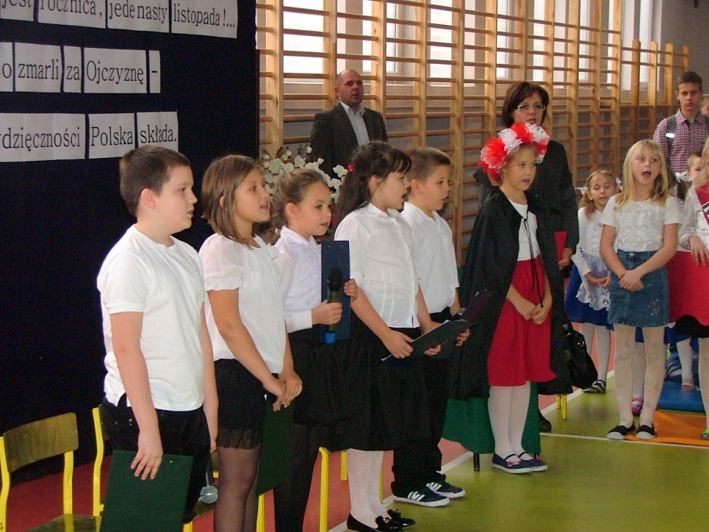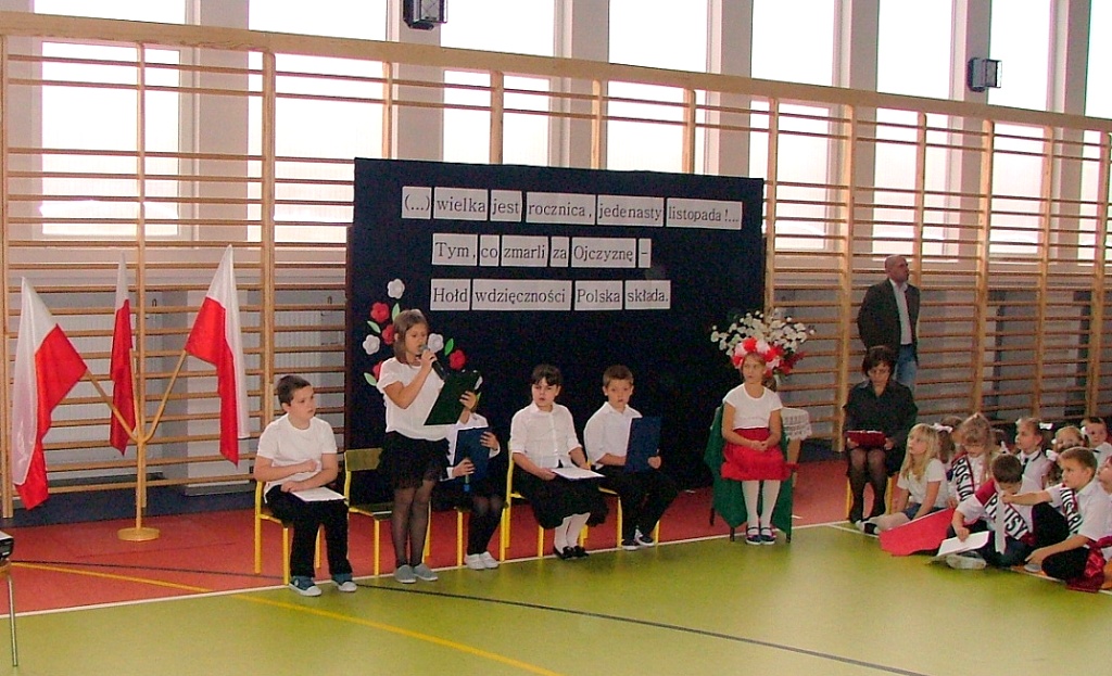 Dziś w naszej szkole odbyła się akademia z okazji Święta Odzyskania Niepodległości. Uroczystość przygotowali nauczyciele edukacji wczesnoszkolnej i świetlicy, przy współpracy z Zespołem Muzycznym. Tegoroczne spotkanie miało nietypowy przebieg: opierało się głównie na wspólnym śpiewaniu piosenek o charakterze patriotyczno – wojskowym, powstałych w okresie zdobywania niezawisłości państwowej. Wyświetlany na ekranie tekst pozwolił wszystkim uczestnikom akademii- nauczycielom, uczniom i licznie przybyłym rodzicom – razem wykonywać tak znane i lubiane utwory jak „Wojenko, wojenko”, „Przybyli ułani pod okienko”, „Rozkwitały pąki biały róż”, czy „My, pierwsza brygada”. Słowo wiążące między pieśniami oraz scenki dramowe przygotowały dzieci z klasy drugiej i trzeciej szkoły podstawowej. Na zakończenie pierwszaki wzruszyły i zachwyciły wszystkich wspaniałym wykonaniem krakowiaka – za ten taniec dostały burze gorących braw.