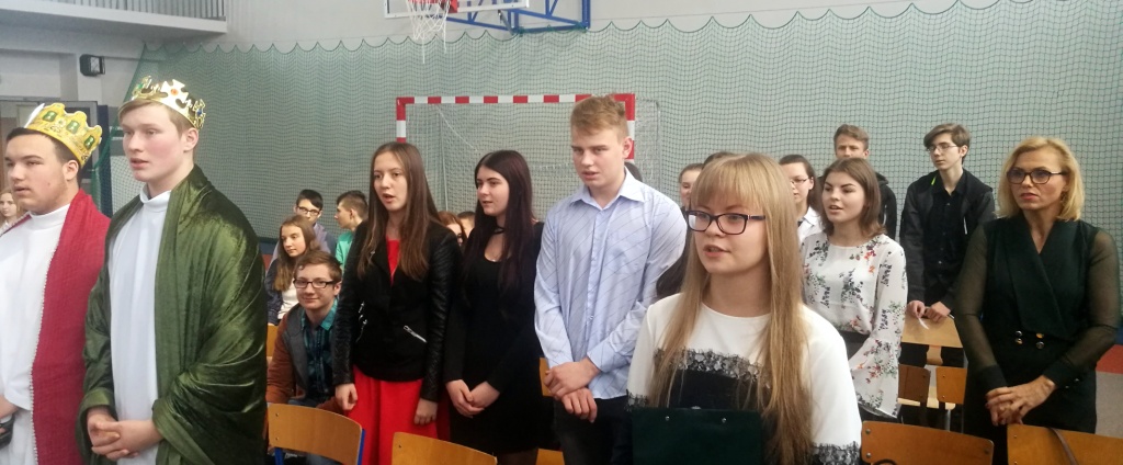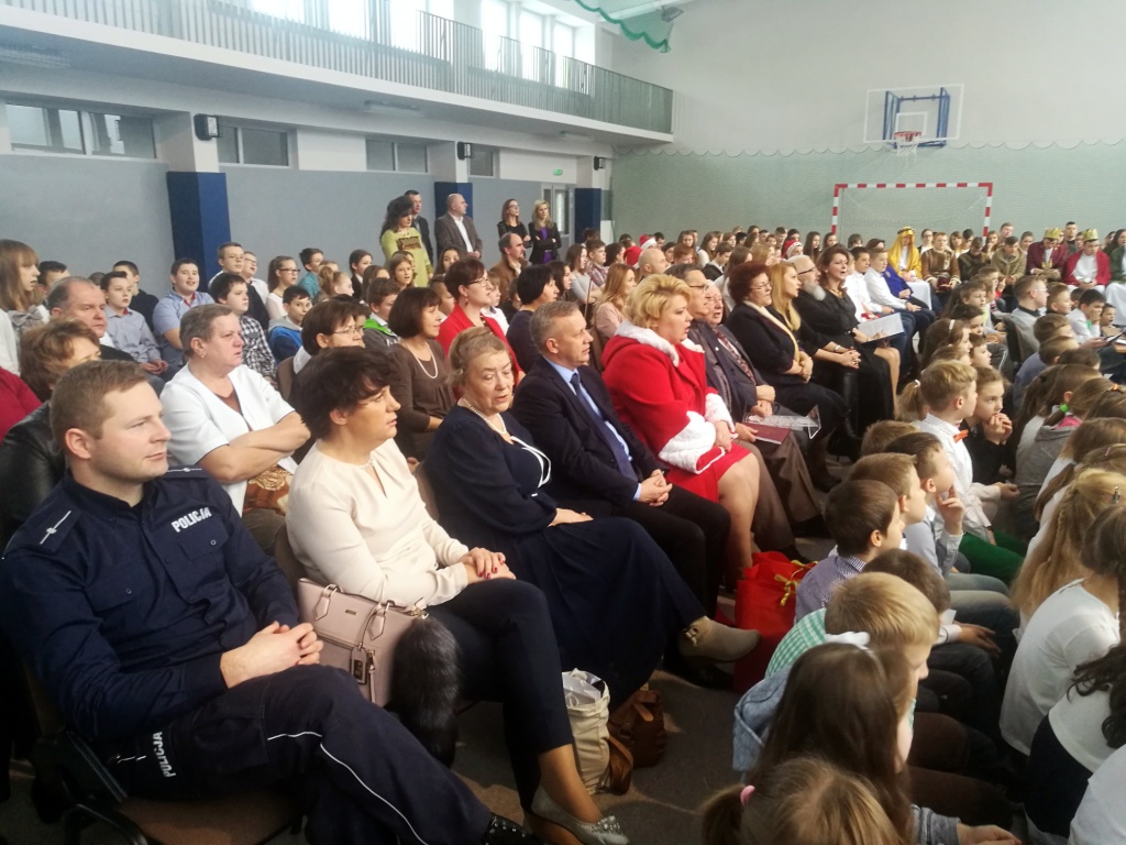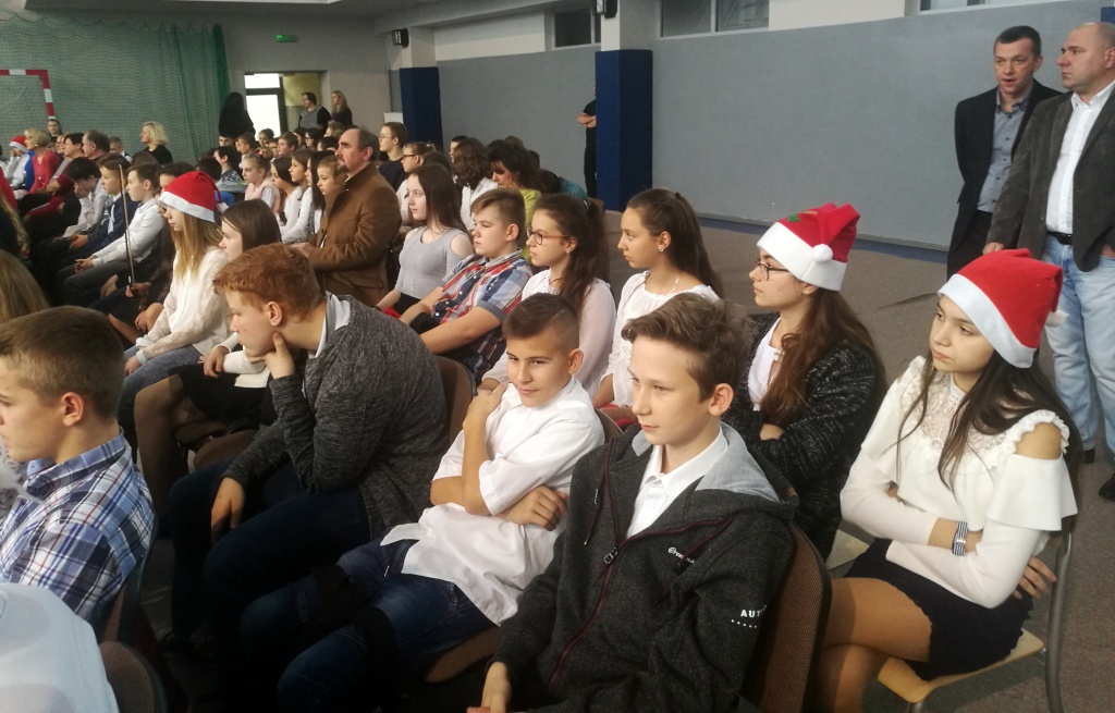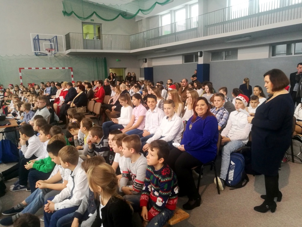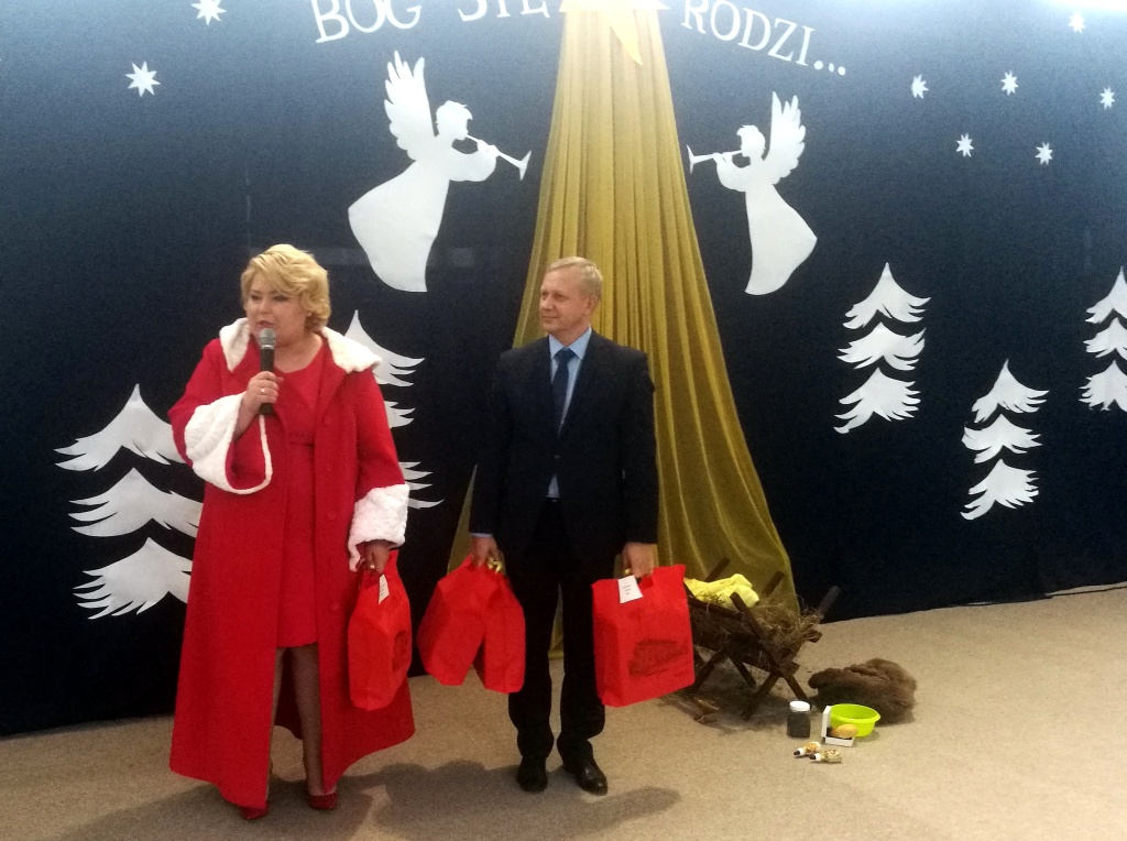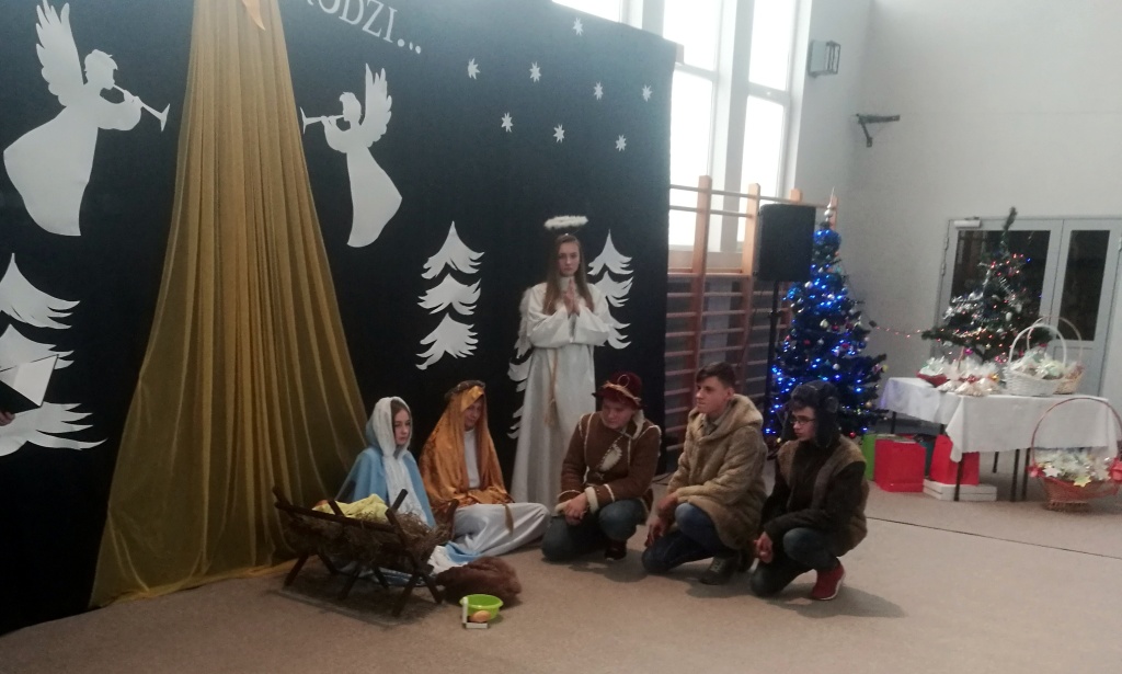 Dziś w naszej szkole odbyła się uroczystość Jasełek, połączona z opłatkowo-wigilijnym spotkaniem, organizowanym jak co roku przed Bożym Narodzeniem. Swoją obecnością zaszczycili nas: pani Burmistrz Sokółki Ewa Kulikowska i pan Burmistrz Adam Kowalczuk, pani Marta Półtorzycka z MOPS w Sokółce, dyrektor SOK pan Zbigniew Dębko, pani Maria Talarczyk z SFL, emerytowani nauczyciele naszej szkoły: p. Stanisław Omachel, p. Krystyna Czołpińska, p. Krystyna Biernacka, p. Katarzyna Olechno, panie Izabela Parchanowicz i Joanna Normantowicz z Rady Rodziców, ksiądz proboszcz Bogusław Urban. Nie zabrakło też pracowników dydaktycznych i administracyjnych, rodziców oraz dzieci i młodzieży naszej placówki. Jasełkowa inscenizacja, przygotowana przez uczniów szkoły podstawowej i gimnazjum pod okiem pani Małgorzaty Zieziula, wprowadziła wszystkich w świąteczny nastrój i przypomniała, jak ważny jest duchowy wymiar Bożego Narodzenia. Doskonale sprawdził się pomysł ze wspólnym kolędowaniem, bo i Jasełka zyskały na atrakcyjności, i wszyscy mogli poczuć się członkami jednej wspólnoty. Warto zaznaczyć, że wykonawcom towarzyszył akompaniament w wykonaniu ucznia kl. III b gimnazjum Mateusza Zalewskiego, grającego na keybordzie, a przy kolędzie „W żłobie leży” na skrzypcach grała też Julia Dębko z kl. 6 a. Miłym akcentem było rozstrzygnięcie konkursu na najładniejszą szopkę, w którym przyznano następujące nagrody: W kategorii gimnazjum – Weronika Doroszko i Wiktoria Żygieło z kl IIb, w kategorii szkoła podstawowa: I miejsce- Julia Taudul kl 7a, Aleksandra Jóźwik kl 3a, II miejsce – Karol Tomczak kl 2a, III miejsce – Emilia Niewiarowska, Iga Krawiel kl 3a, Natalia Bogusławska kl 4b, wyróżnienia – Agniszka Chłus kl 7a, Jakub Fiedorowicz kl 3a, Szymon Maliszewski i Kamil Matukiewicz kl 2a.