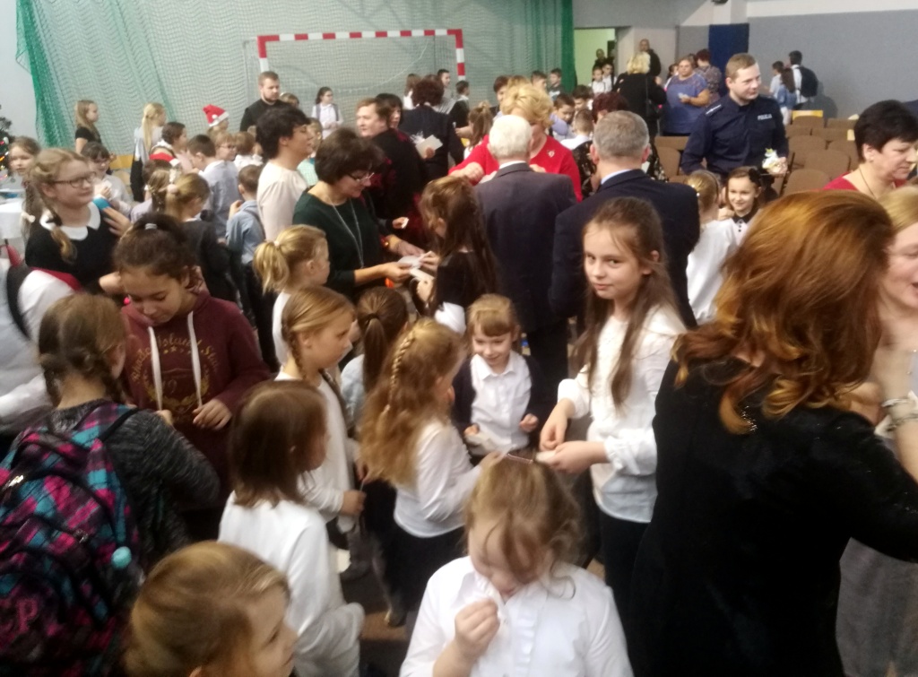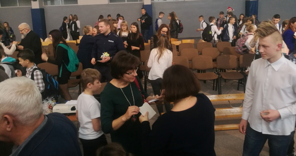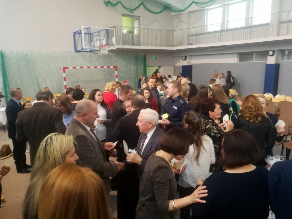 Wszyscy goście otrzymali w upominku słodkie pierniczki przygotowane przez uczniów Samorządu Szkolnego i ich opiekuna p. Katarzynę Chociej. Spotkanie zakończyło wspólne podzielenie się opłatkiem i złożenie świątecznych życzeń.