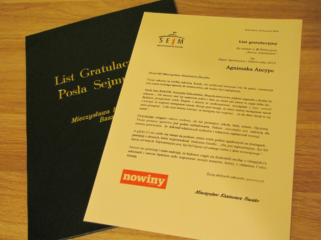Agnieszka Ancypo wyróżniona w plebiscycie ,,Talent Sportowy Roku 2015 Powiatu Sokólskiego”