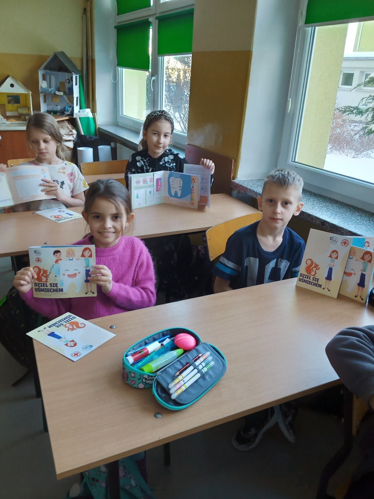 Klasy młodsze przystąpiły do programu „Dziel się uśmiechem”. Program ma na celu zachęcenie uczniów do dbania o zęby. Dzieci otrzymały książeczki, dzięki którym poznają budowę i funkcje zębów, a także nauczą się czterech prostych kroków dla zdrowych i czystych zębów, by zawsze mieć piękny uśmiech.