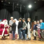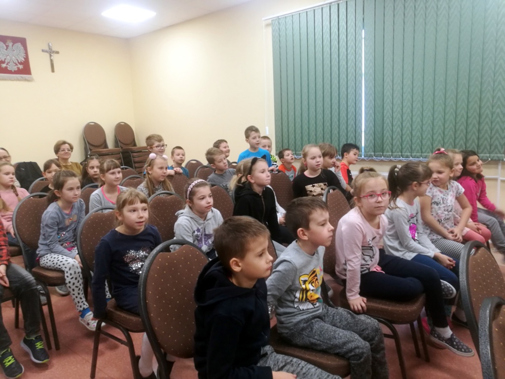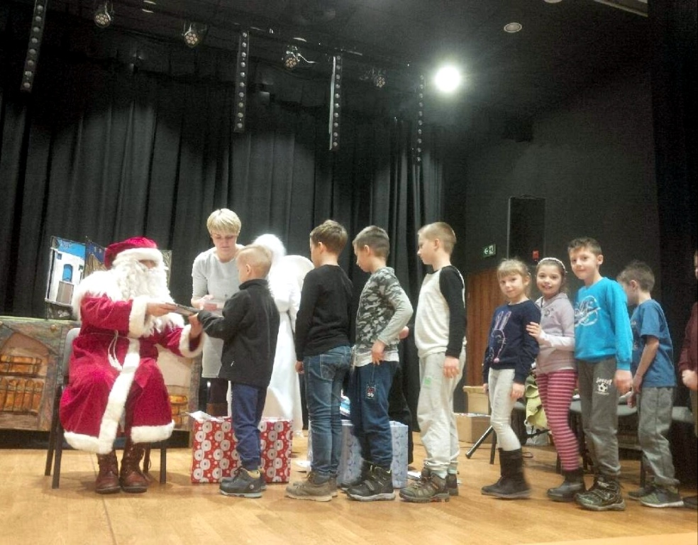 Aniołki Gloria i Gabryś przybliżyli tradycję kolędowania w naszej kulturze. Do udziału w spektaklu aktorzy zaprosili dzieci z widowni, które doskonale poradziły sobie z zadaniem aktorskim. Wspólnie zaśpiewano kilka kolęd, a na koniec Mikołaj wręczył uczestnikom spotkania książki oraz Dyplomy Czytelnika.
