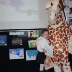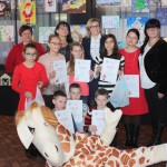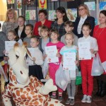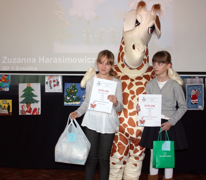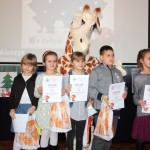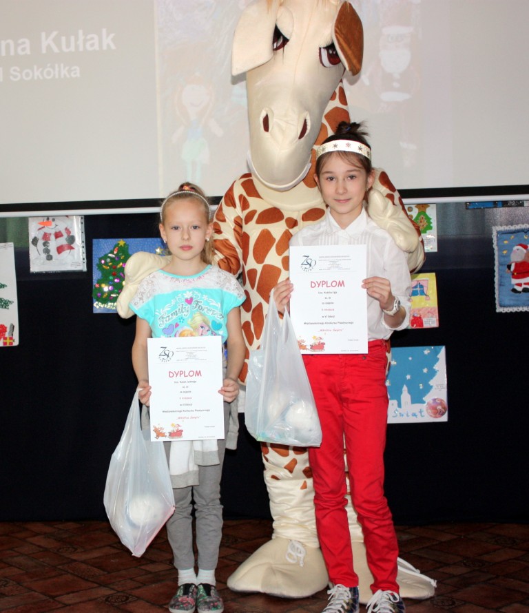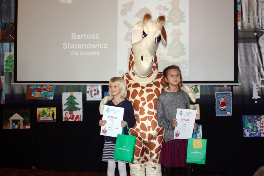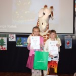 Miły zaskoczeniem dla wszystkich gości było przybycie żyrafki z Banku PKO BP – jednego z życzliwych sponsorów. Nasi uczniowie należą do SKO, dlatego też sympatyczna maskotka pomagała we wręczaniu dyplomów i nagród, zabawiała, a także pozowała z dziećmi do zdjęć. Pomysłodawczyni i główna organizatorka konkursu, pani Jolanta Paruk, już dziś zaprasza za rok i zachęca wszystkich uczniów do systematycznego rozwijania swoich zainteresowań artystycznych.