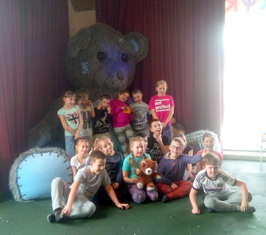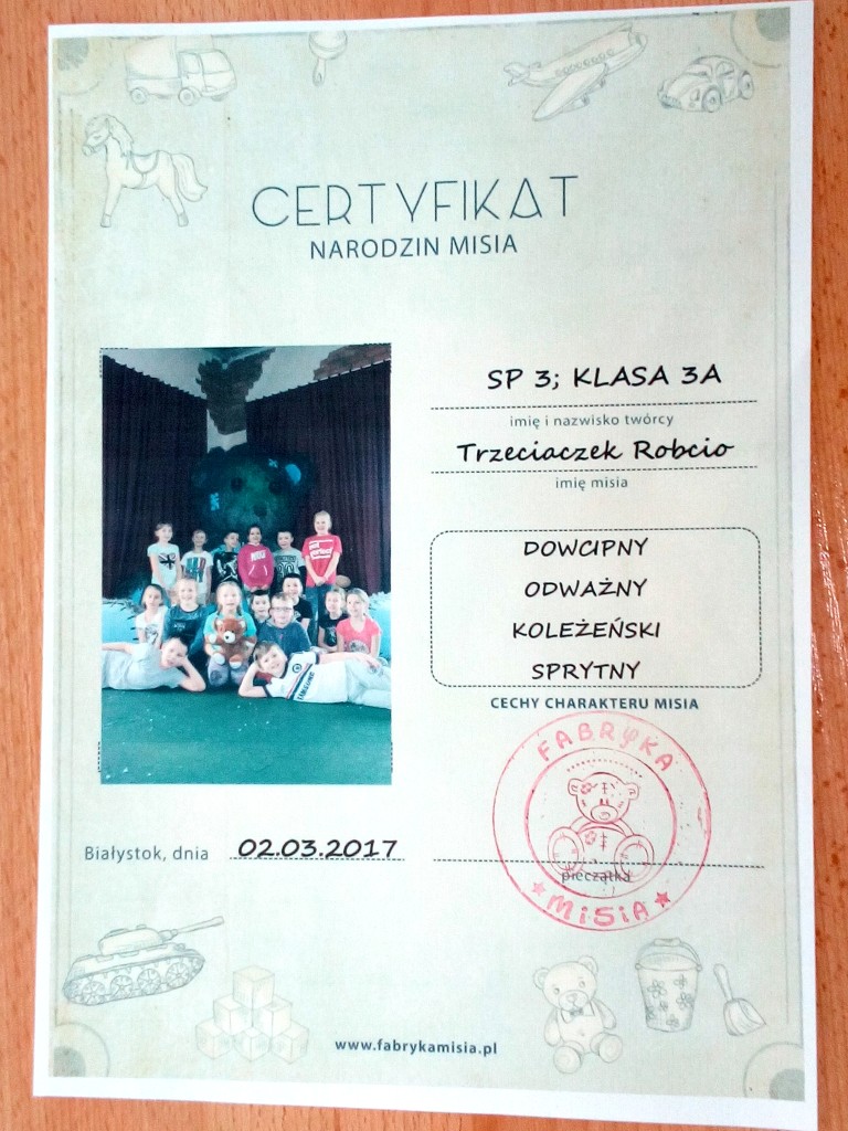 2 marca odbyliśmy tam wycieczkę. Najpierw korzystaliśmy ze zjeżdżalni, trampolin, toru przeszkód, interaktywnej podłogi. Potem udaliśmy się do manufaktury-fabryki, gdzie stworzyliśmy klasowego pluszaka. Po wysłuchaniu bajki o misiu Mądrusiu , nałożyliśmy kaski jak w prawdziwej fabryce i przystąpiliśmy do działania. Wybraliśmy futerko, serduszko i cechy charakteru naszego misia. Nazwaliśmy go Robcio Trzeciaczek. Na koniec otrzymaliśmy certyfikat stwierdzający, że nasz miś pojawił się na świecie.