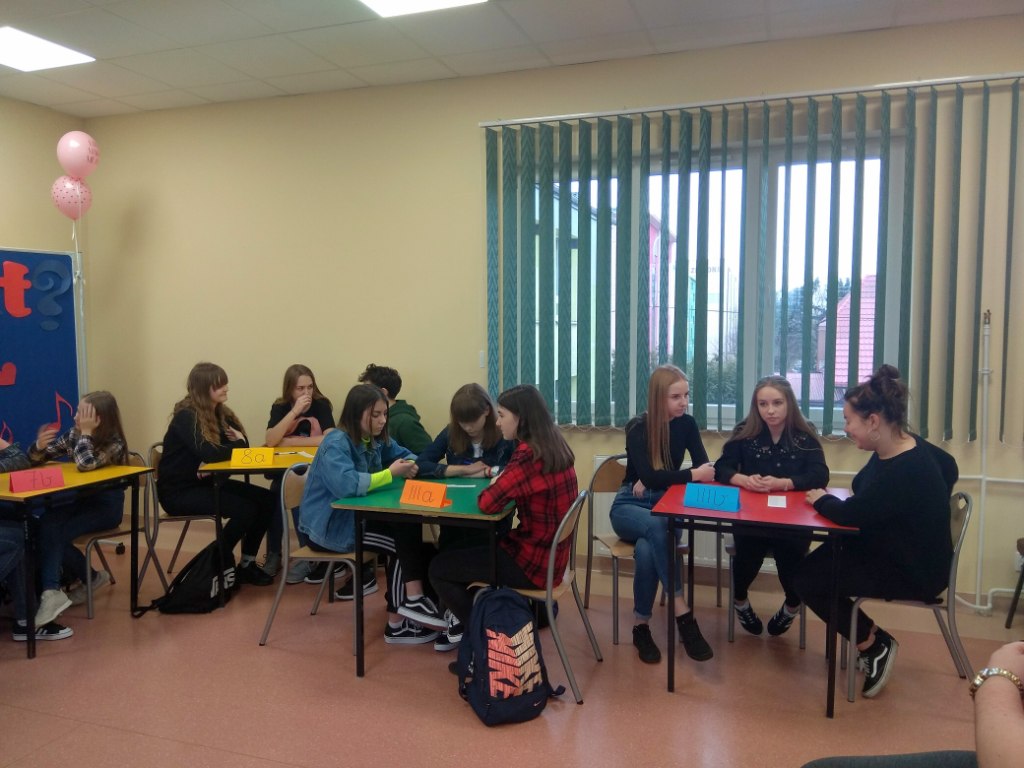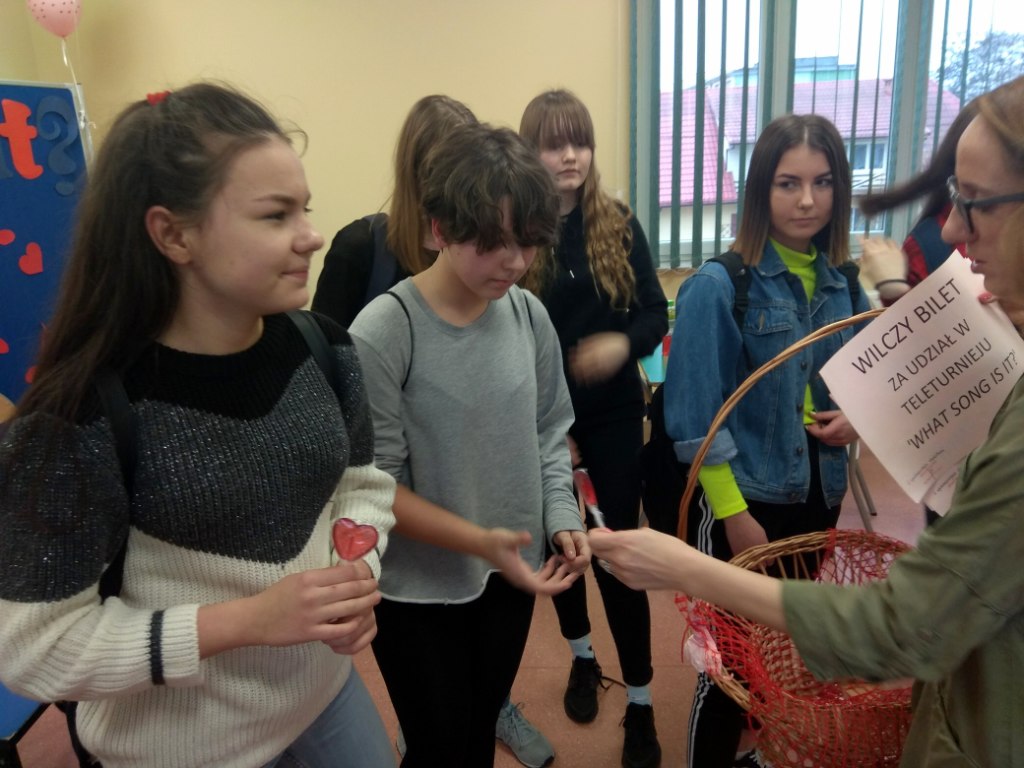 Jak co roku w naszej szkole z okazji Walentynek Samorząd Uczniowski zajął się tradycyjną pocztą walentynkową, która zawsze dostarcza uczniom wielu miłych wrażeń. Ponadto w dniu 15.02.2019 r. również w ramach Walentynek odbył się coroczny już VI teleturniej 'What song is it’ przygotowany przez nauczycieli języka angielskiego. Konkurs wzorowany na popularnym programie muzycznym „Jaka to melodia?” W tym roku w teleturnieju wzięli udział uczniowie klas VI, VII, VIII szkoły podstawowej oraz III gimnazjum. Po zaciętej rywalizacji zwyciężył zespół klasy III a gimnazjum w składzie: Agnieszka Ancypo, Zuzanna Woronowicz i Patrycja Szyszko. II miejsce zajął zespół klasy VIII a w składzie: Julia Sadowska, Oliwia Fiłoń i Maciej Trzasko a miejsce III zespół klasy VII a w składzie: Julia Dębko, Wiktoria Lisowska i Brajan Ignatowicz. Wszystkim uczestnikom dziękujemy za udział i świetną zabawę.