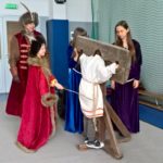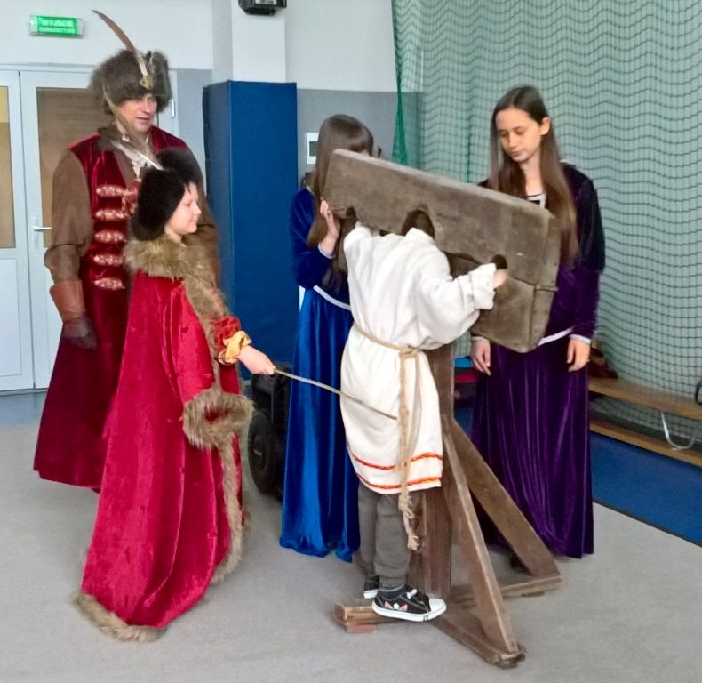 W dniu 27 kwietnia po raz gościliśmy w naszej szkole Grupę Rekonstrukcyjna Bractwa Rycerskiego z Golubia Dobrzynia. Tym razem widowisko historyczne dotyczyło stosunków społecznych w średniowiecznej Polsce. Chociaż temat był trudny jak dla tak młodych odbiorców, to jak zwykłe został przedstawiony w sposób niezwykle przystępnym i z przymrużeniem oka. Dzięki niezwykłym umiejętnościom gawędziarskim i poczuciu humoru osoby prowadzącej, nasi uczniowie przenieśli się w pradawne czasy, kiedy to chłopi ciężko pracowali w polu, oddawali daniny na rzecz pana, niepokornych zakuwano w dyby, rycerze dzielnie walczyli na wojnach, a król i możnowładcy zarządzali państwem. Spotkanie było fascynującą lekcją polskiej historii i bardzo się wszystkim podobało.