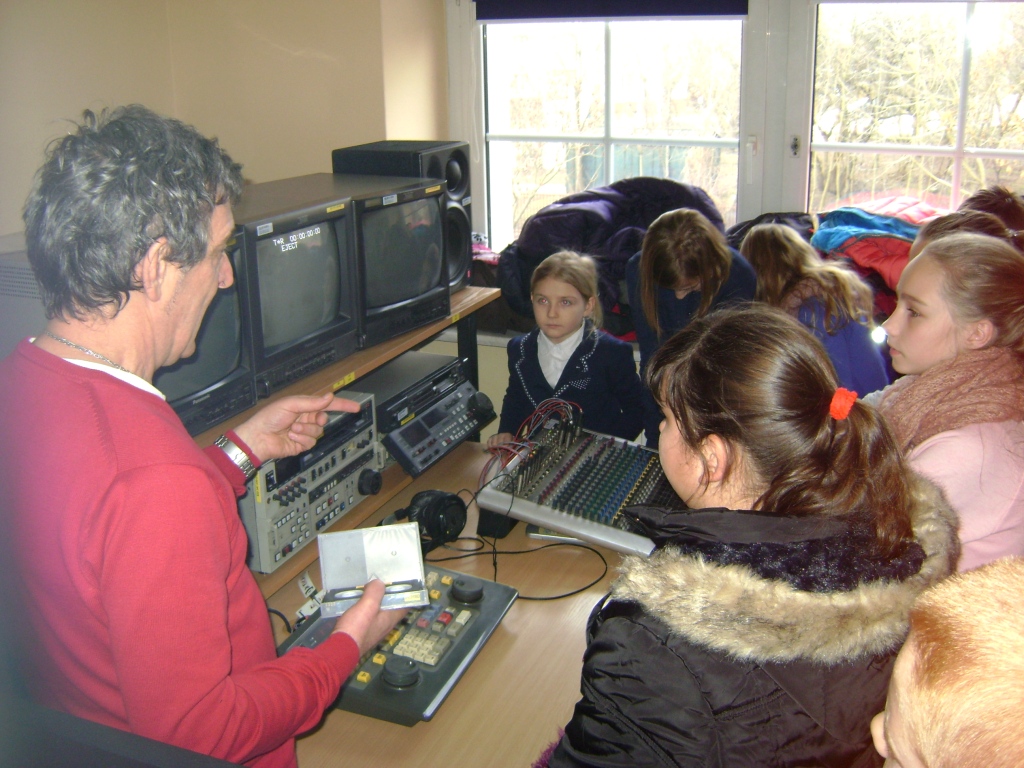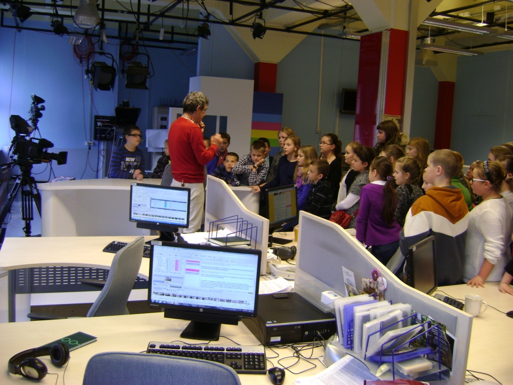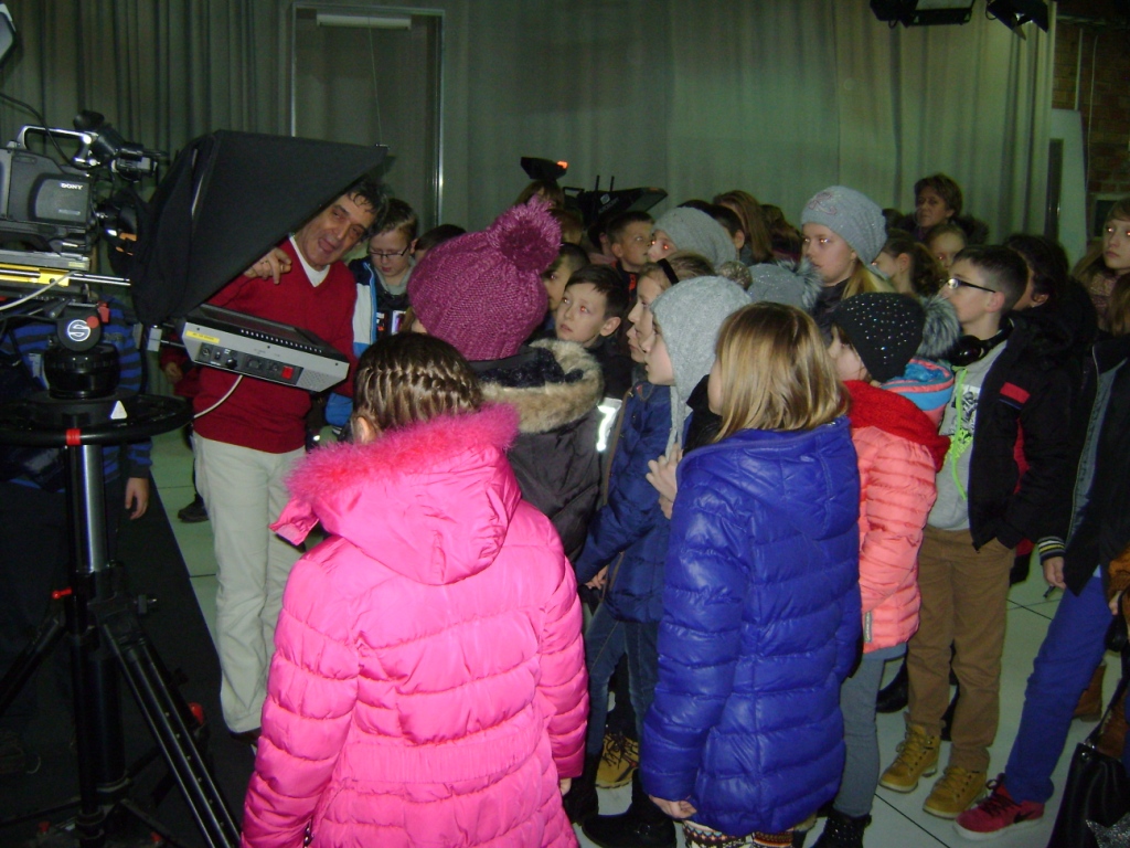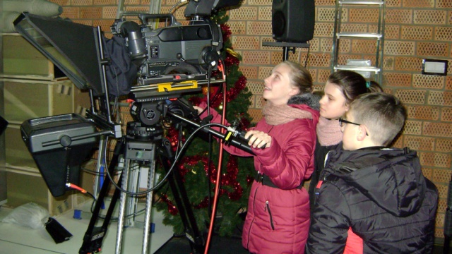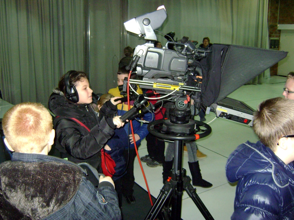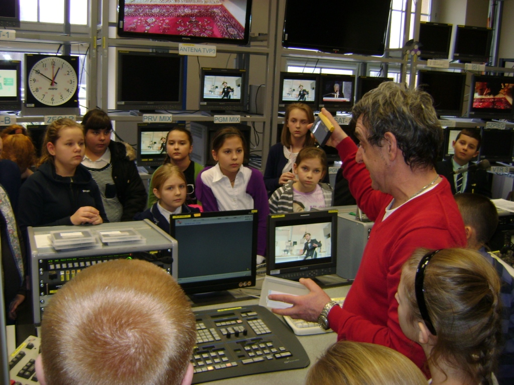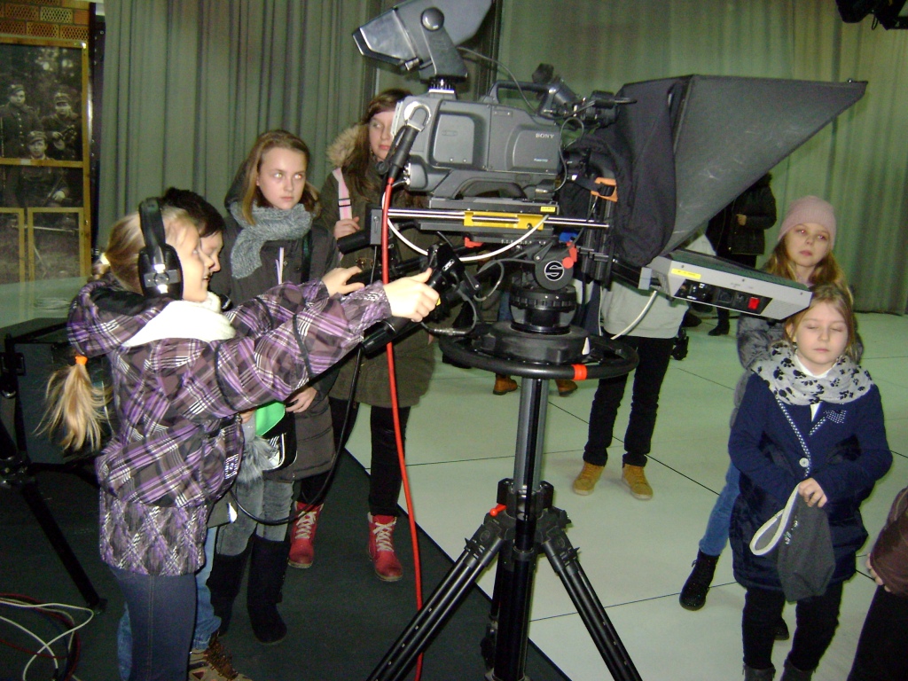Kolejny etap wycieczki to pobyt w OTV Białystok. Naszym wspaniałym przewodnikiem był pan Dariusz Szada – Borzyszkowski, który w 2014r. został uhonorowany specjalną nagrodą dla Dziennikarza Roku TVP Białystok. Wsłuchani w jego opowieści przez prawie dwie godziny zwiedzaliśmy kolejne pomieszczenia w TV. Dowiedzieliśmy się co ukryte jest w „skarbcu”, byliśmy świadkami nagrania zapowiedzi kulturalnych w regionie oraz przygotowań do wieczornego wydania „Obiektywu”. Odwiedziliśmy redakcje programów kresowych. Największą atrakcją była możliwość wcielenia się w rolę operatora dużej kamery telewizyjnej.