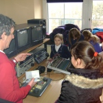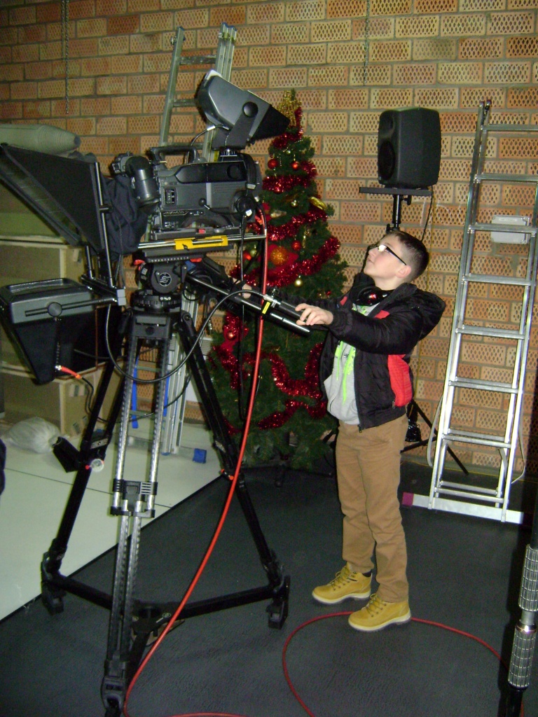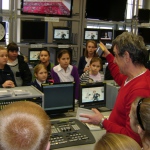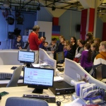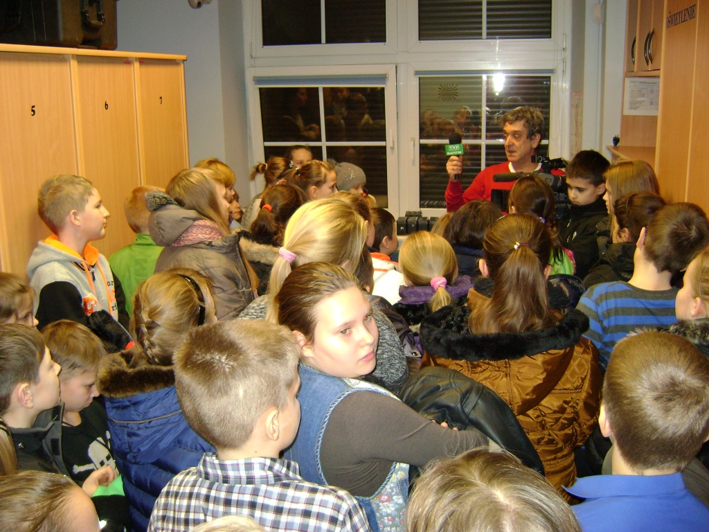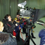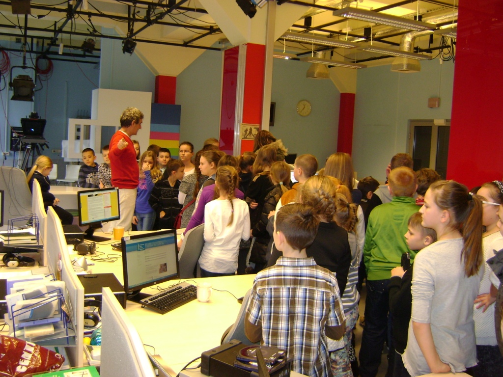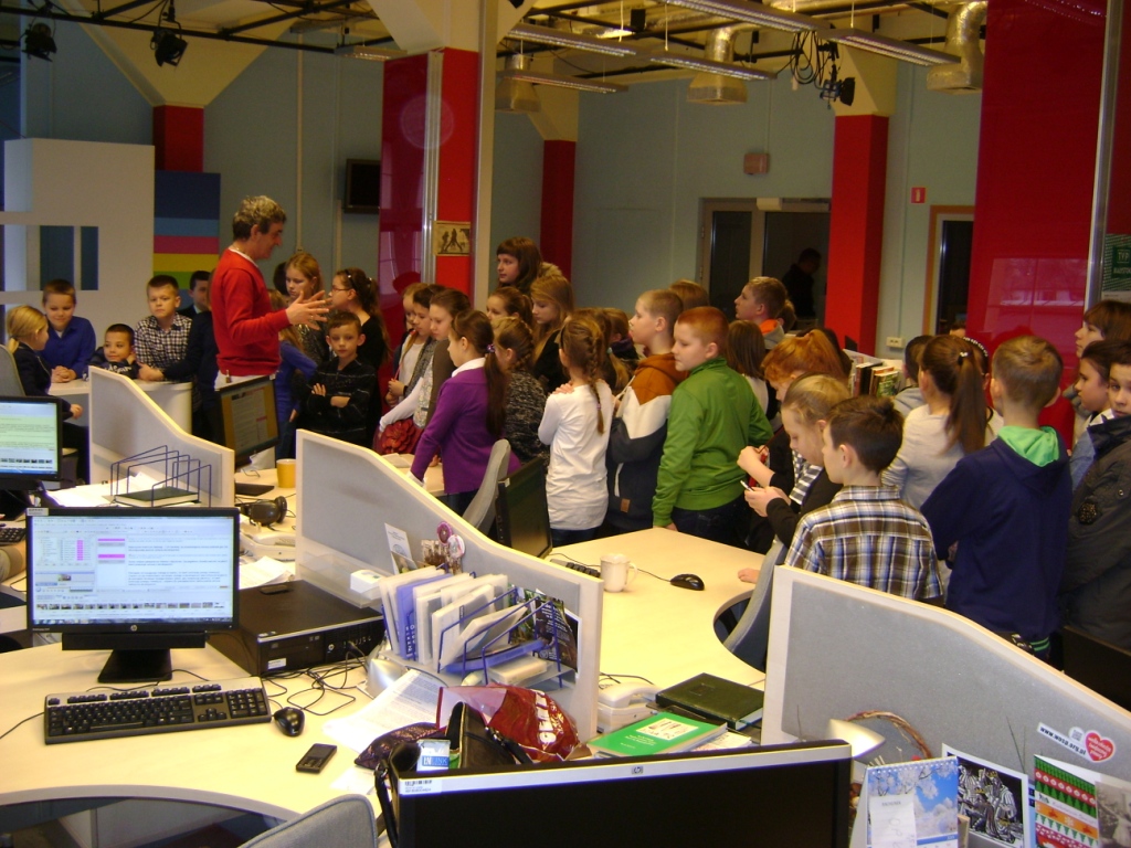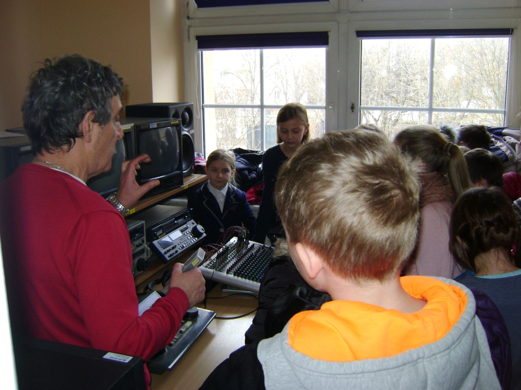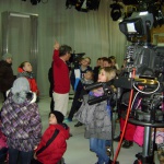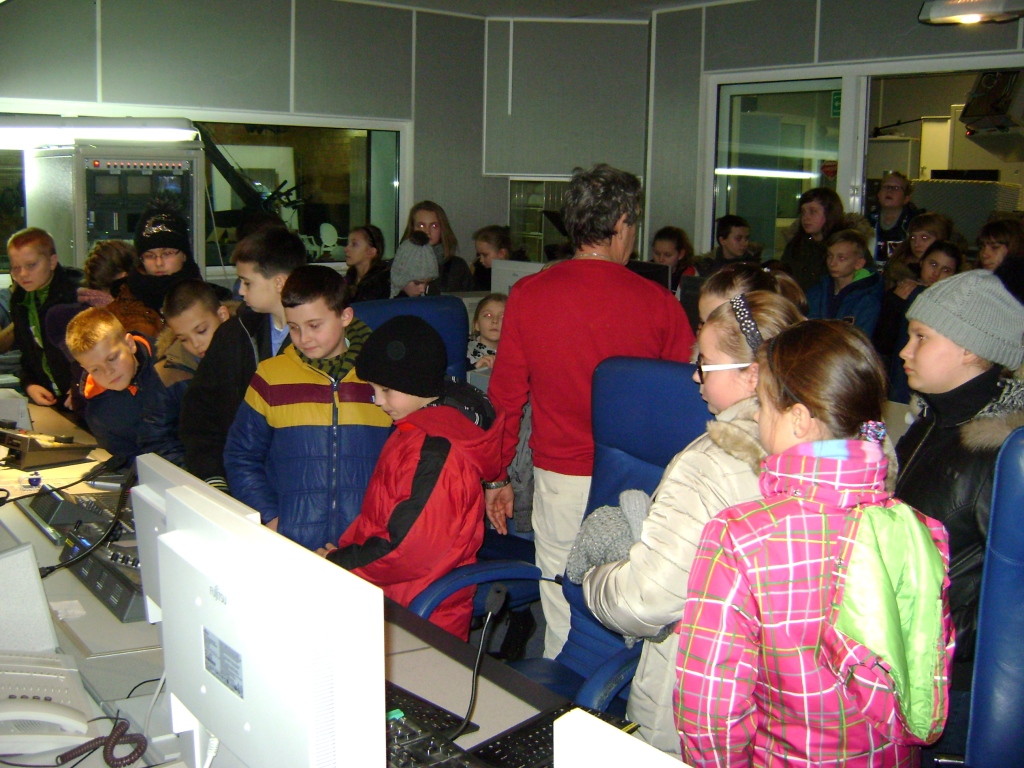 Kolejny etap wycieczki to pobyt w OTV Białystok. Naszym wspaniałym przewodnikiem był pan Dariusz Szada – Borzyszkowski, który w 2014r. został uhonorowany specjalną nagrodą dla Dziennikarza Roku TVP Białystok. Wsłuchani w jego opowieści przez prawie dwie godziny zwiedzaliśmy kolejne pomieszczenia w TV. Dowiedzieliśmy się co ukryte jest w „skarbcu”, byliśmy świadkami nagrania zapowiedzi kulturalnych w regionie oraz przygotowań do wieczornego wydania „Obiektywu”. Odwiedziliśmy redakcje programów kresowych. Największą atrakcją była możliwość wcielenia się w rolę operatora dużej kamery telewizyjnej.