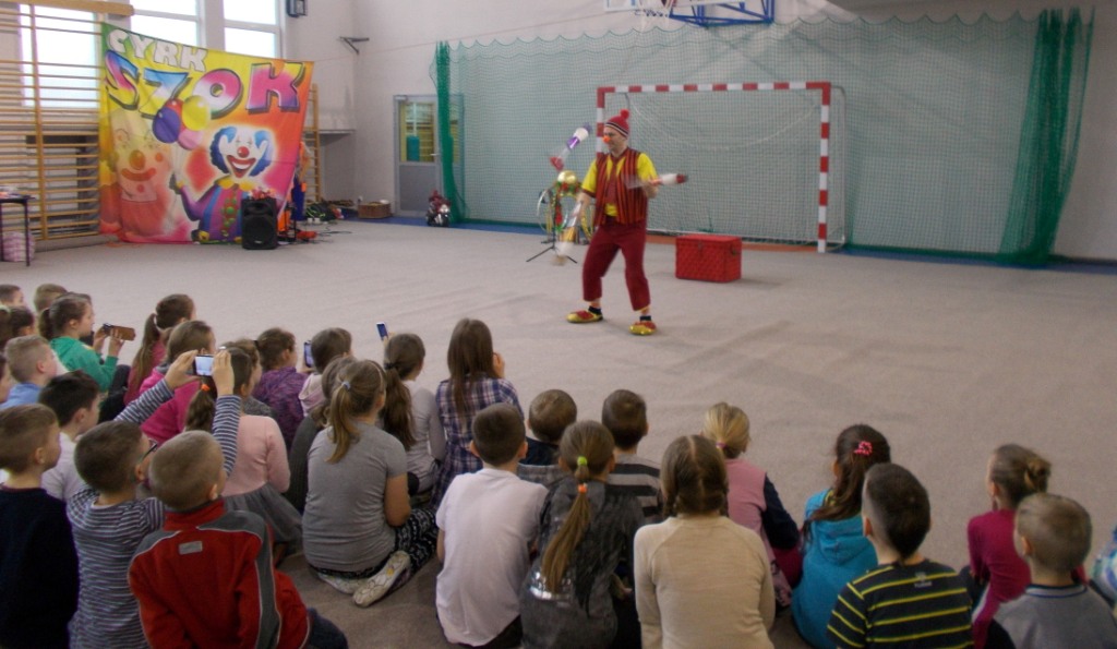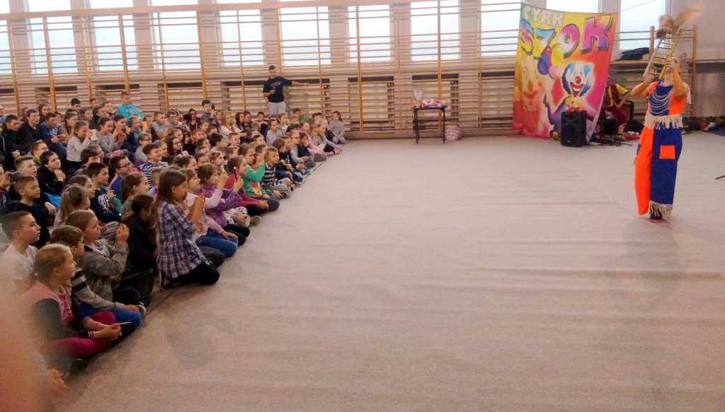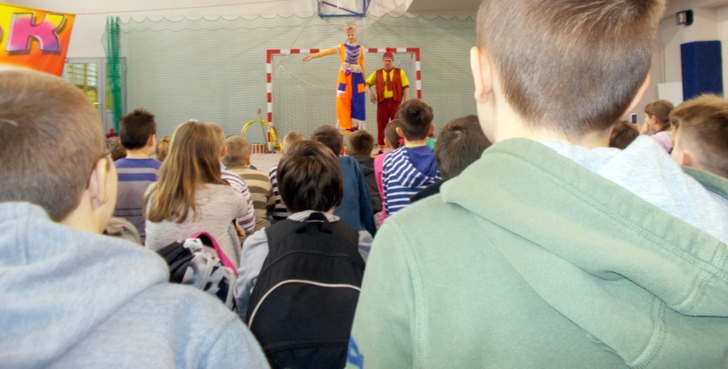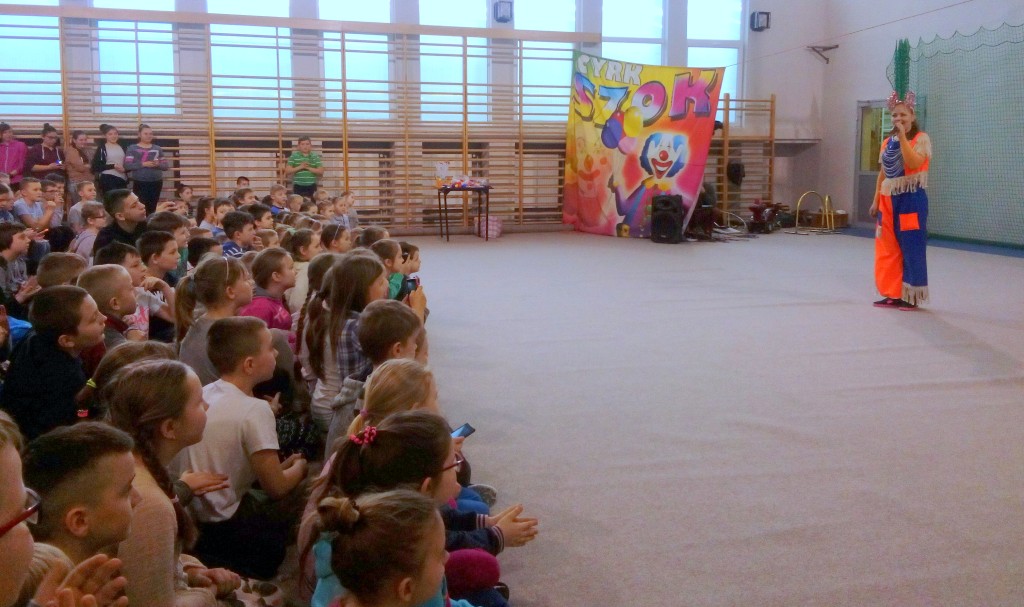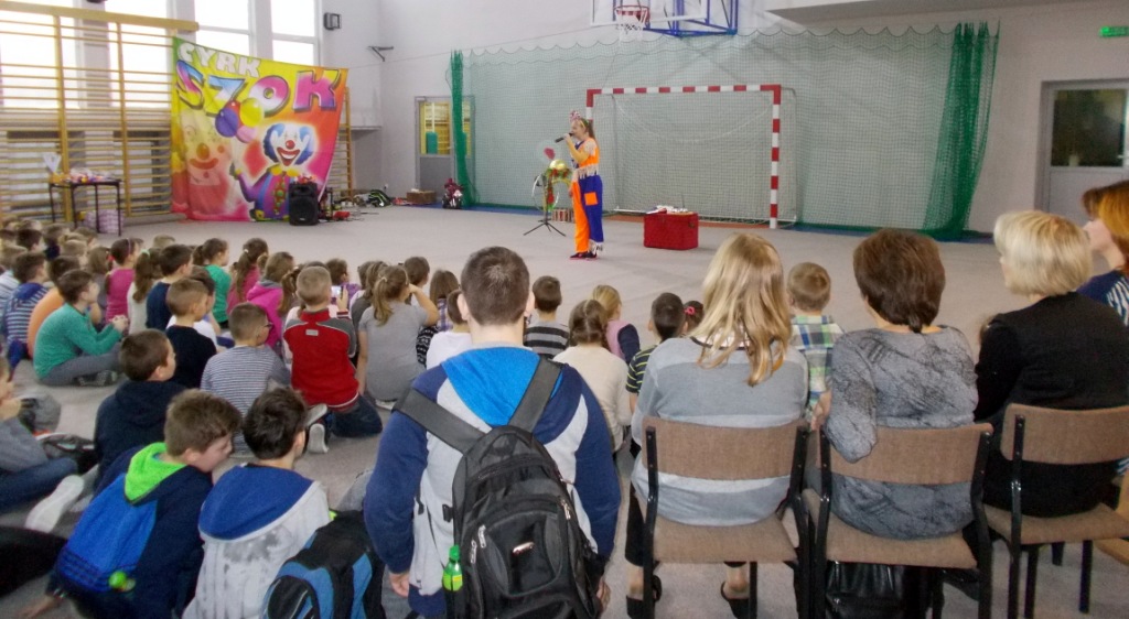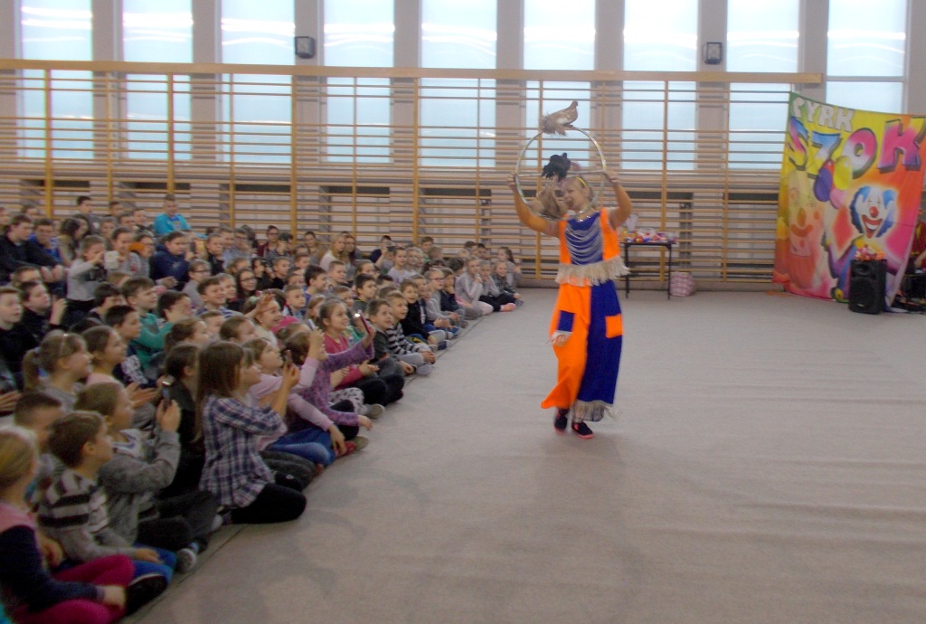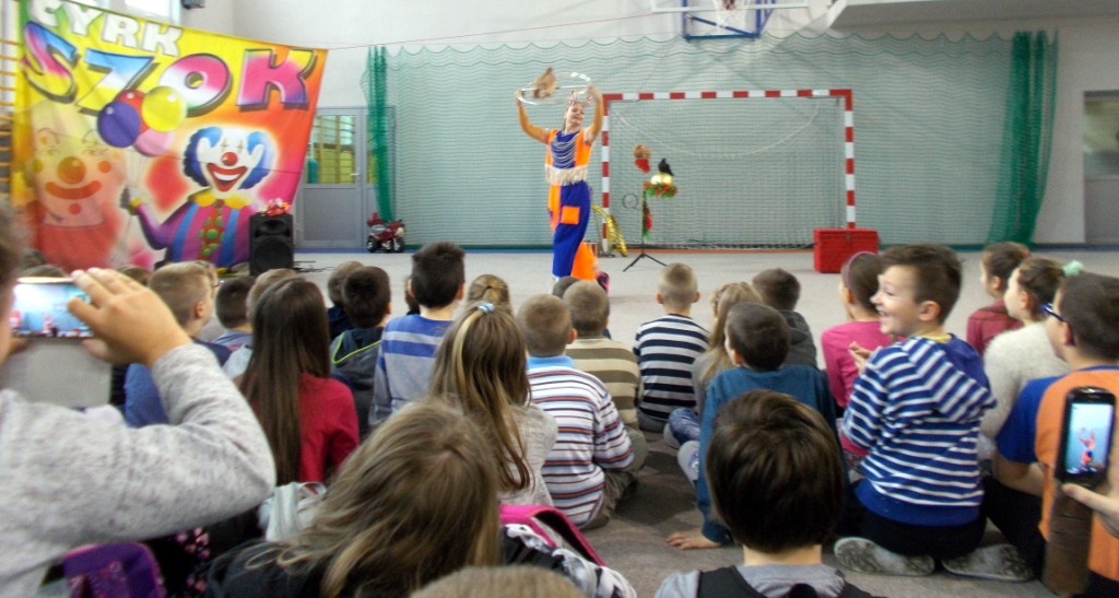 Dziś do naszej szkoły zawitał ukraiński cyrk „Szok”, zajmujący się już od piętnastu lat organizowaniem przedstawień cyrkowych dla dzieci i dorosłych. Ten cyrk różni się od innych tym, że nie przyjeżdża do miasta i nie rozkłada namiotu, tylko pojawia się dowolnym miejscu i czasie, tak jak dziś u nas. Występujący artyści – absolwenci szkół cyrkowych i laureaci wielu festiwali – nawiązali z publicznością bardzo dobrą relację, trafiając w gust i zapewniając doskonałą rozrywkę. Uczniom najbardziej podobały się zwierzęta: wąż, gołębie oraz psy. Dzieci były zadowolone nie tylko z popisów cyrkowców, ale też z faktu, że próbowały swych talentów, włączając się czynnie do zabawy. Śmiechu było co niemiara. Umiejętności cyrkowców wszystkim bardzo się podobały i zostały nagrodzone burzliwymi oklaskami.